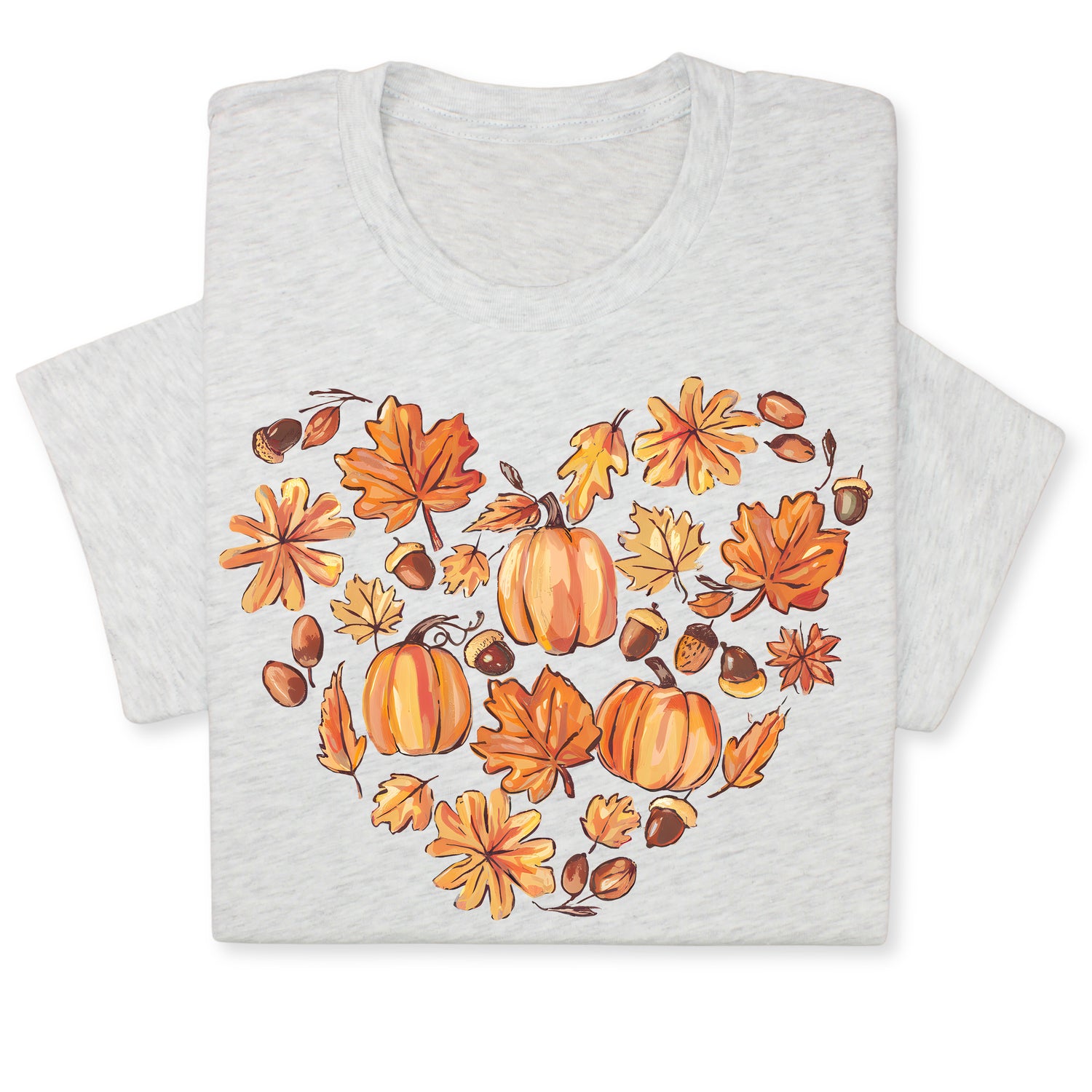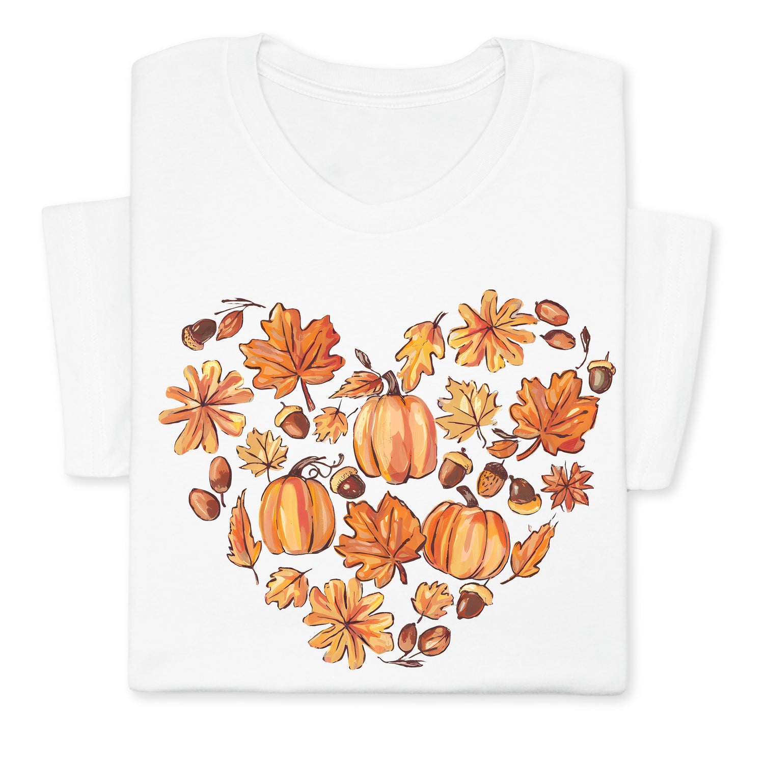 Wrap yourself in cozy fall vibes with this charming t-shirt featuring a heart-shaped design made of pumpkins, autumn leaves, and acorns. A sweet and seasonal way to celebrate your love for fall!
