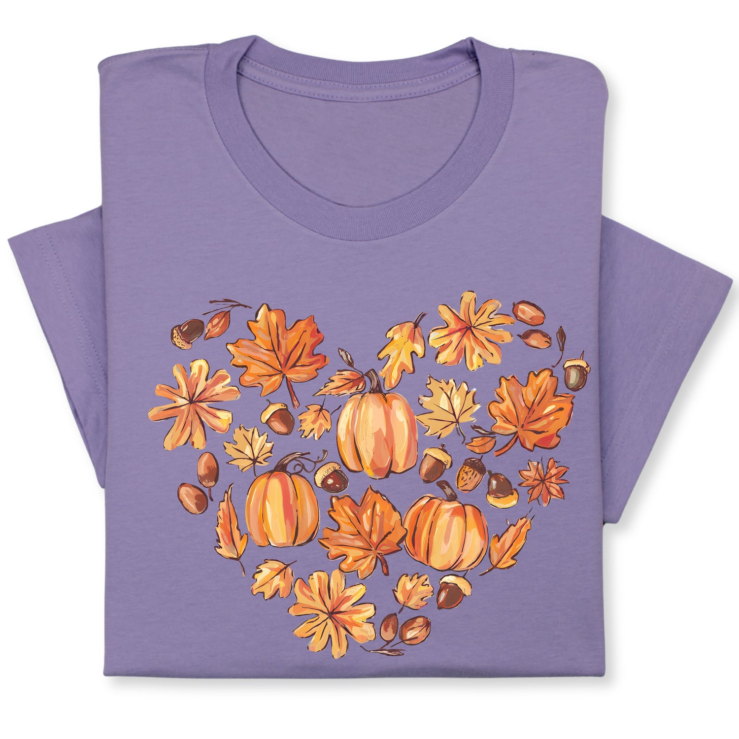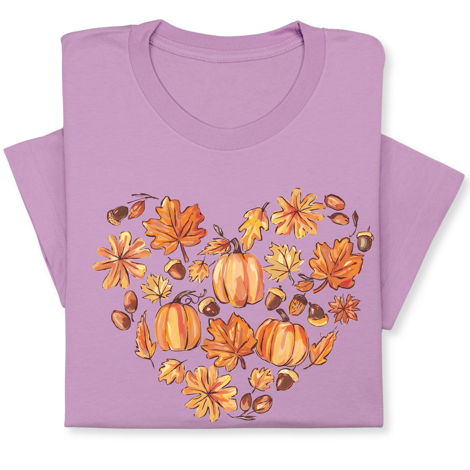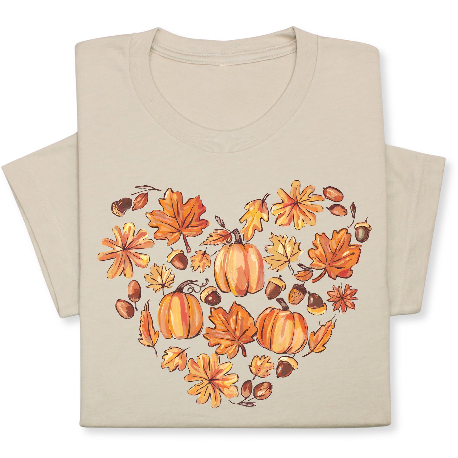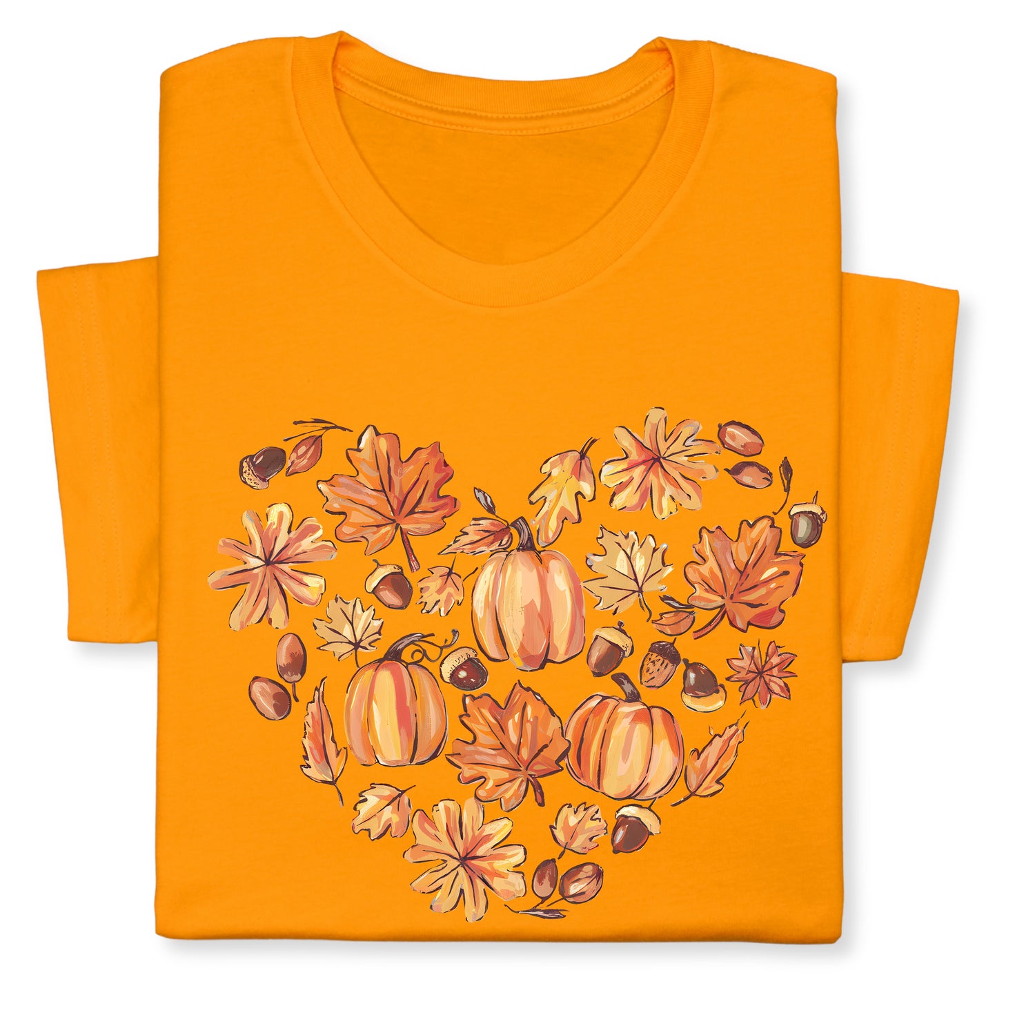 Autumn Heart T-Shirt – Fall Pumpkins & Leaves Design, Thanksgiving Tee, Nature-Inspired Fall Gift Shirt for Her