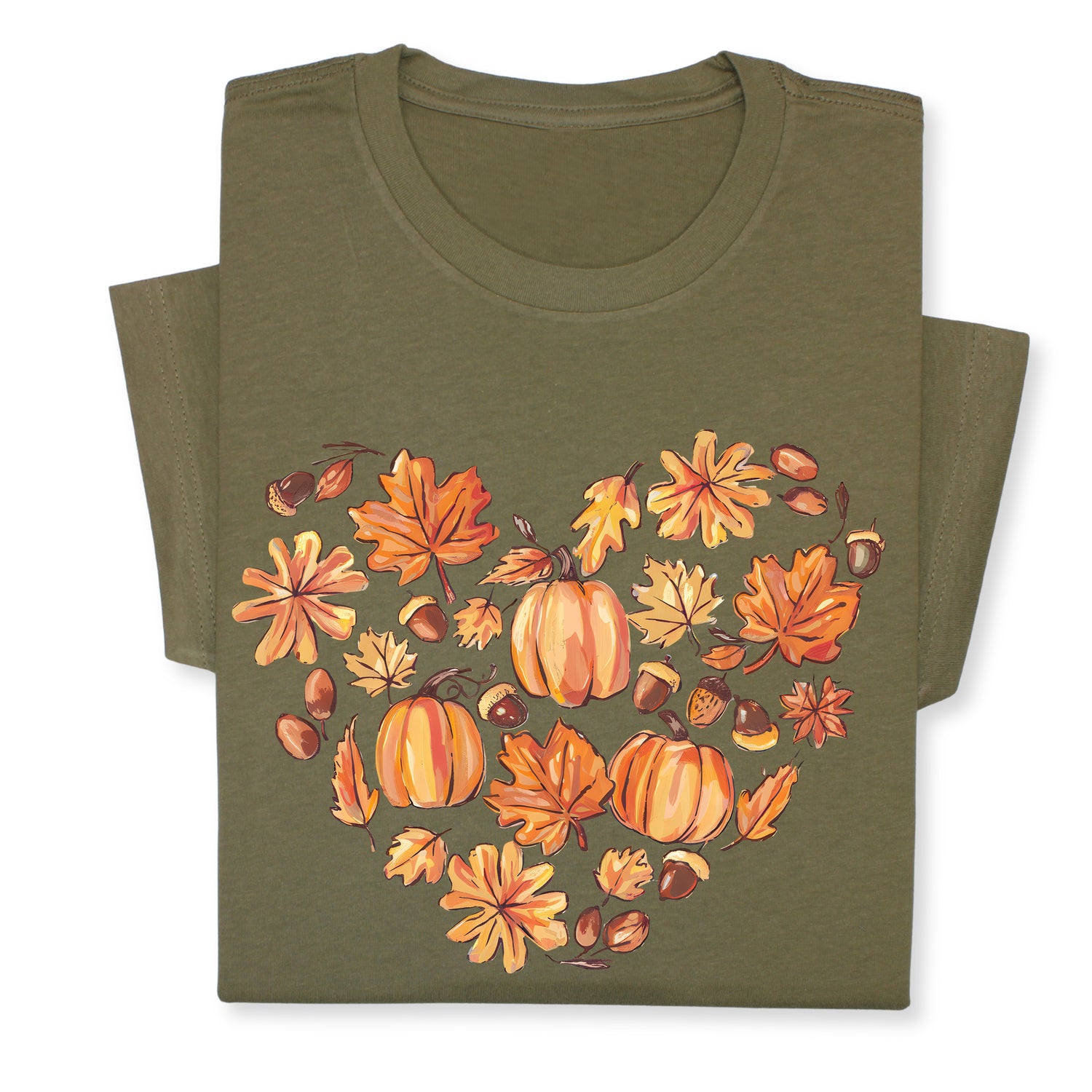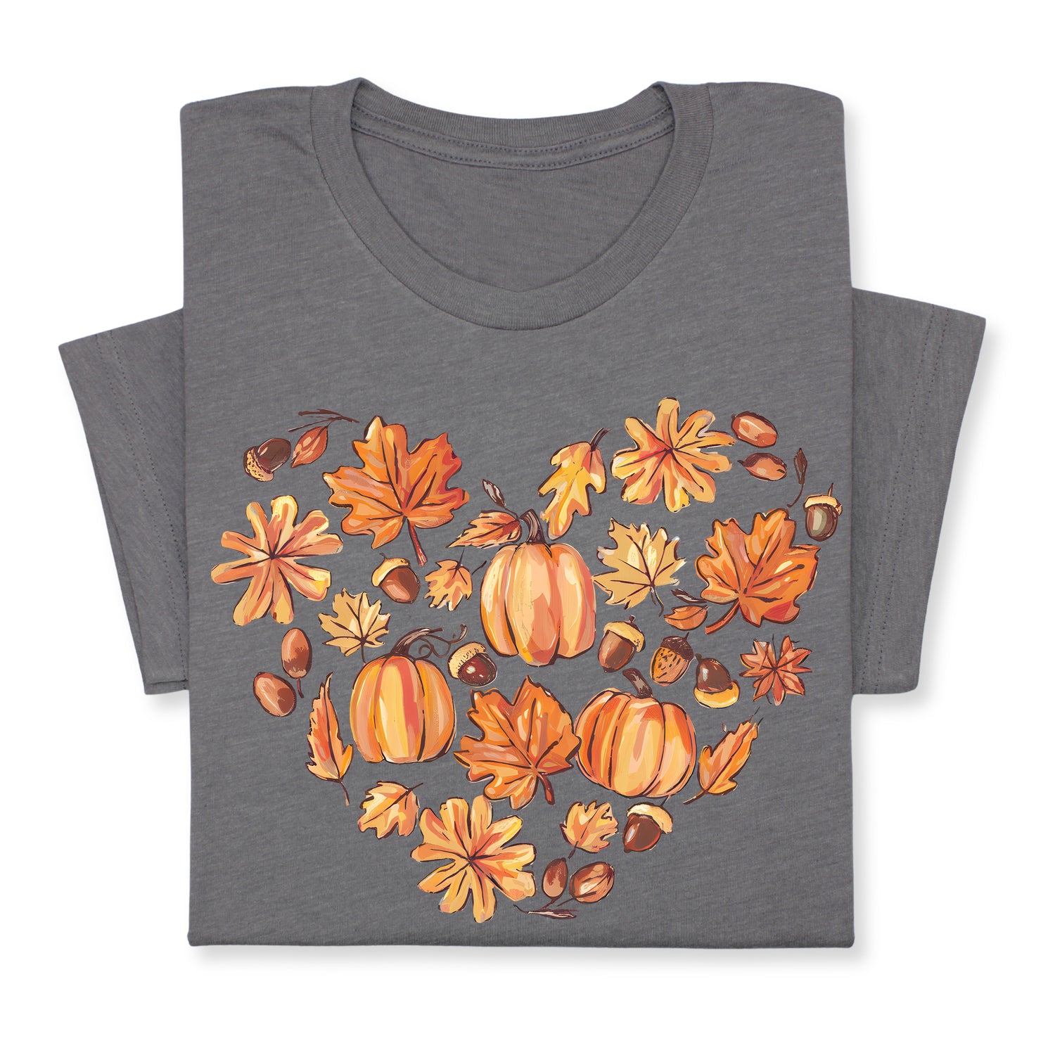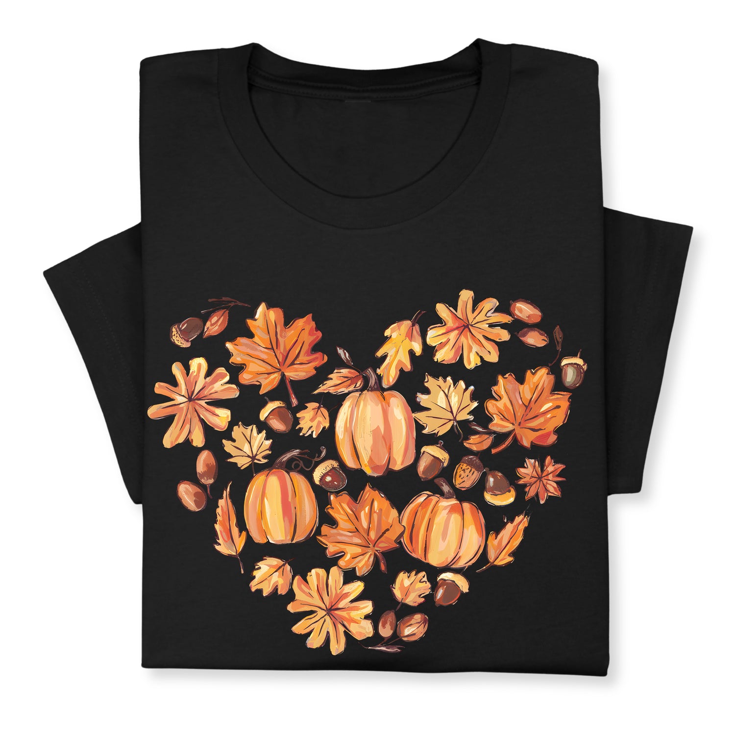 Autumn Heart T-Shirt – Fall Pumpkins & Leaves Design, Thanksgiving Tee, Nature-Inspired Fall Gift Shirt for Her