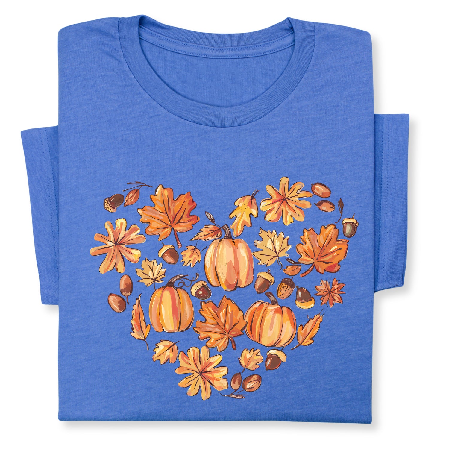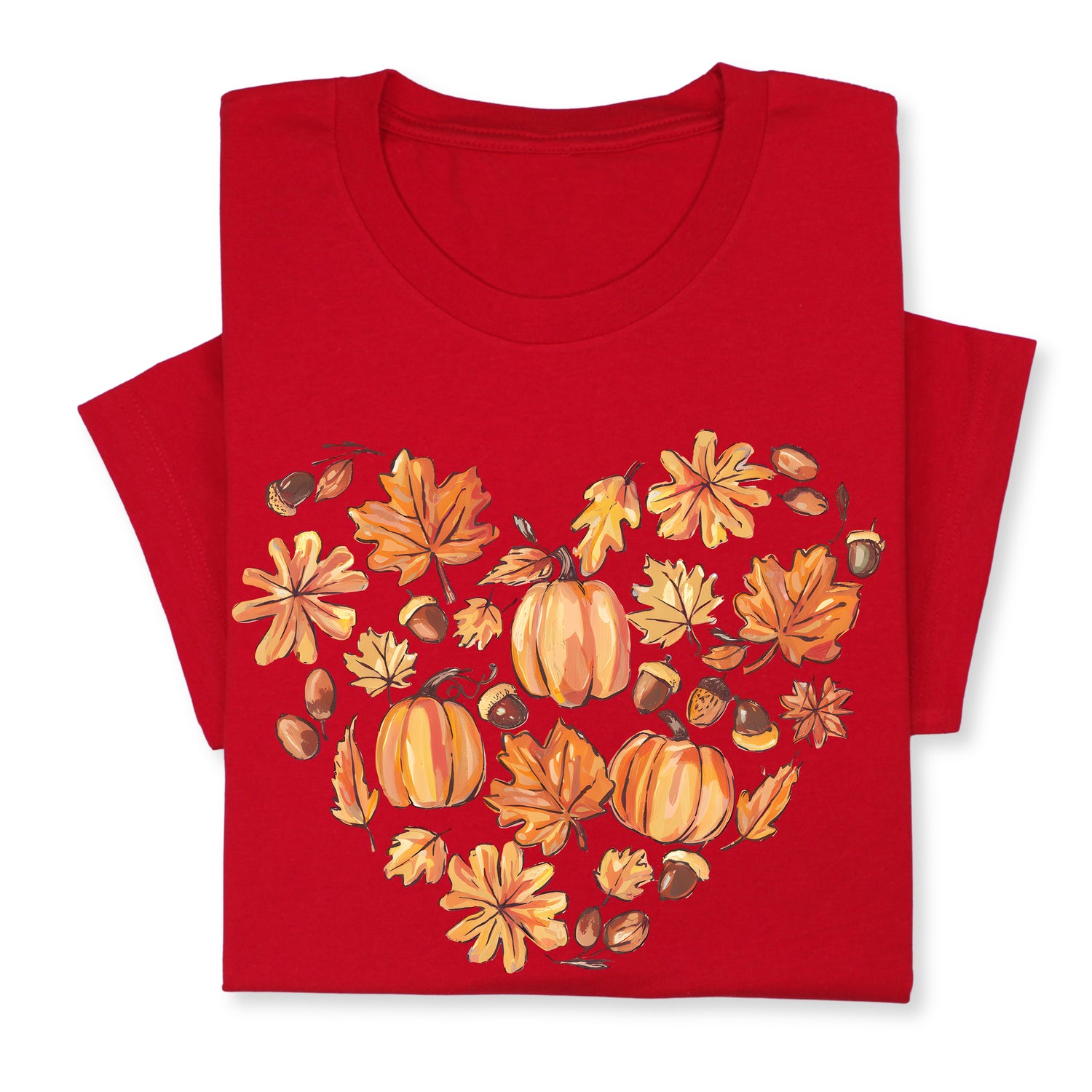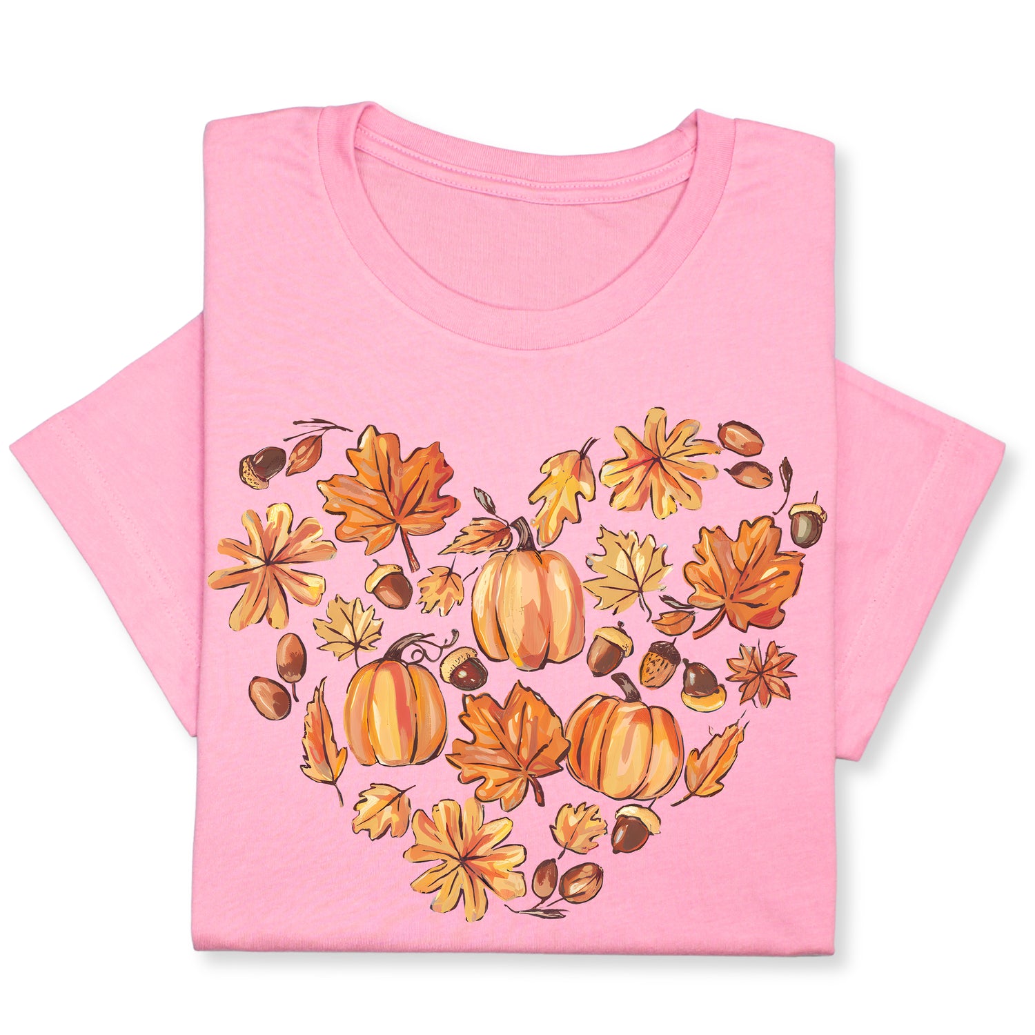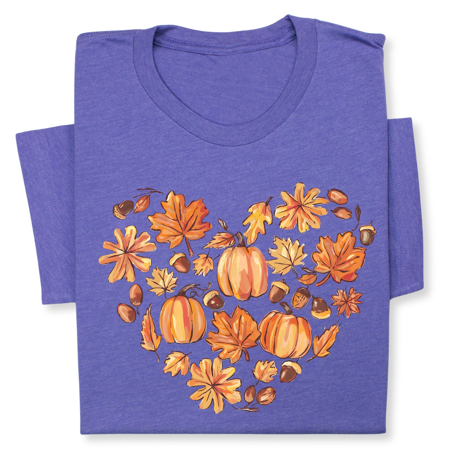 Autumn Heart T-Shirt – Fall Pumpkins & Leaves Design, Thanksgiving Tee, Nature-Inspired Fall Gift Shirt for Her