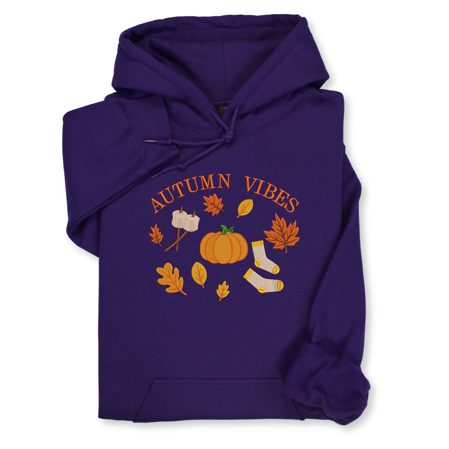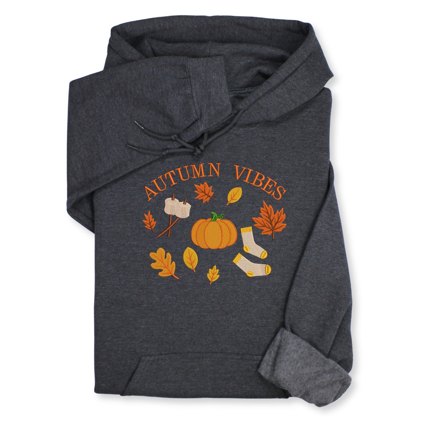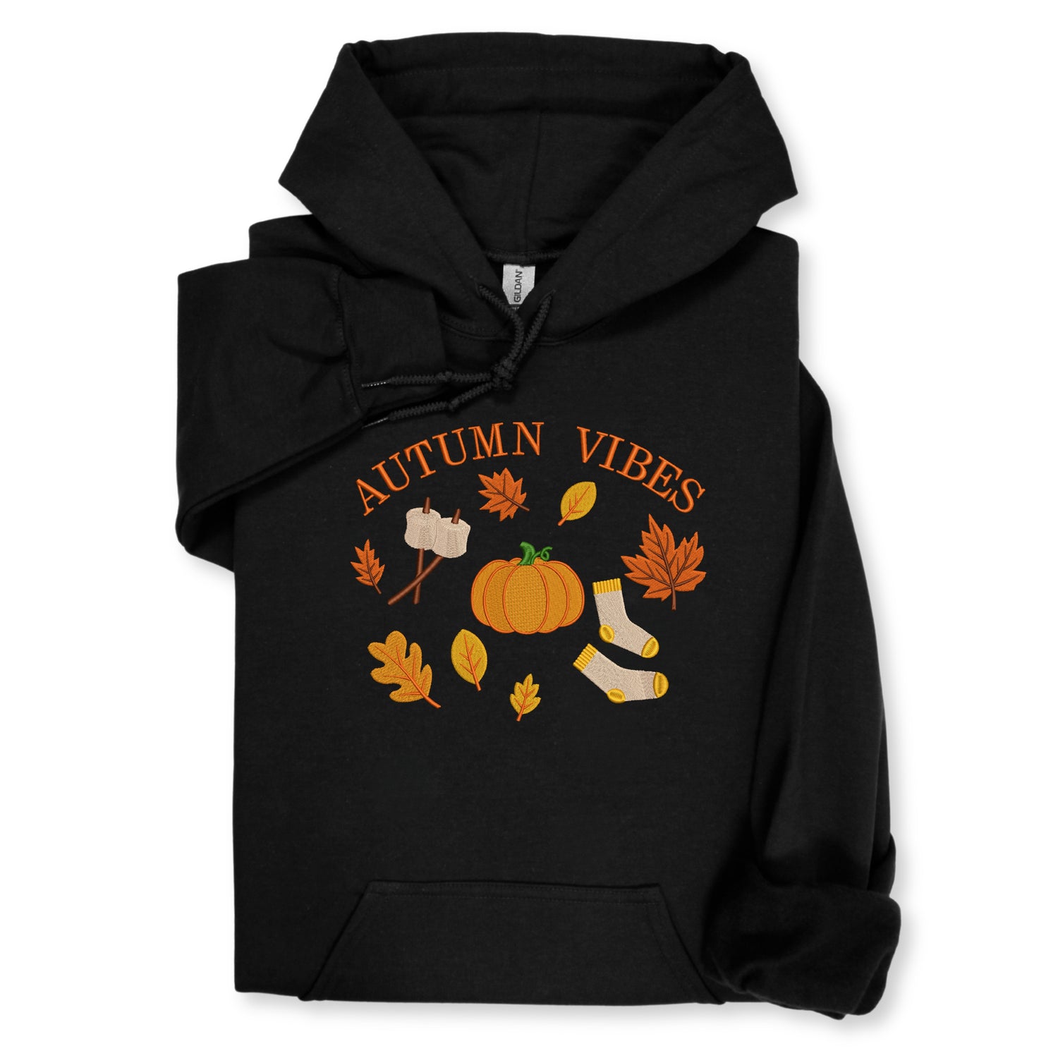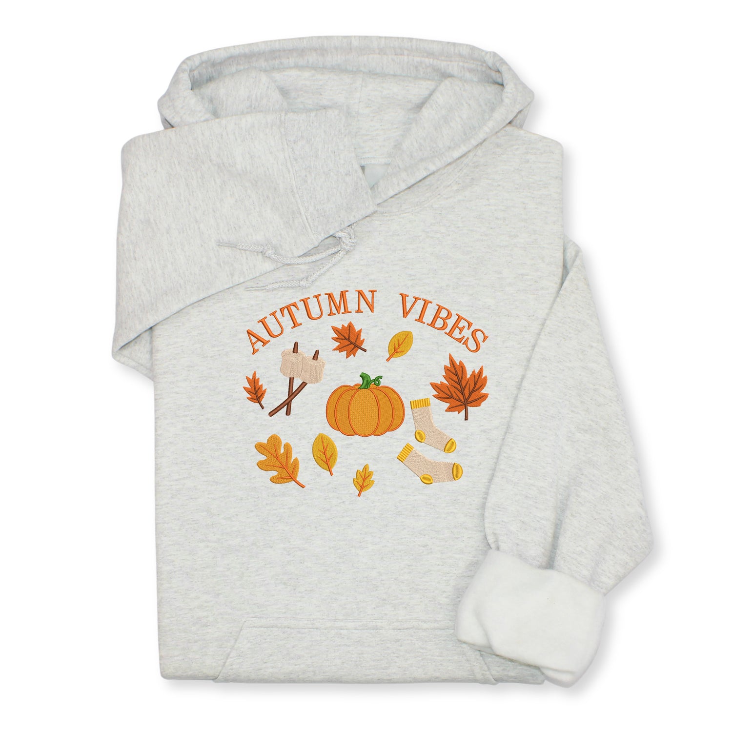 Wrap yourself in cozy comfort with this "Autumn Vibes" embroidered hoodie or sweatshirt – a fall favorite featuring pumpkins, leaves, socks & marshmallows.