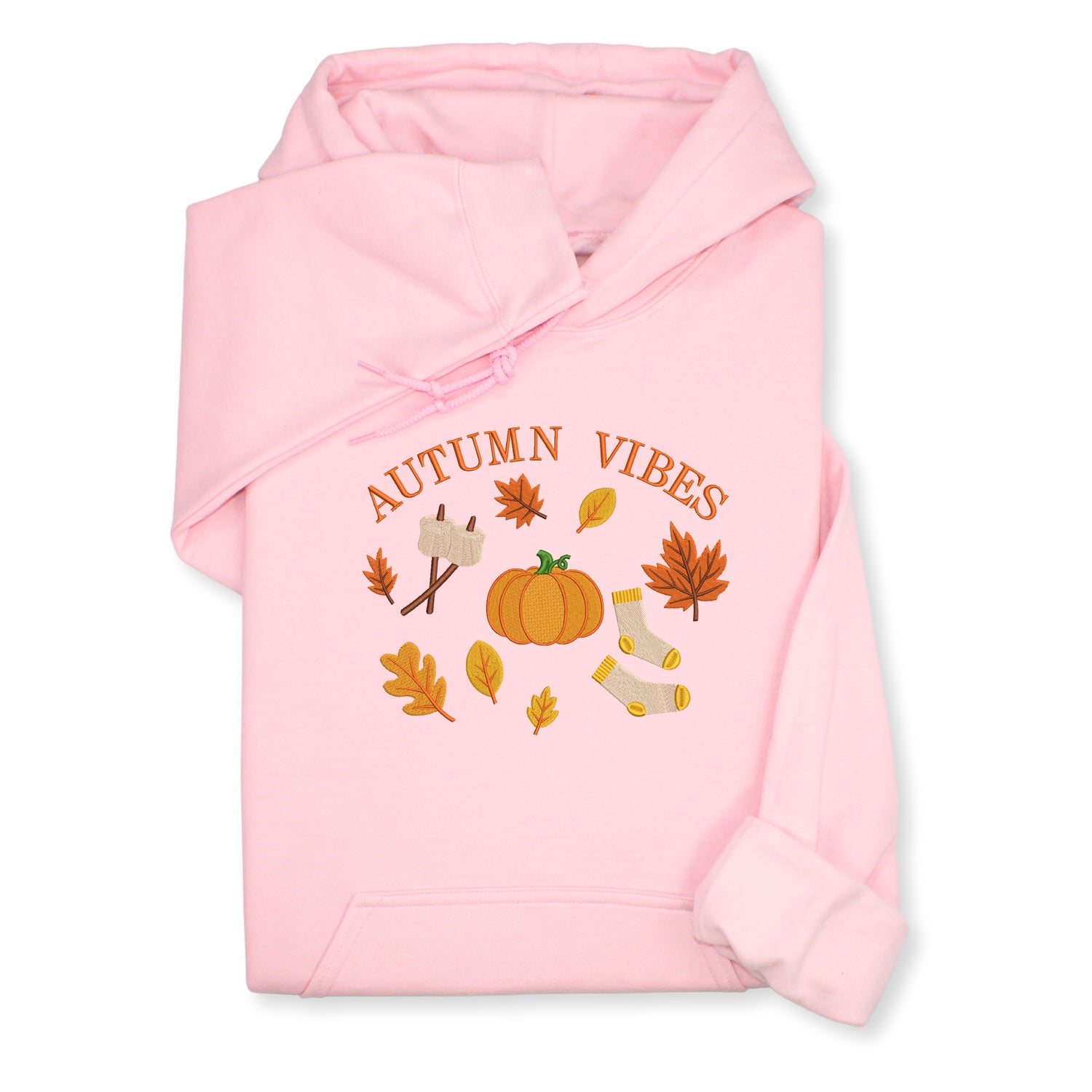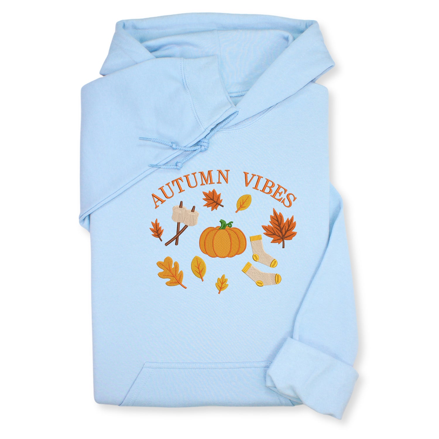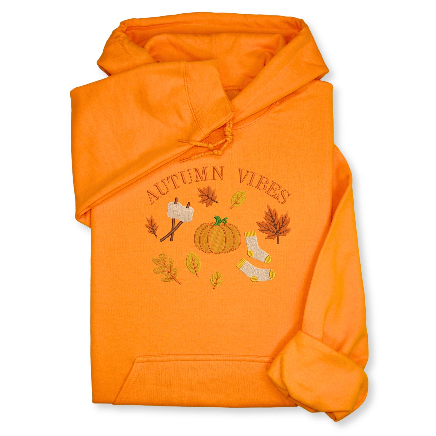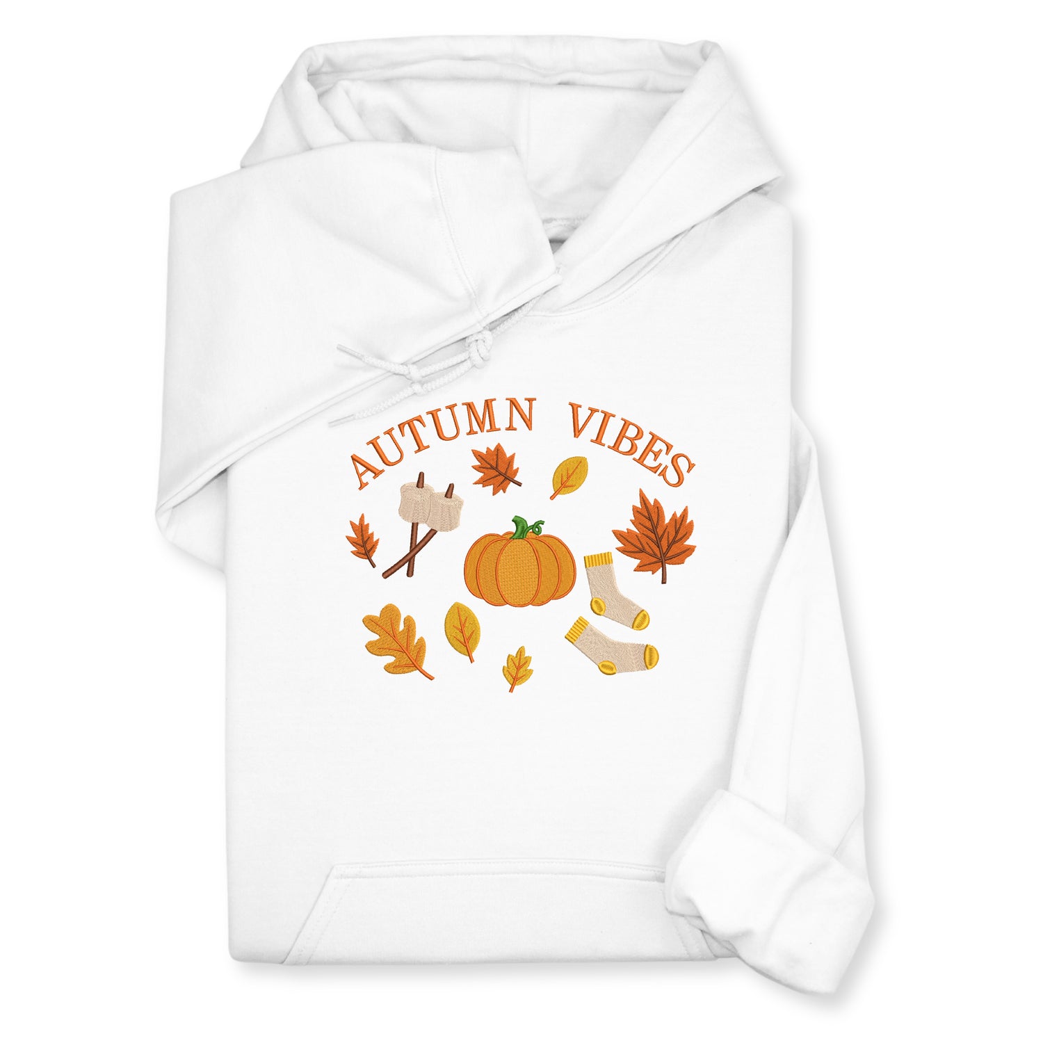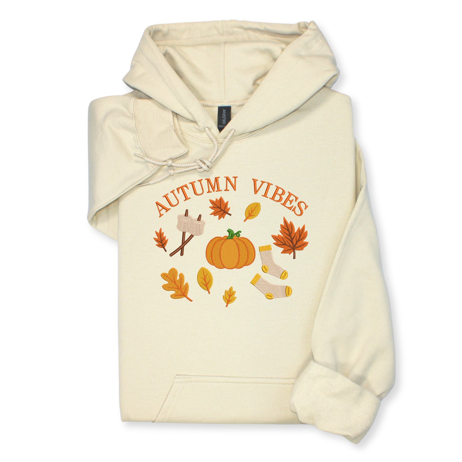 Wrap yourself in cozy comfort with this "Autumn Vibes" embroidered hoodie or sweatshirt – a fall favorite featuring pumpkins, leaves, socks & marshmallows.