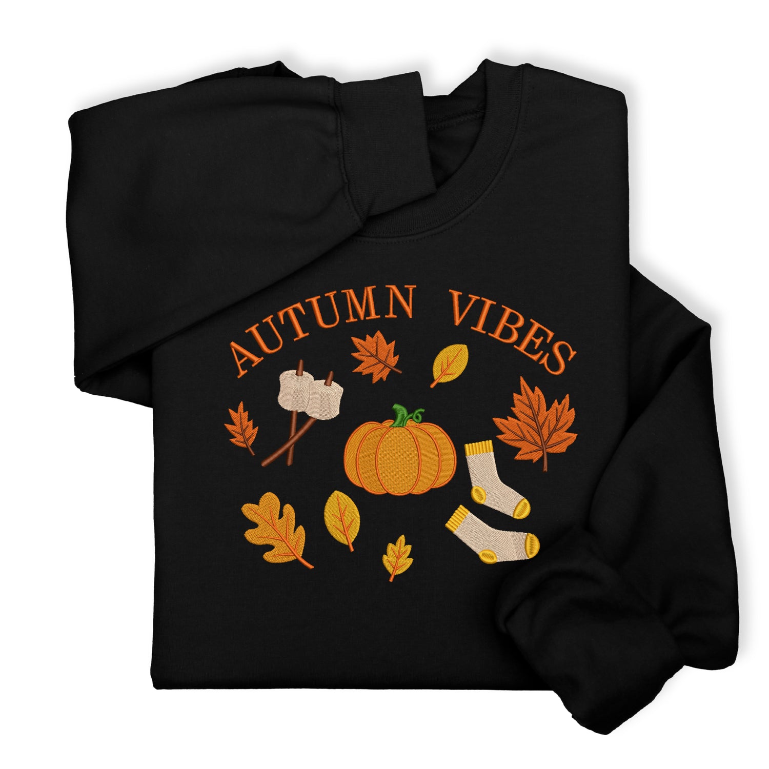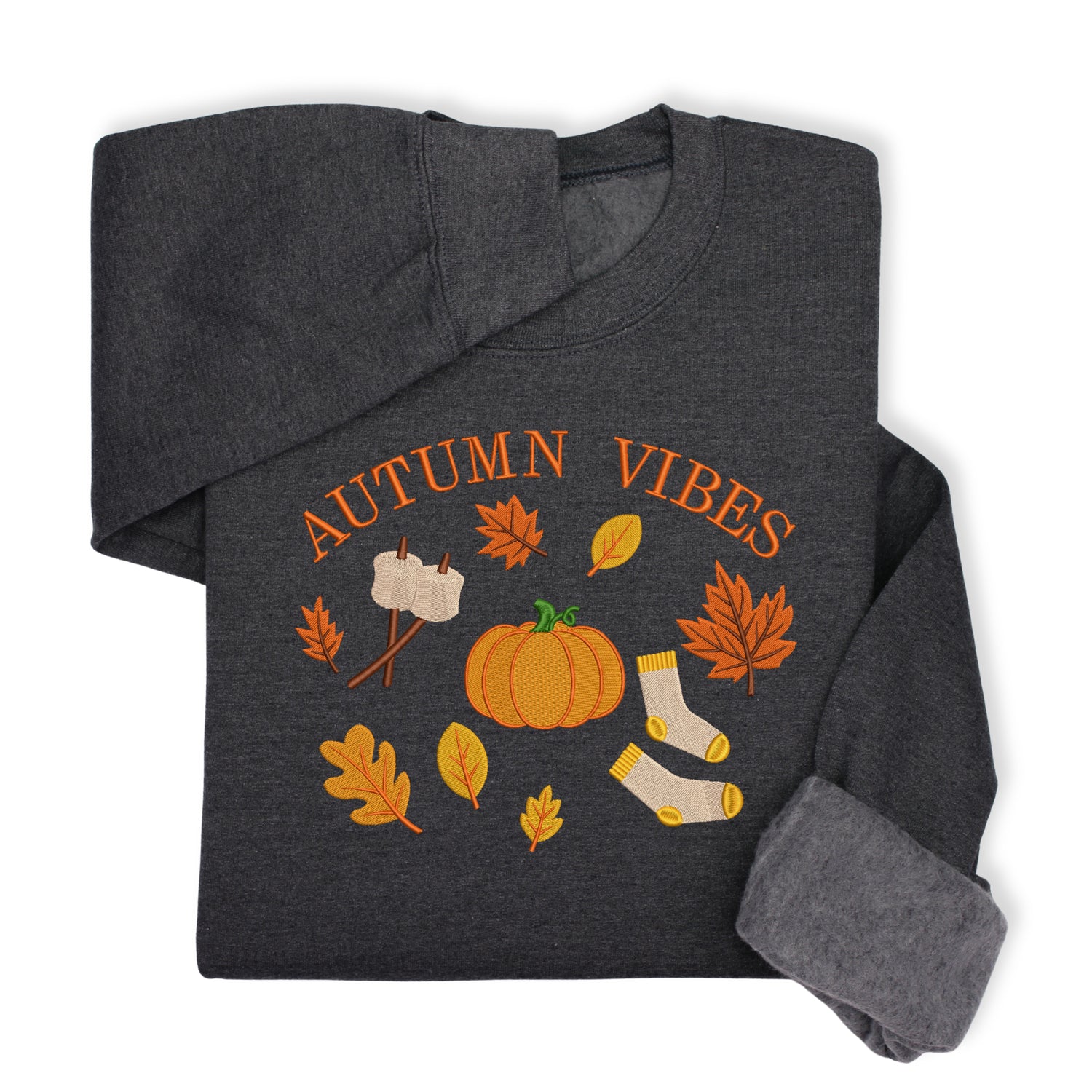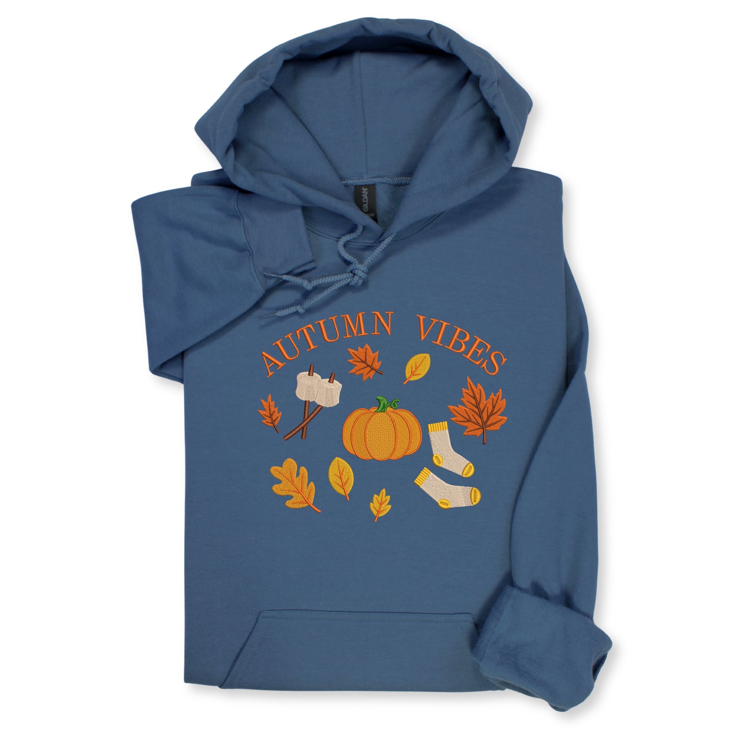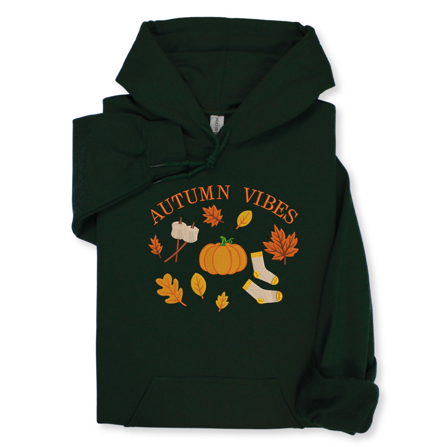 Wrap yourself in cozy comfort with this "Autumn Vibes" embroidered hoodie or sweatshirt – a fall favorite featuring pumpkins, leaves, socks & marshmallows.