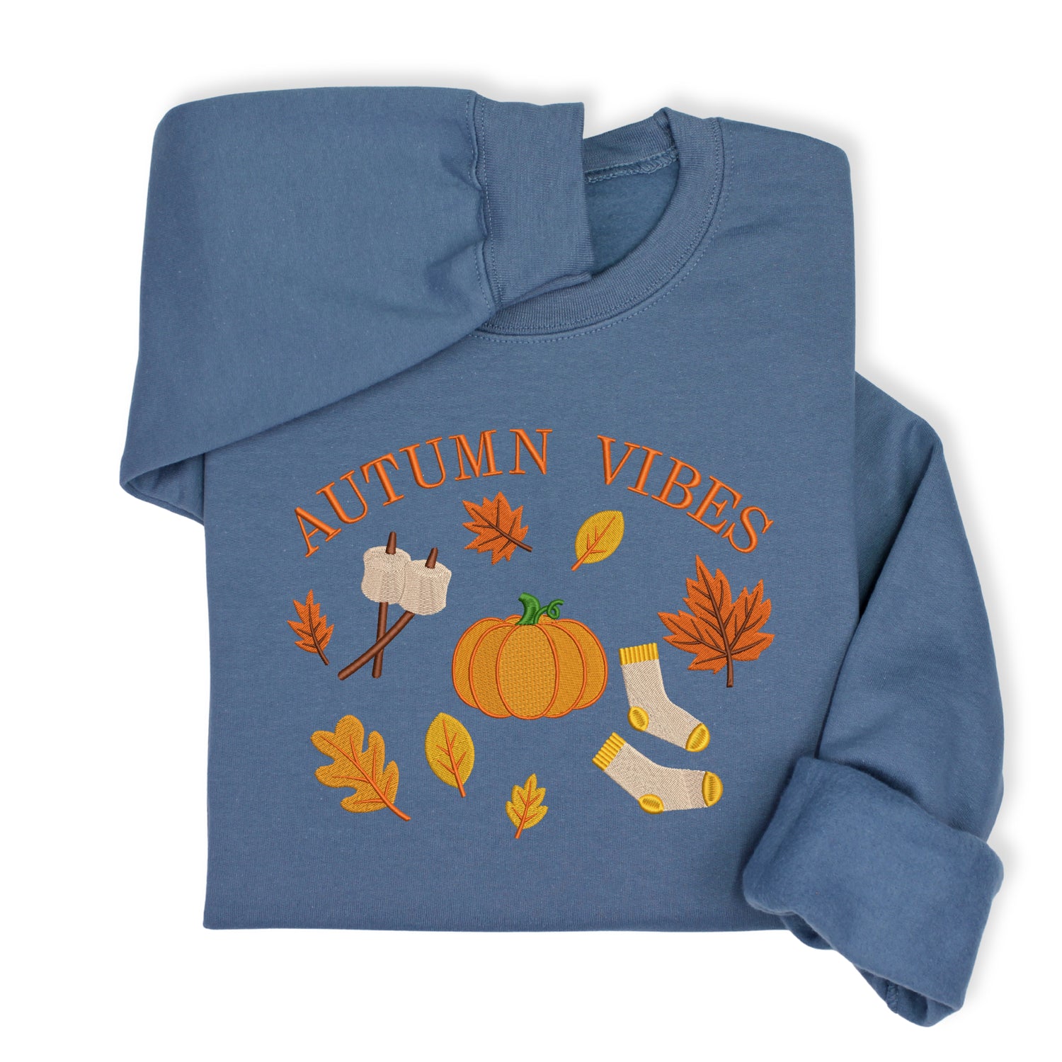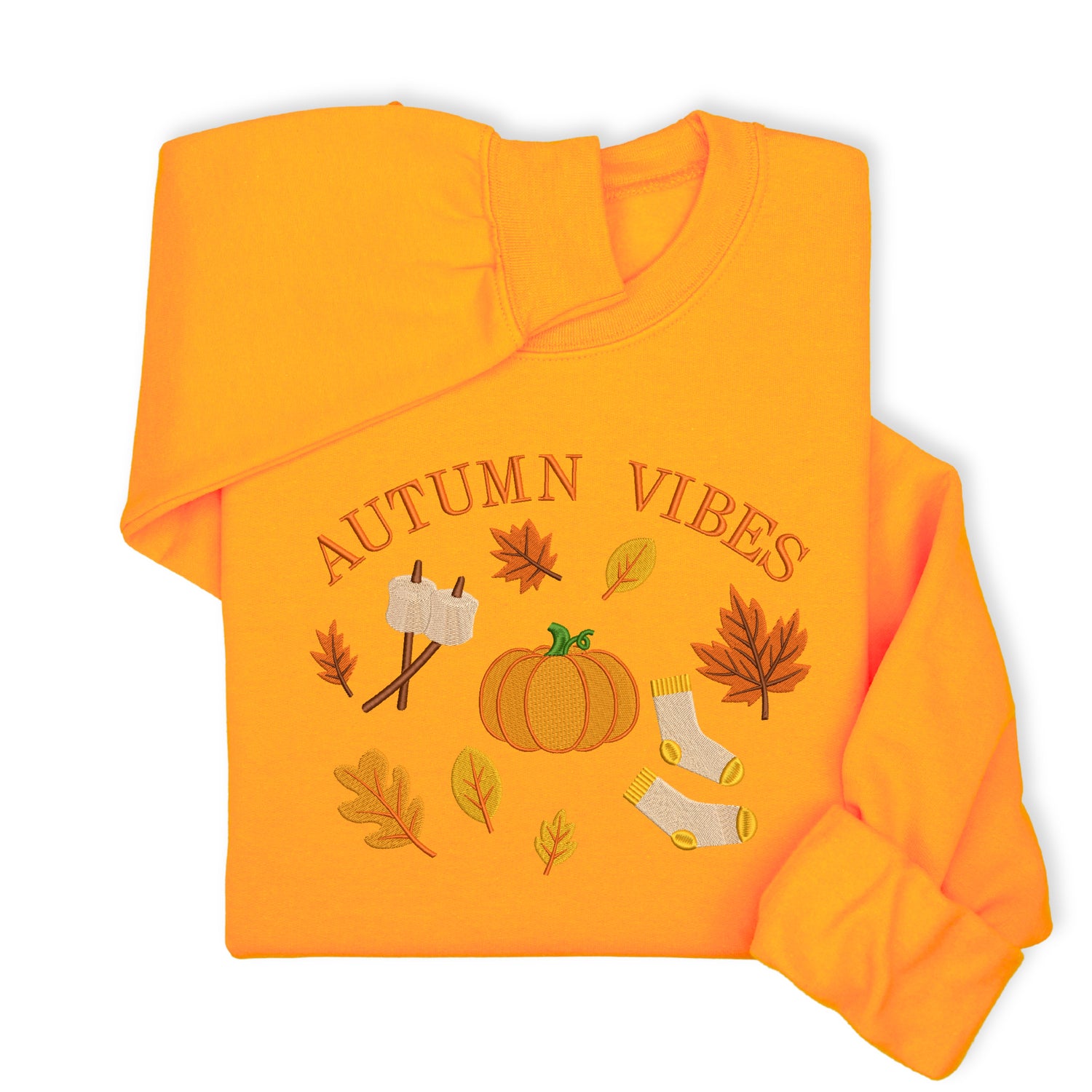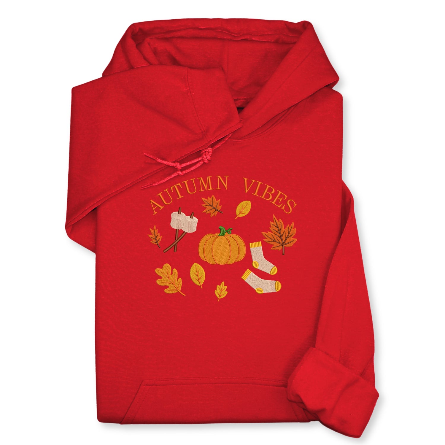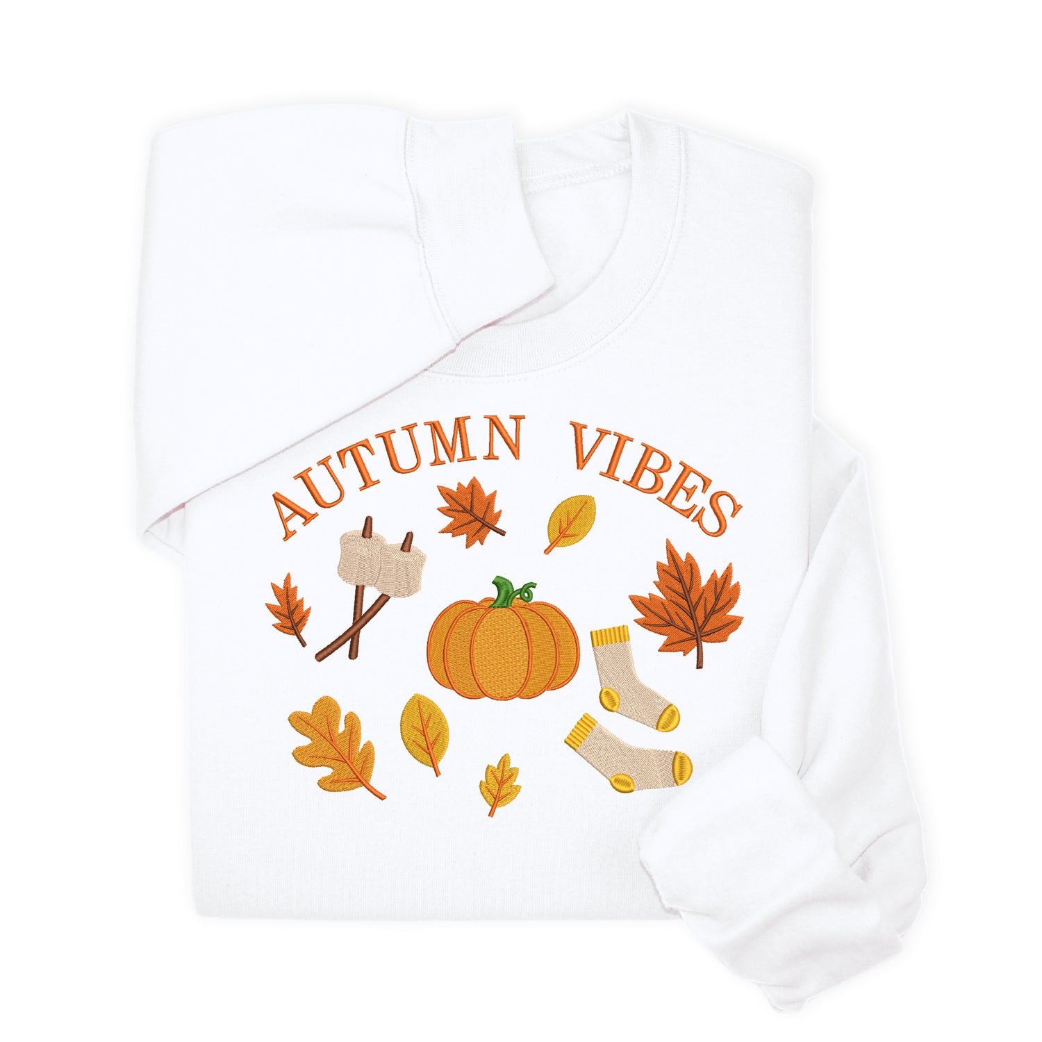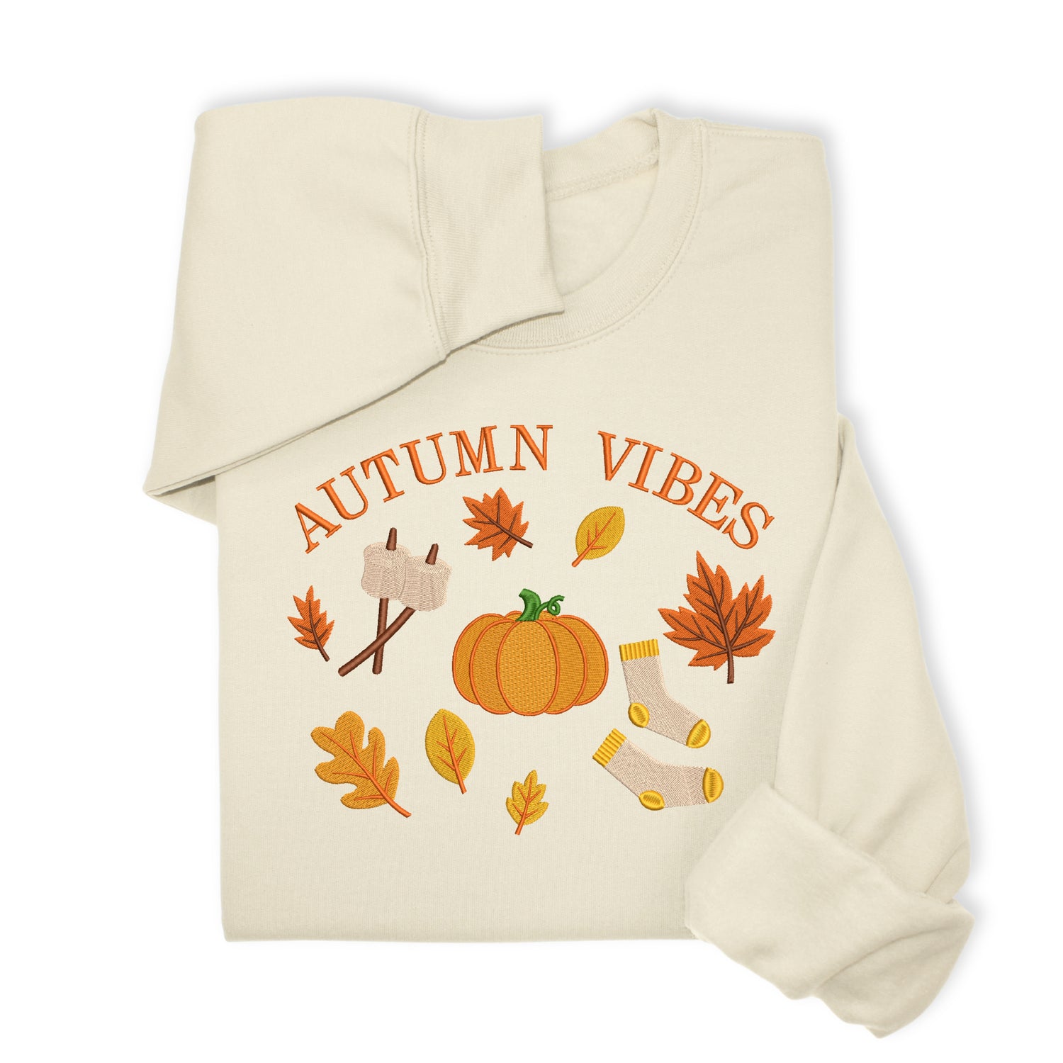 Wrap yourself in cozy comfort with this "Autumn Vibes" embroidered hoodie or sweatshirt – a fall favorite featuring pumpkins, leaves, socks & marshmallows.