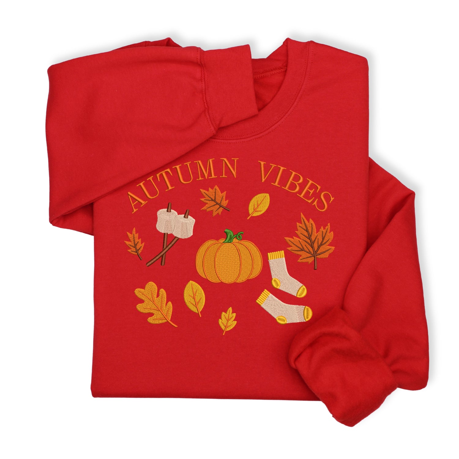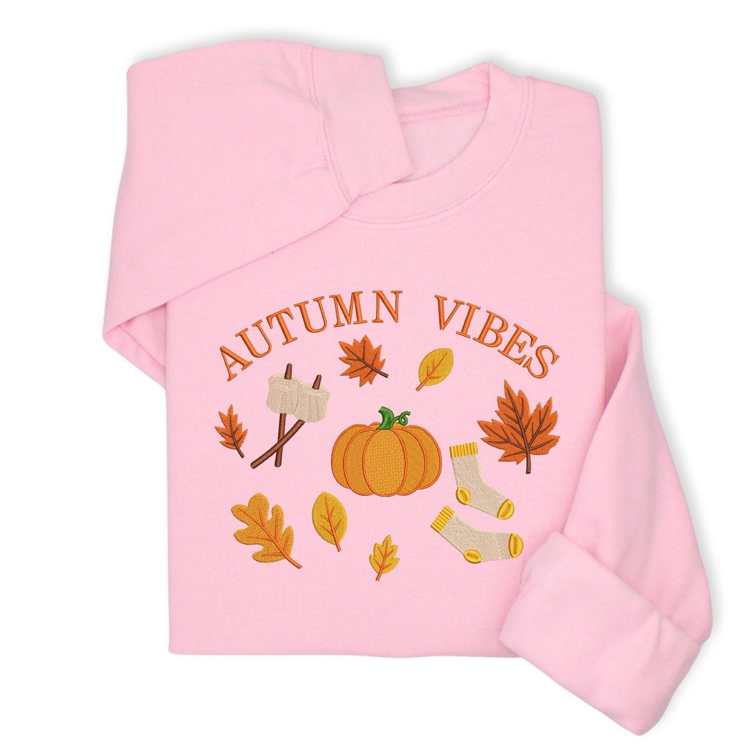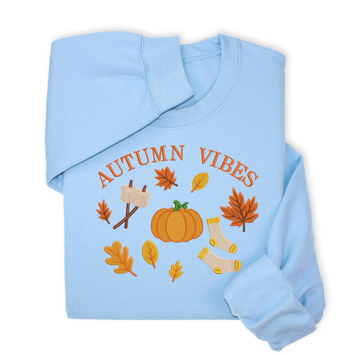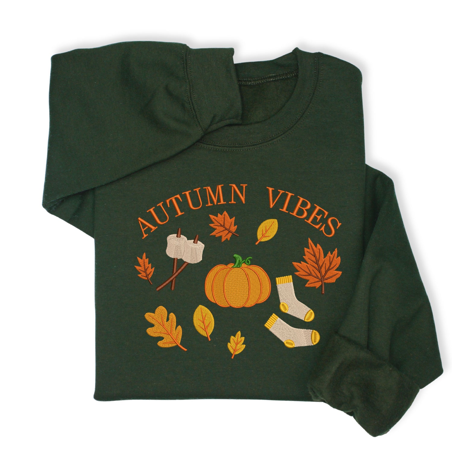 Wrap yourself in cozy comfort with this "Autumn Vibes" embroidered hoodie or sweatshirt – a fall favorite featuring pumpkins, leaves, socks & marshmallows.