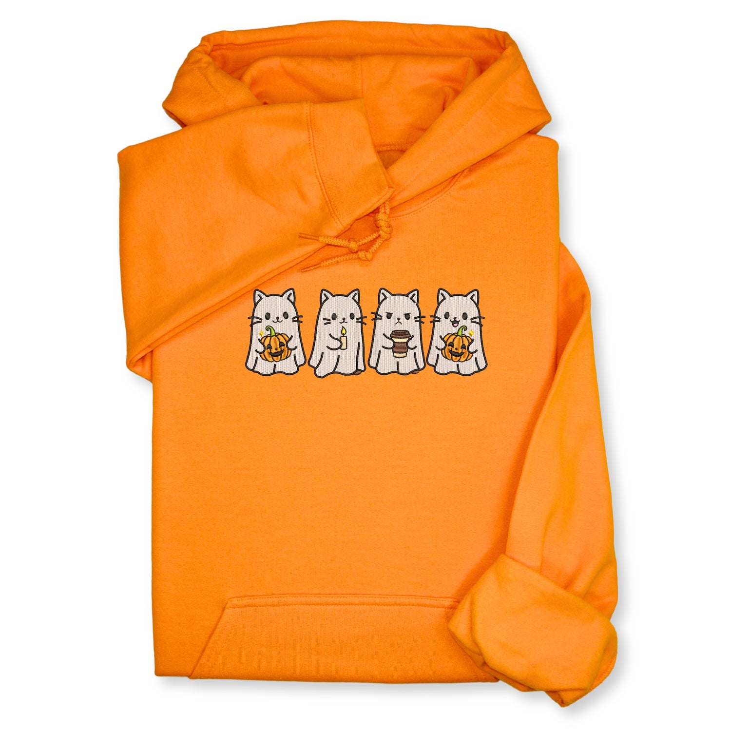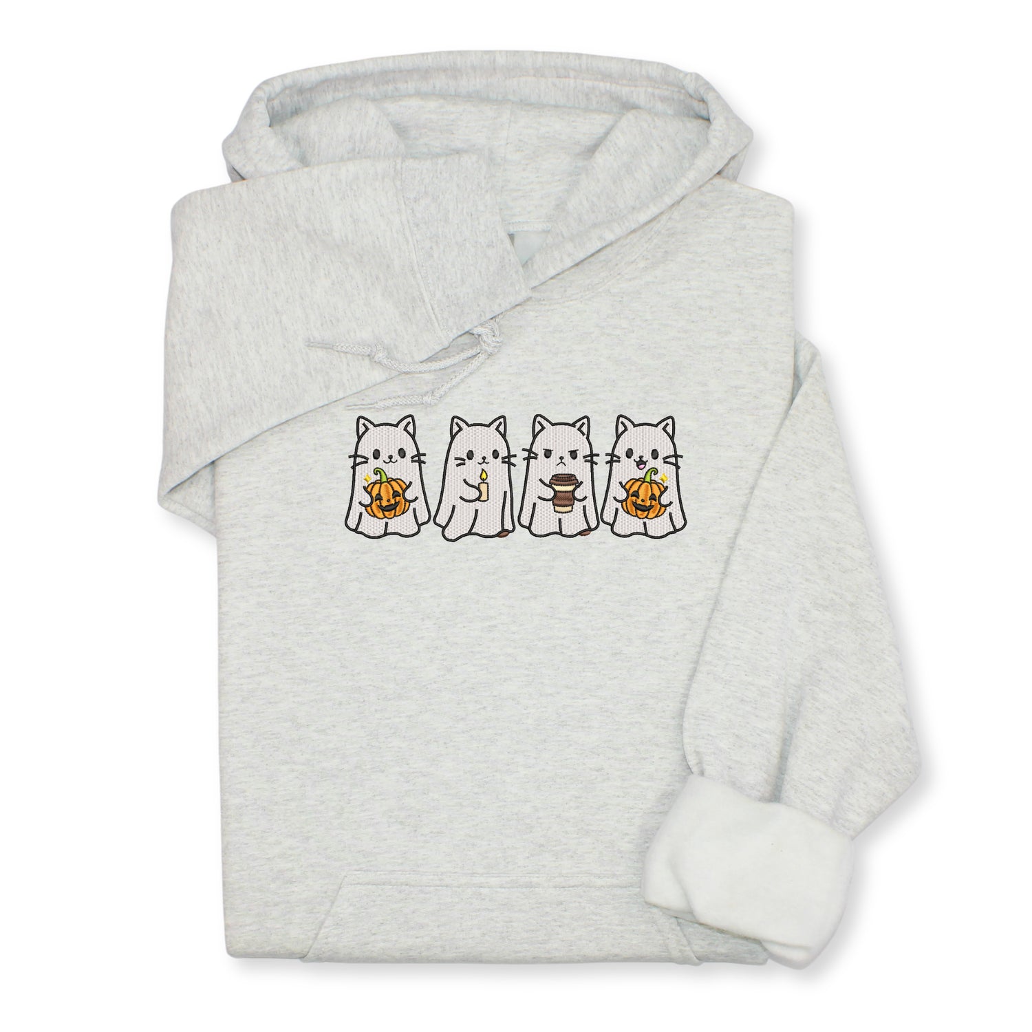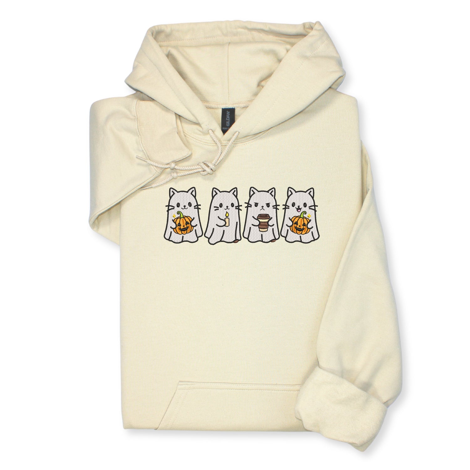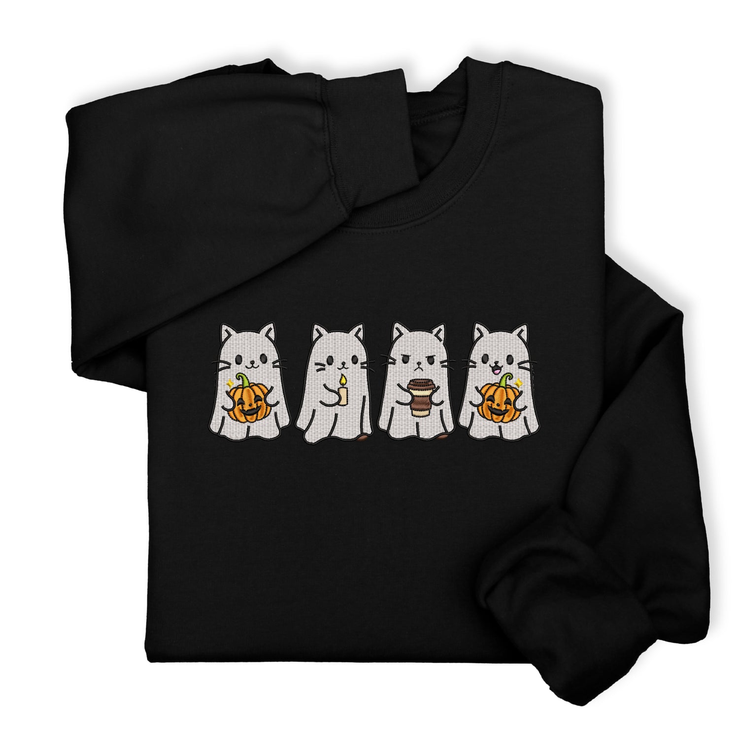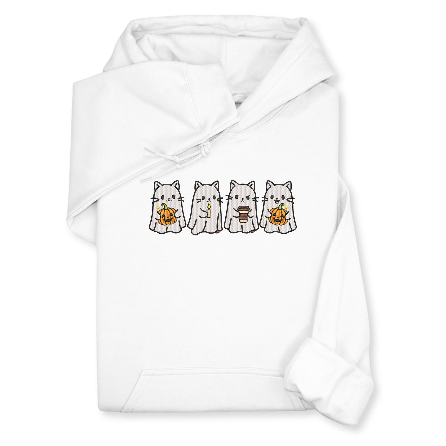 Ghost Cat Embroidered Hoodie & Sweatshirt – Cute Halloween Kawaii Cats, Pumpkin Latte & Candle Design, Cozy October Fall Gift for Cat Lovers
