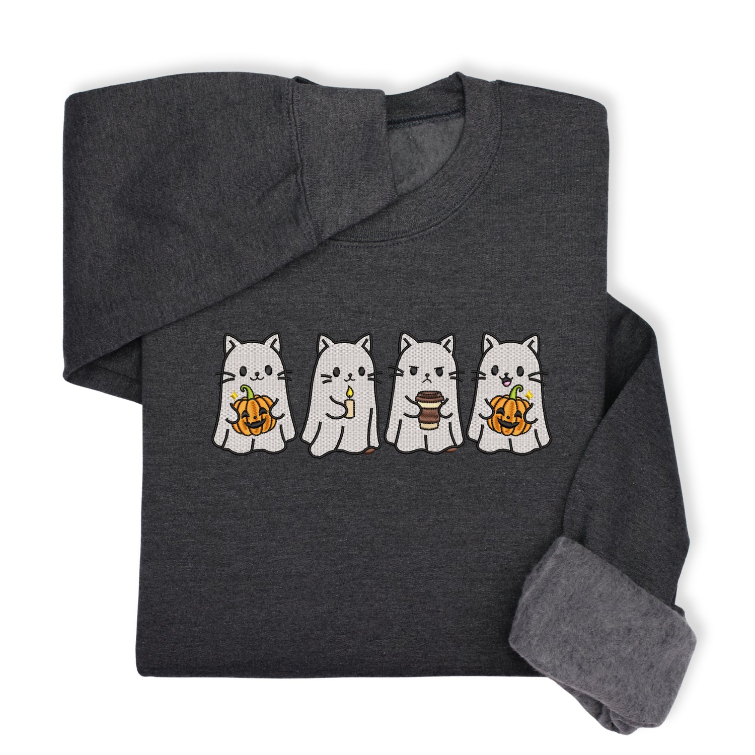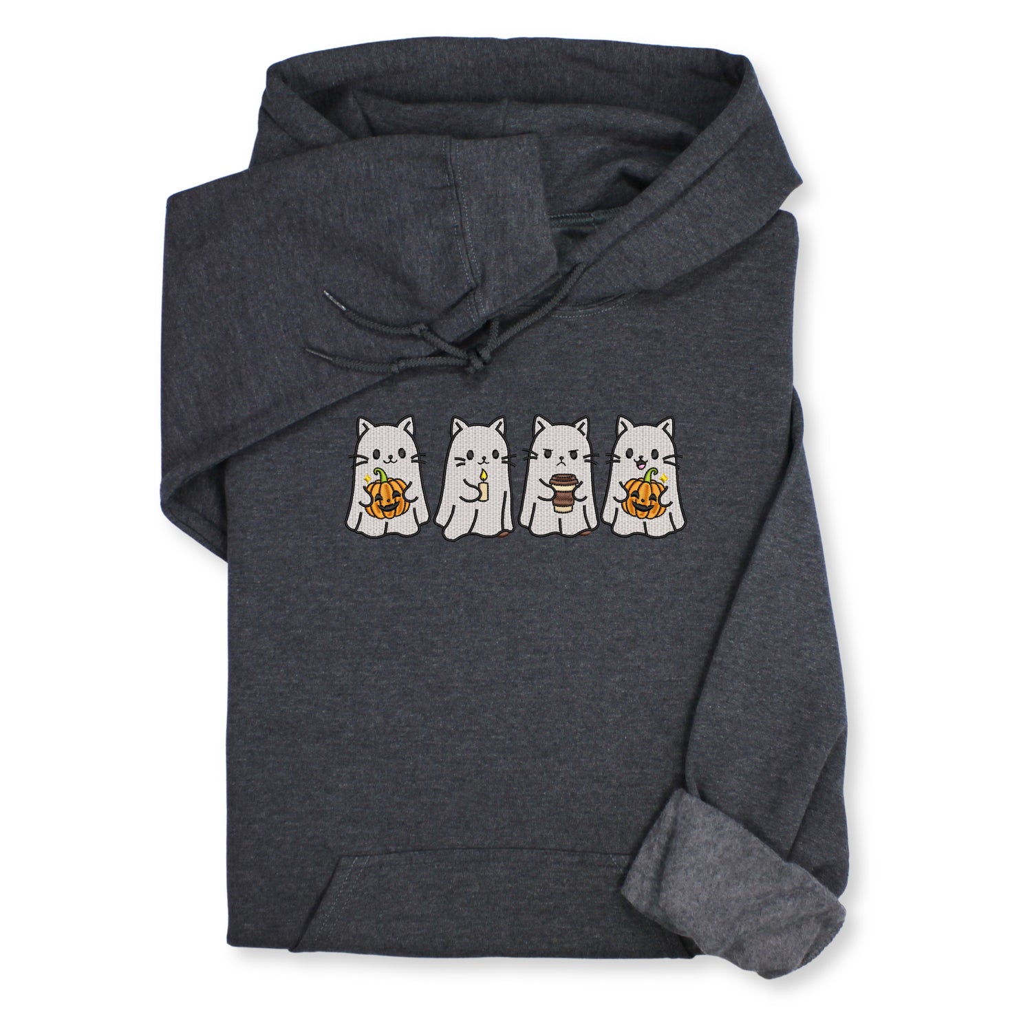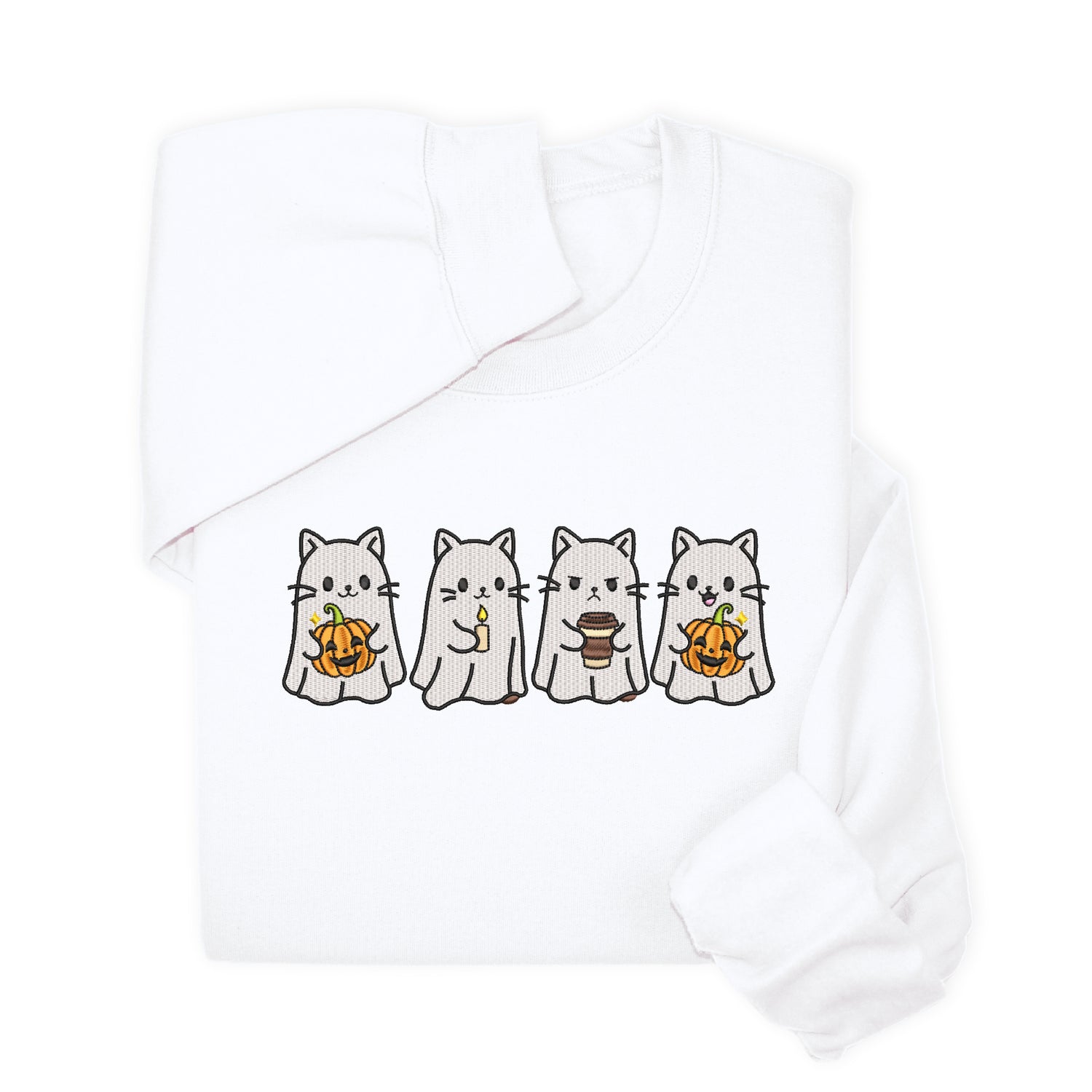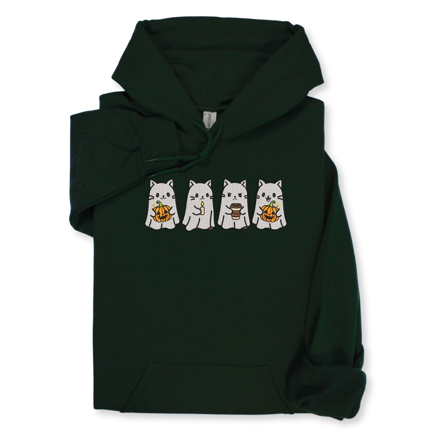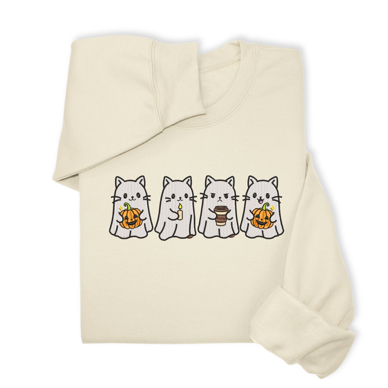 Ghost Cat Embroidered Hoodie & Sweatshirt – Cute Halloween Kawaii Cats, Pumpkin Latte & Candle Design, Cozy October Fall Gift for Cat Lovers