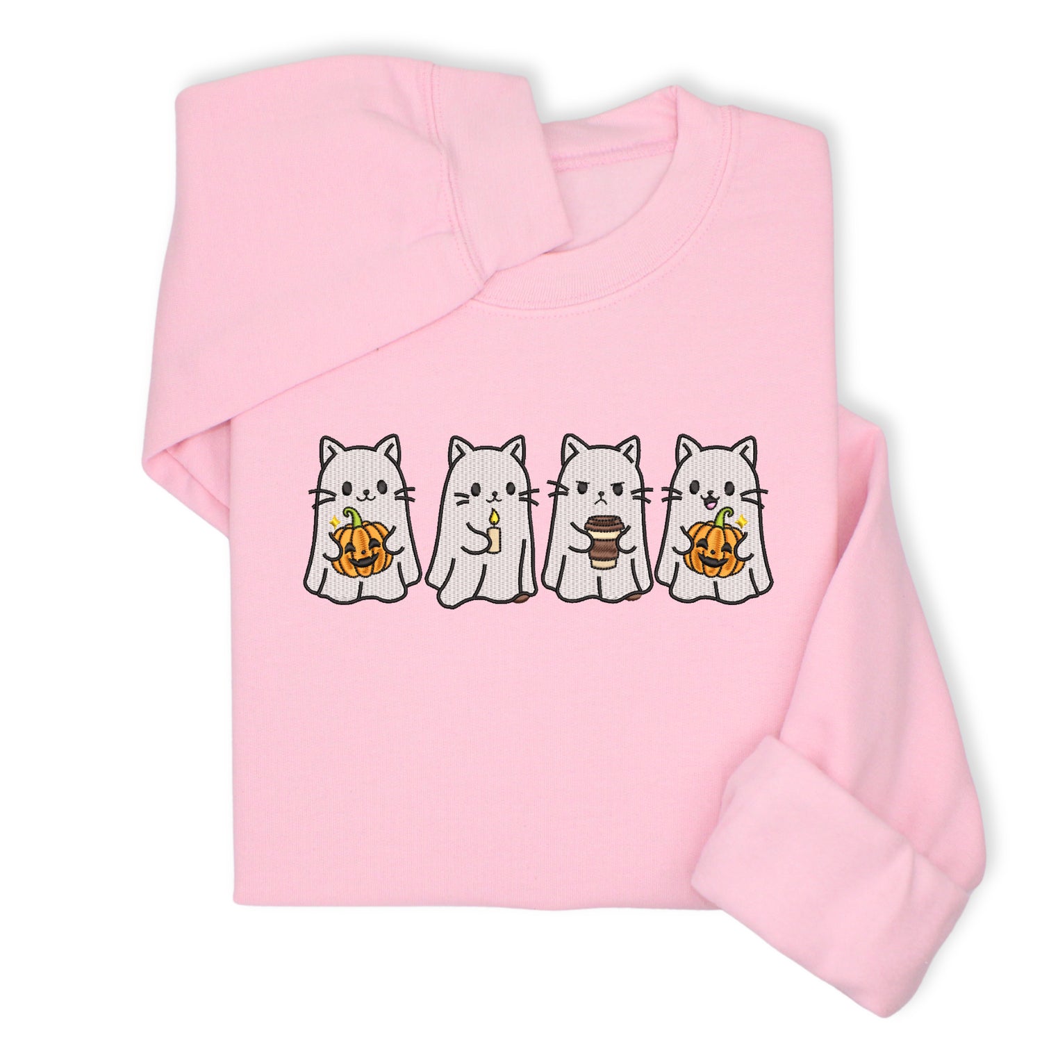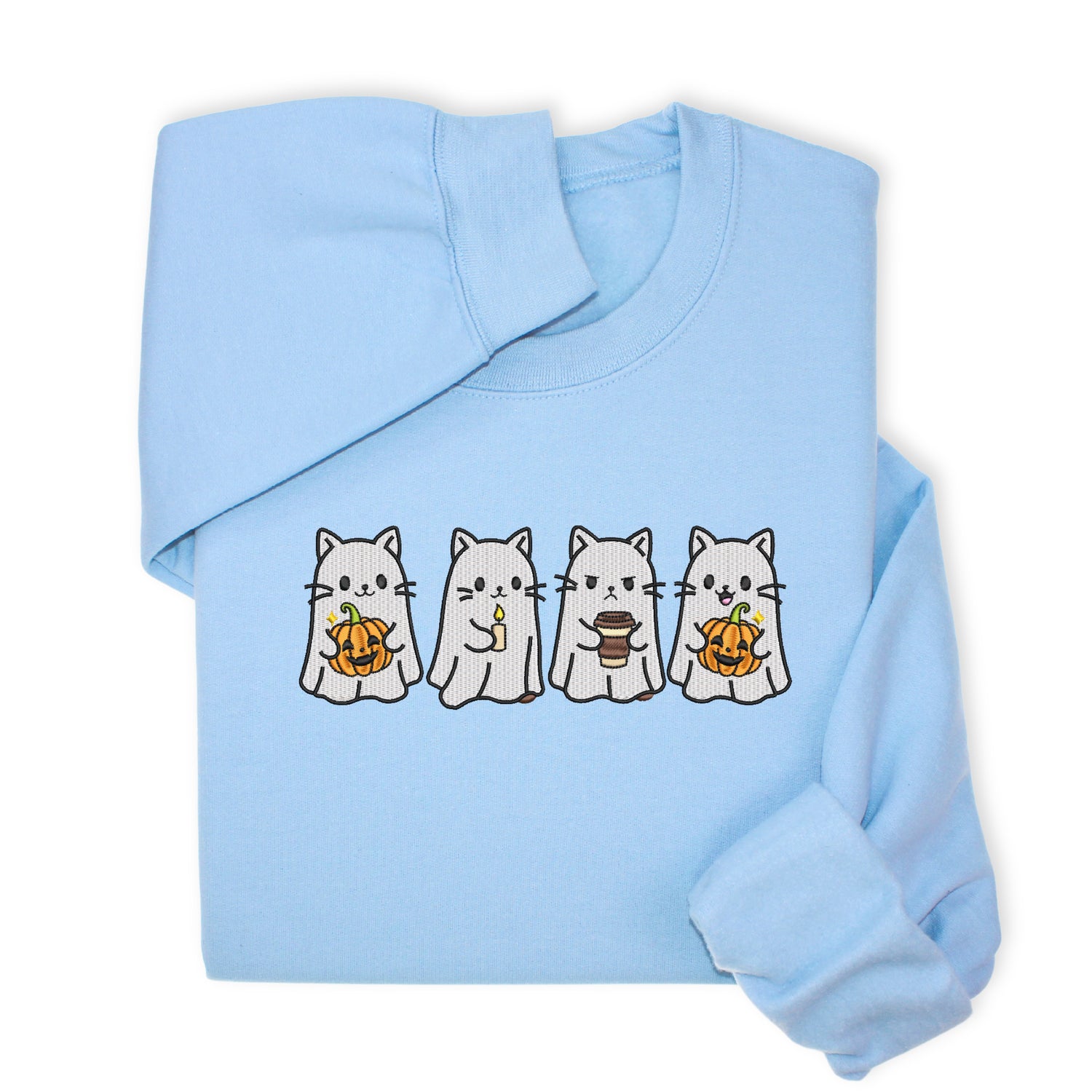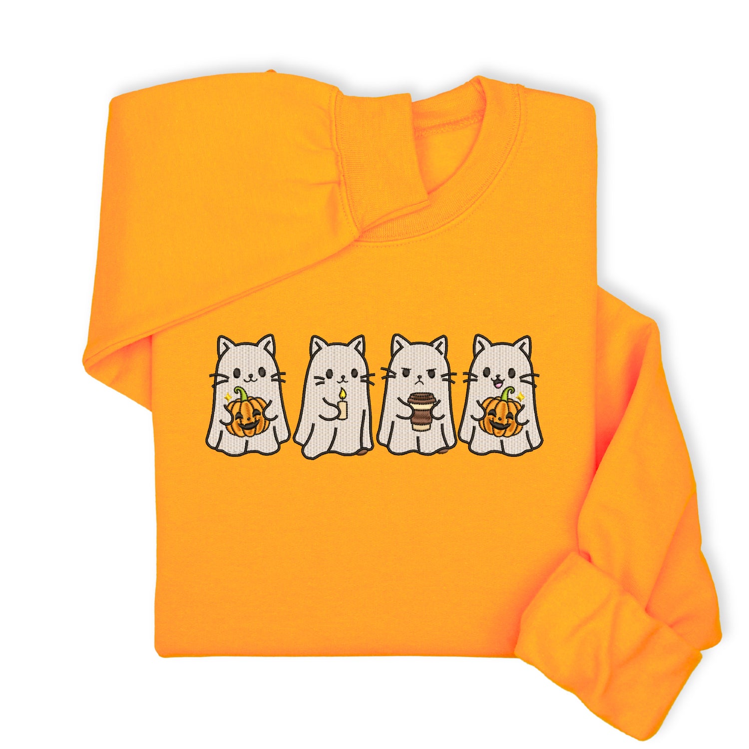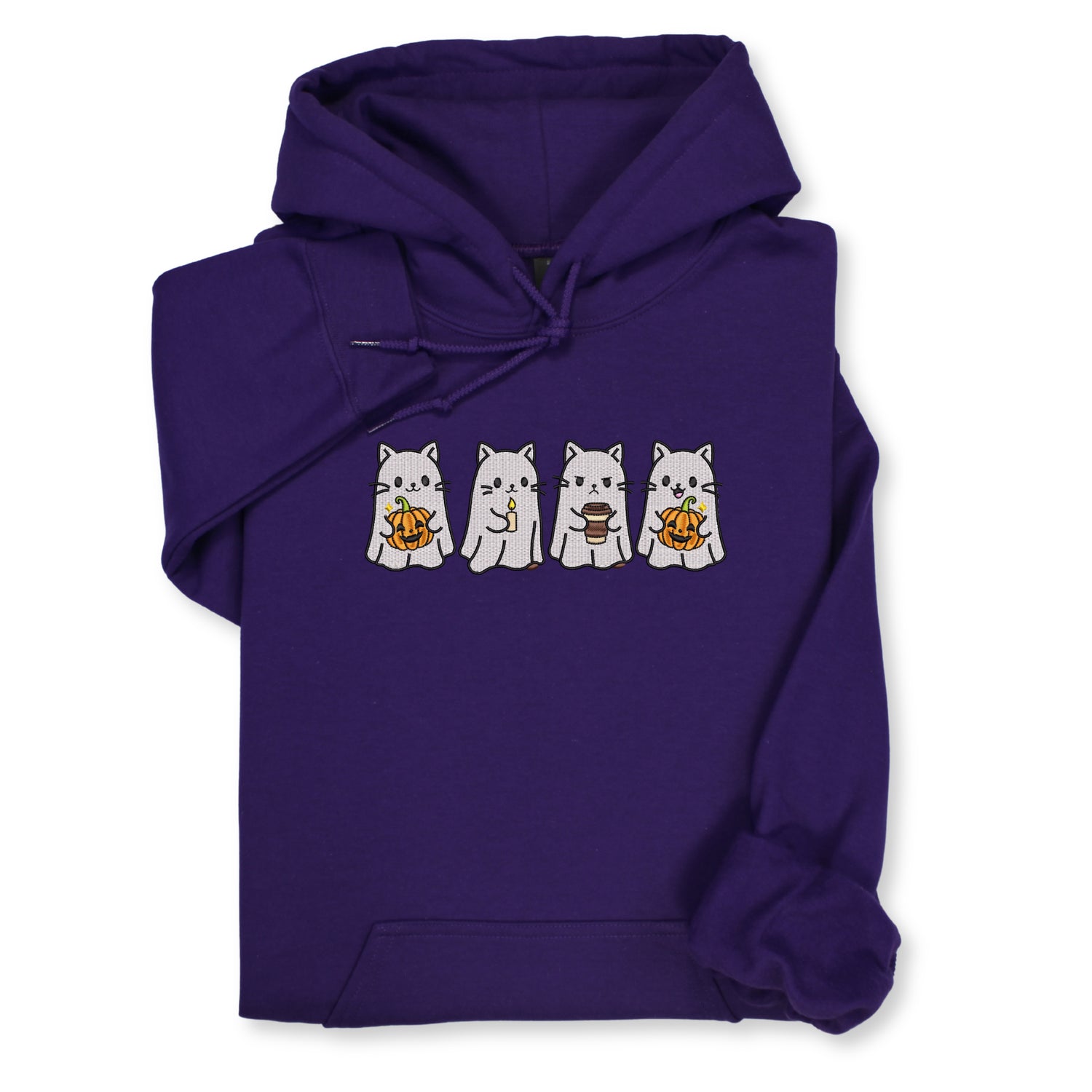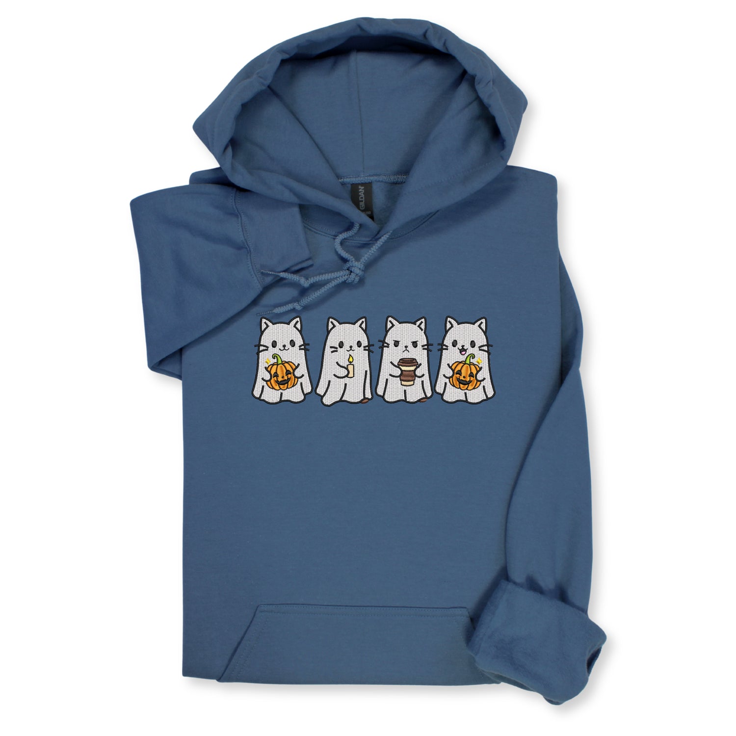 Ghost Cat Embroidered Hoodie & Sweatshirt – Cute Halloween Kawaii Cats, Pumpkin Latte & Candle Design, Cozy October Fall Gift for Cat Lovers
