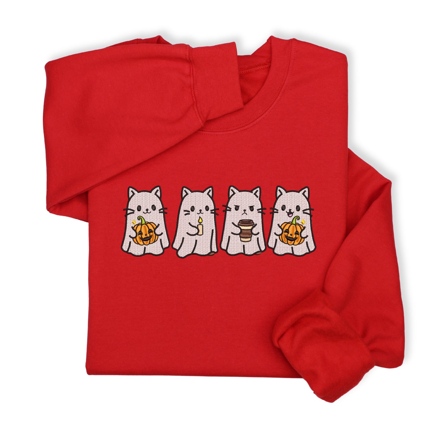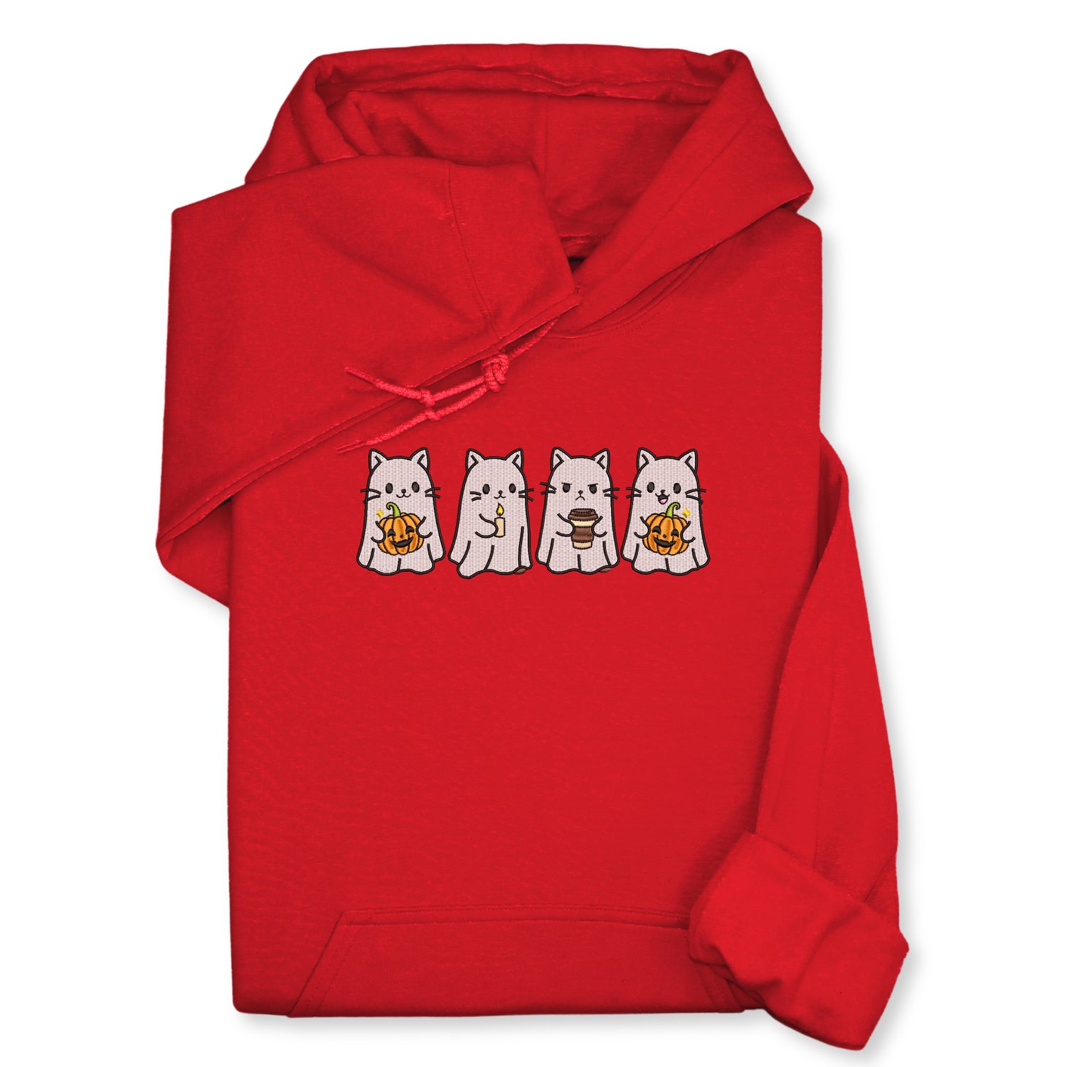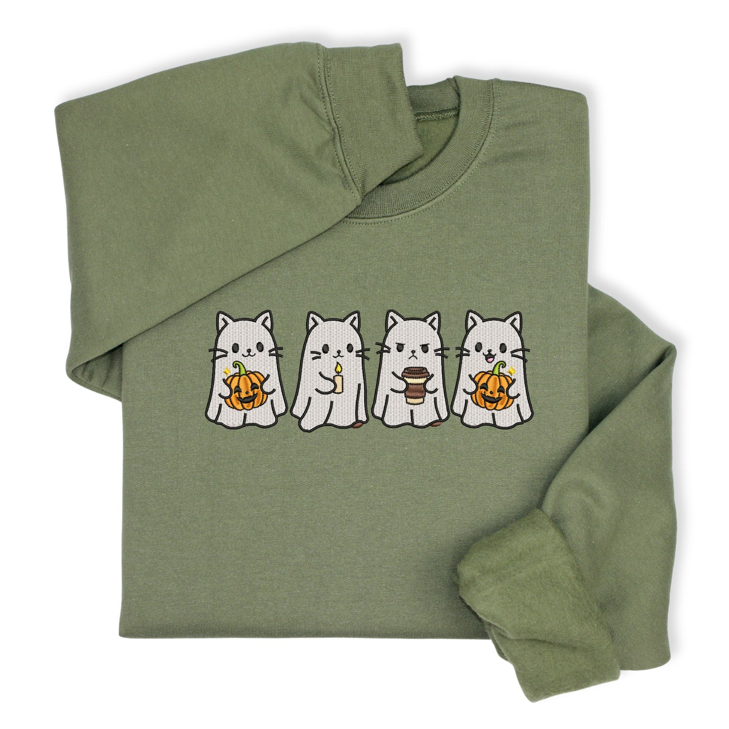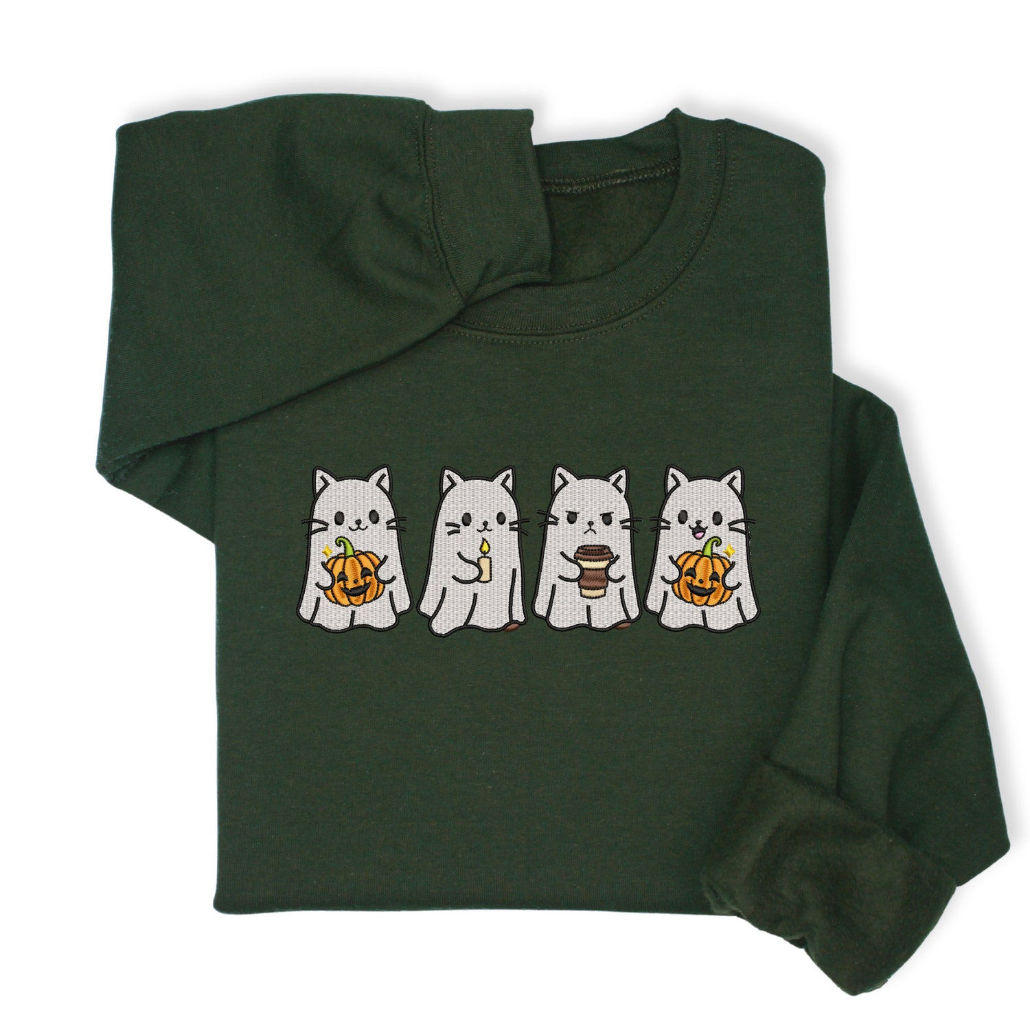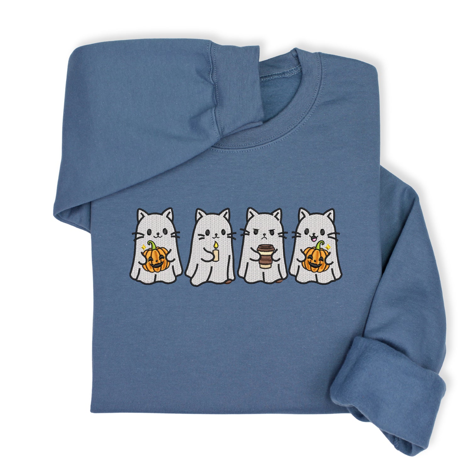 Ghost Cat Embroidered Hoodie & Sweatshirt – Cute Halloween Kawaii Cats, Pumpkin Latte & Candle Design, Cozy October Fall Gift for Cat Lovers