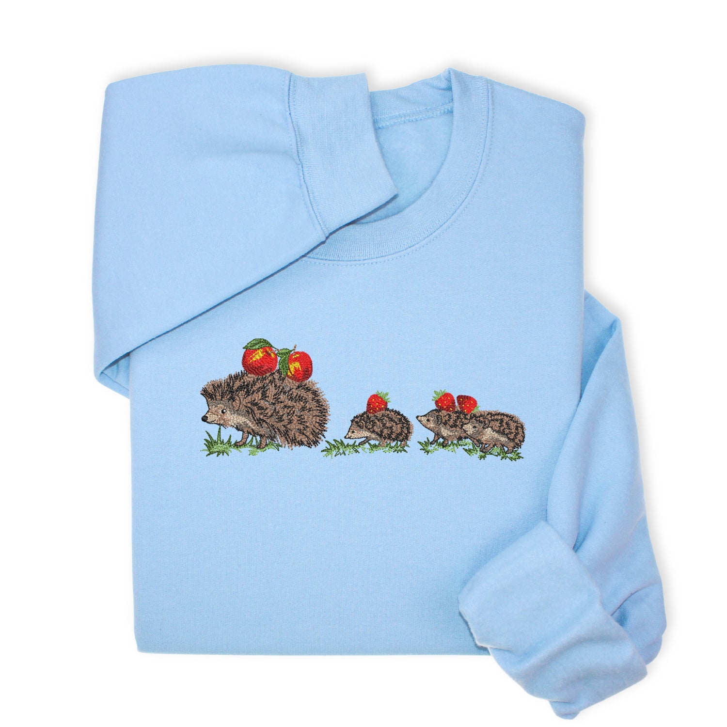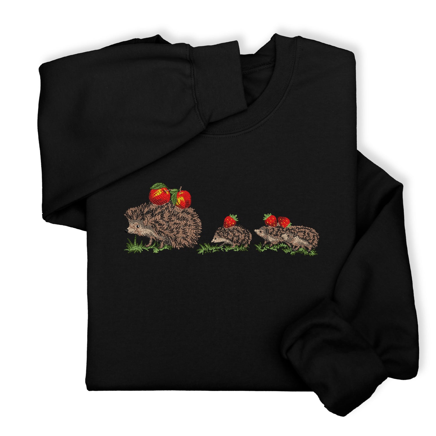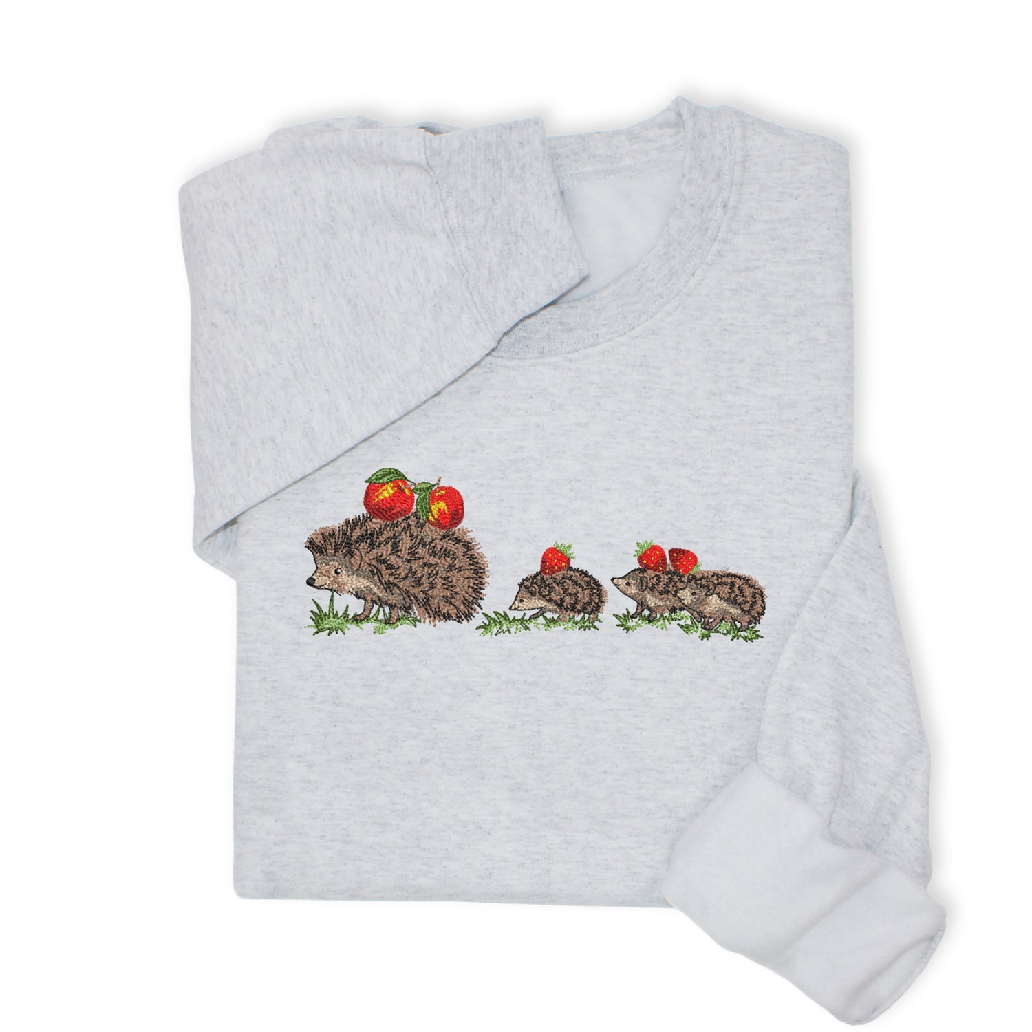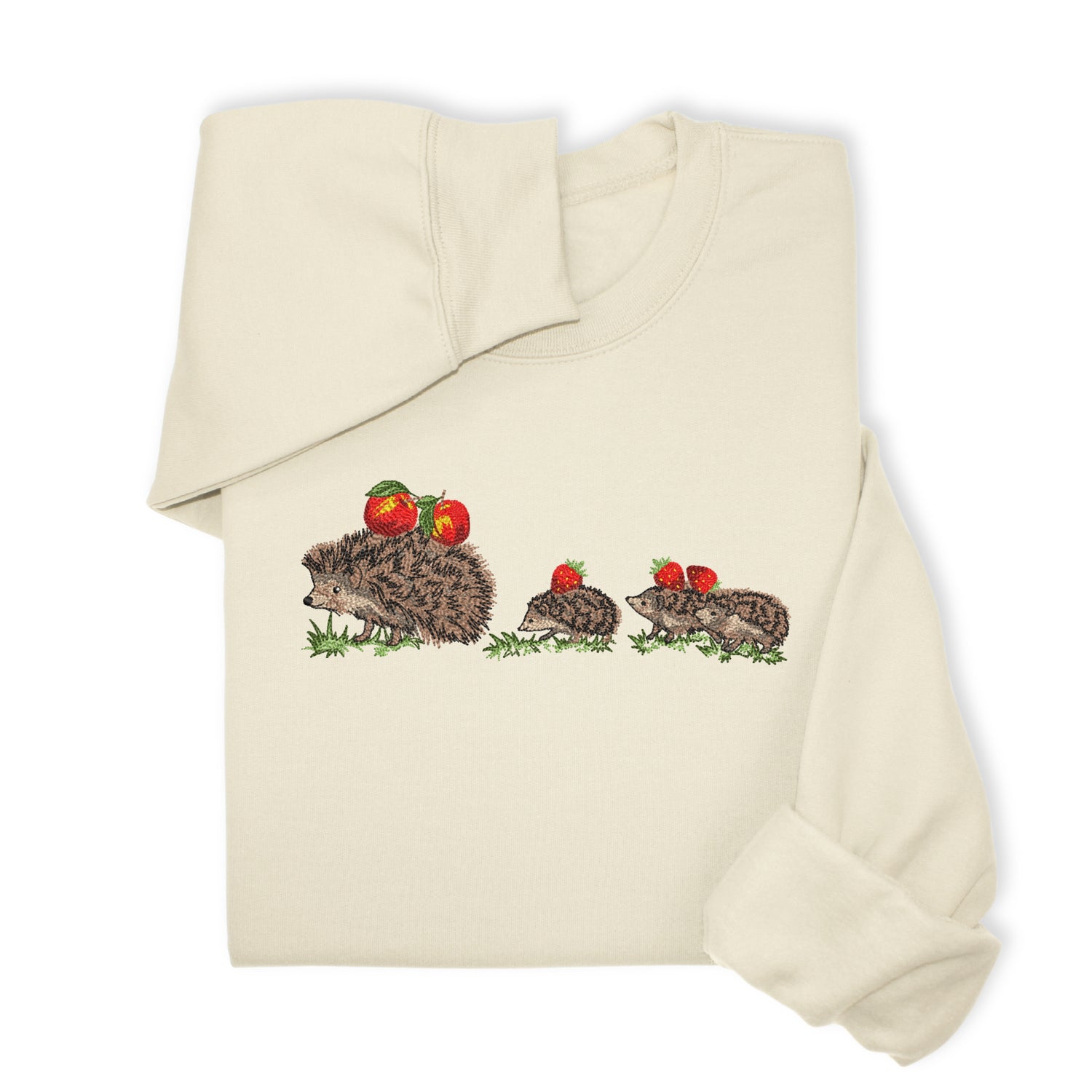 Wrap yourself in cozy charm with this adorable embroidered sweatshirt featuring a hedgehog family carrying strawberries and apples. A whimsical woodland design that adds a playful touch to any autumn or nature-inspired outfit.