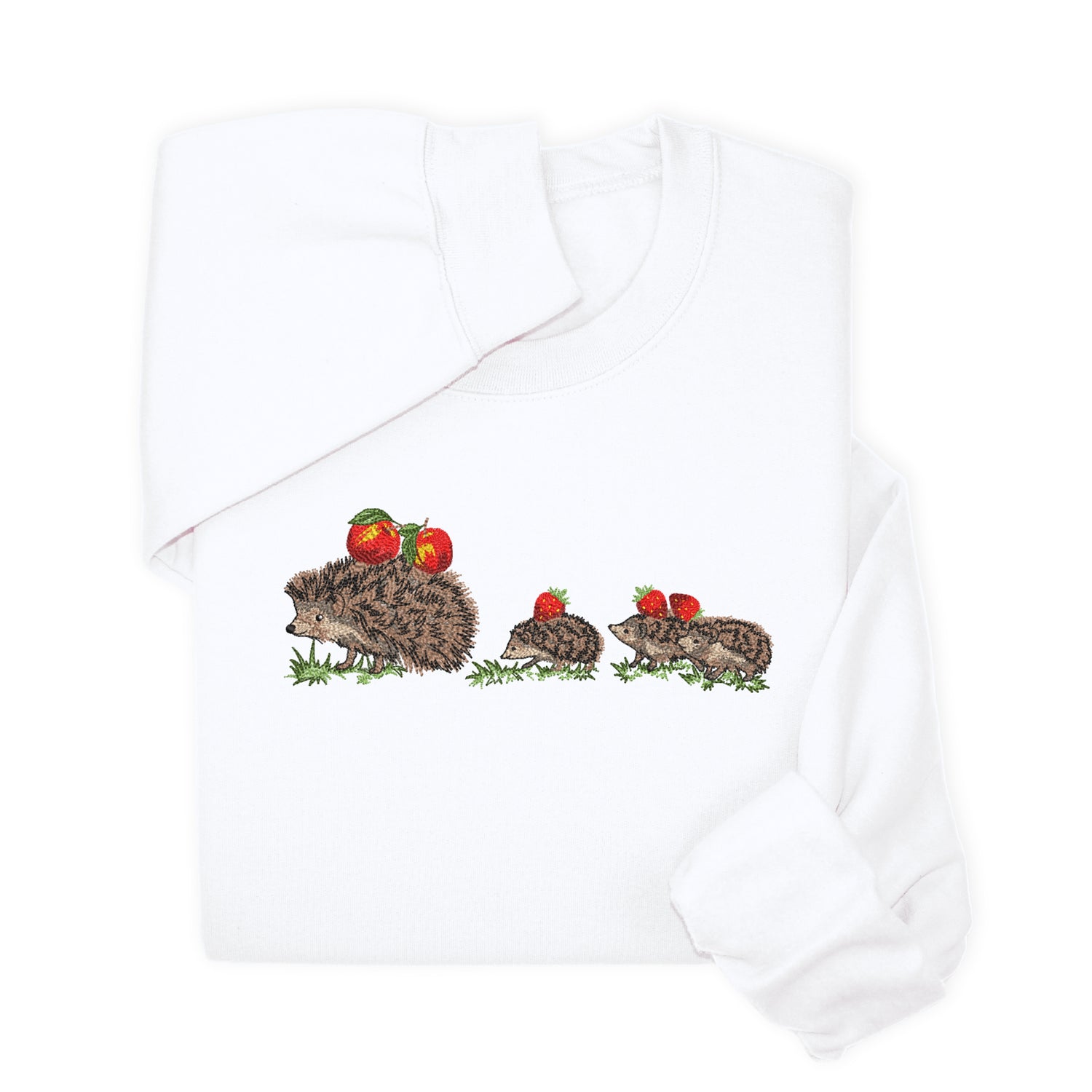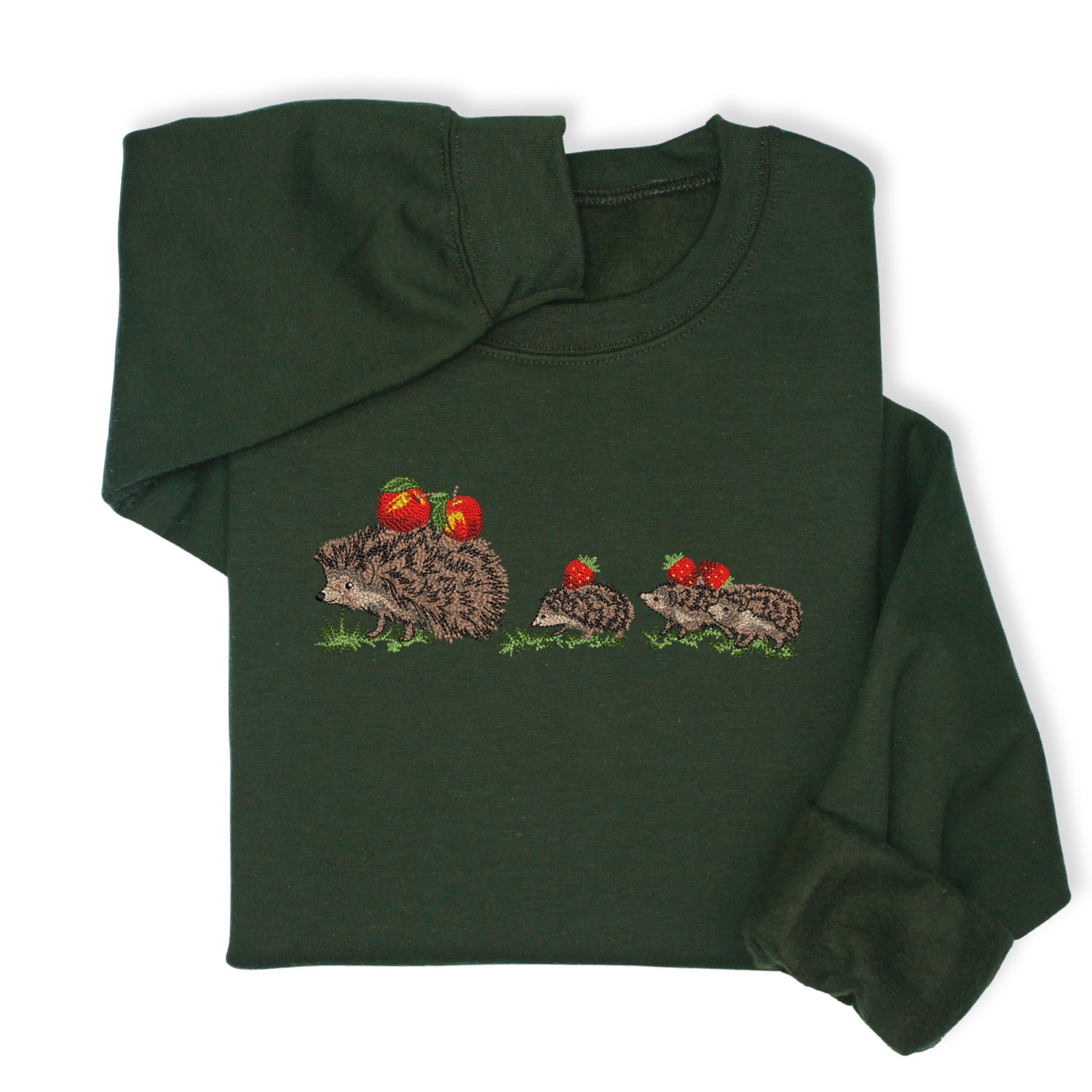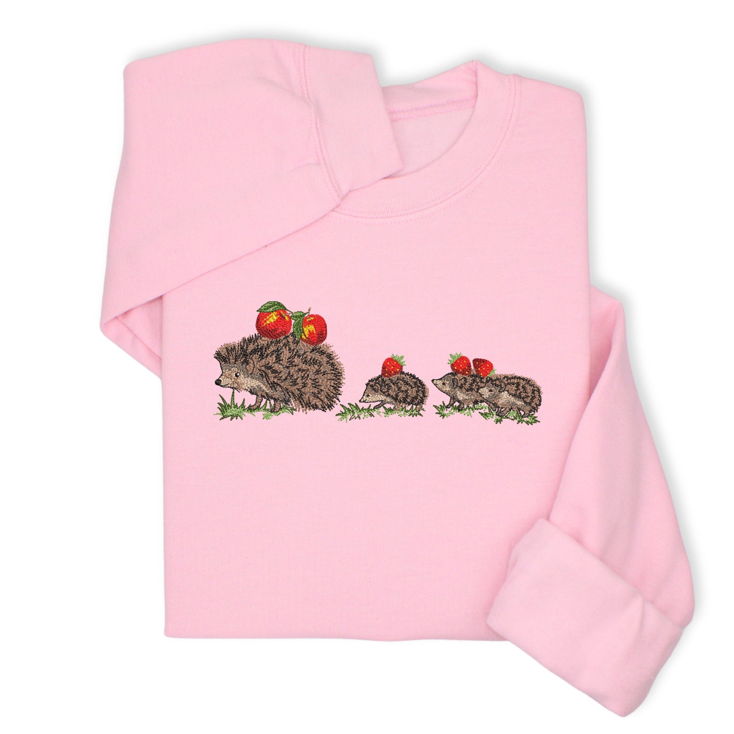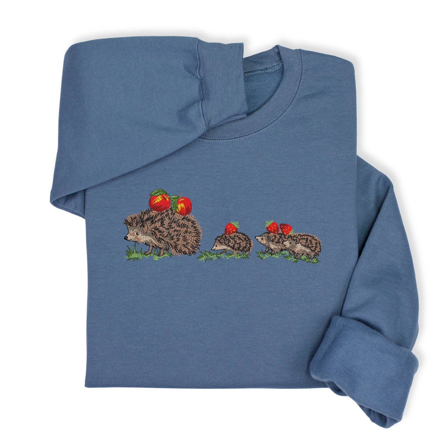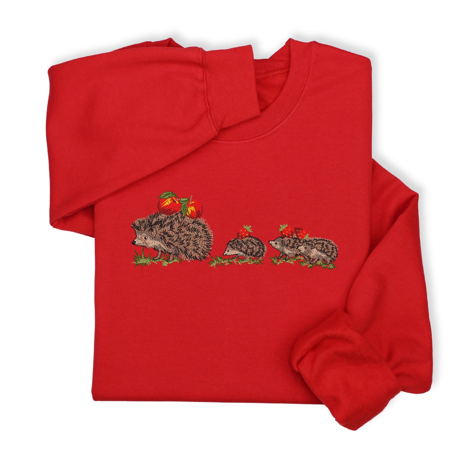 Wrap yourself in cozy charm with this adorable embroidered sweatshirt featuring a hedgehog family carrying strawberries and apples. A whimsical woodland design that adds a playful touch to any autumn or nature-inspired outfit.