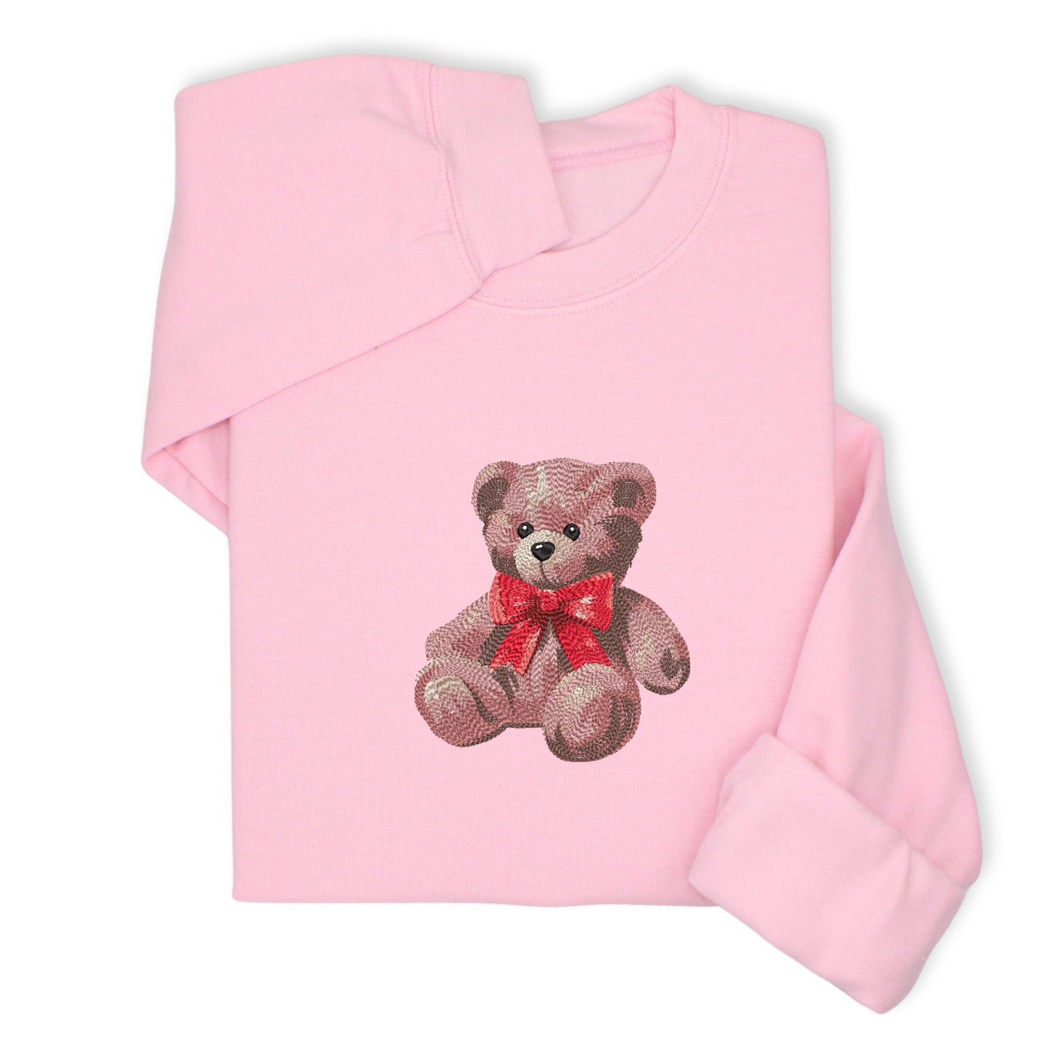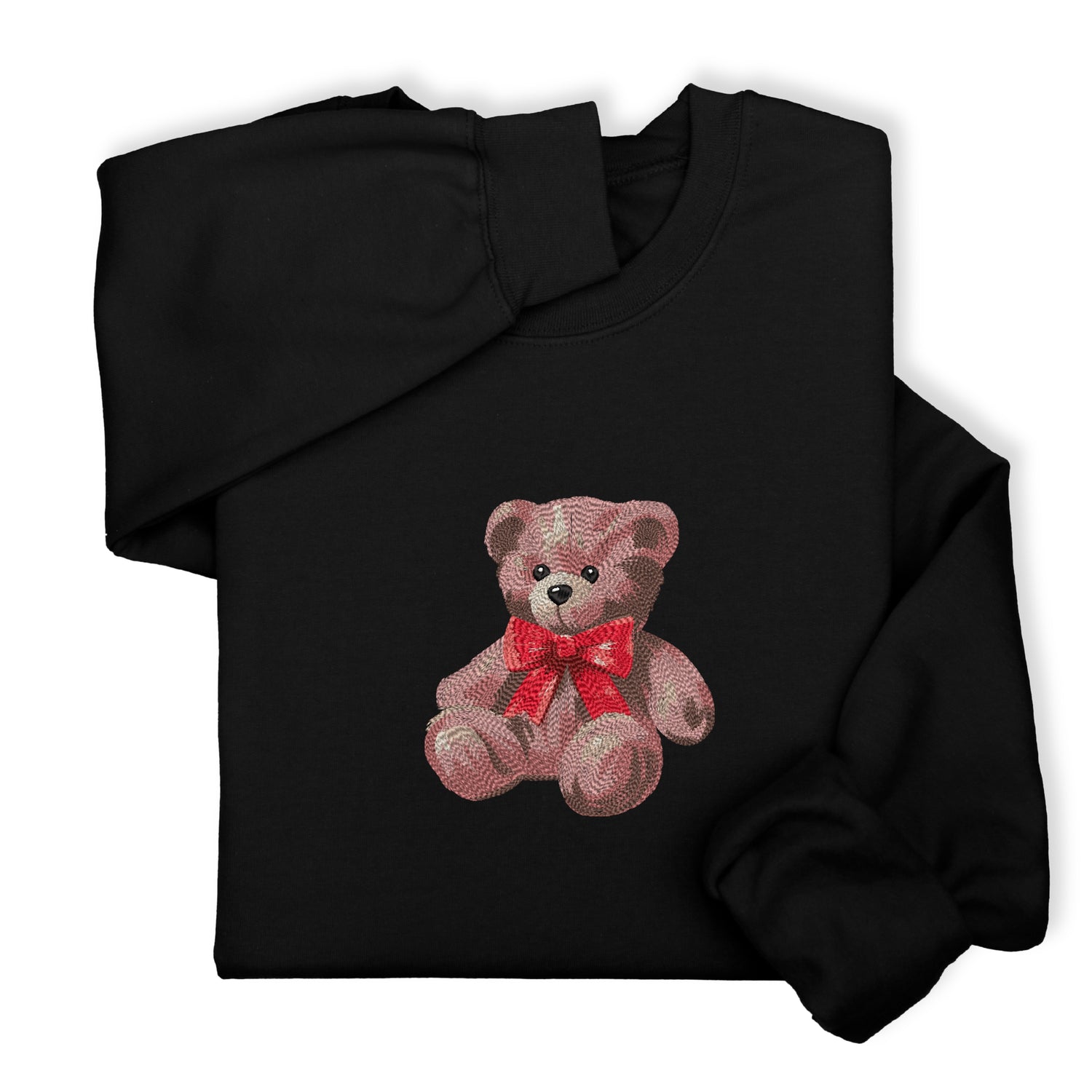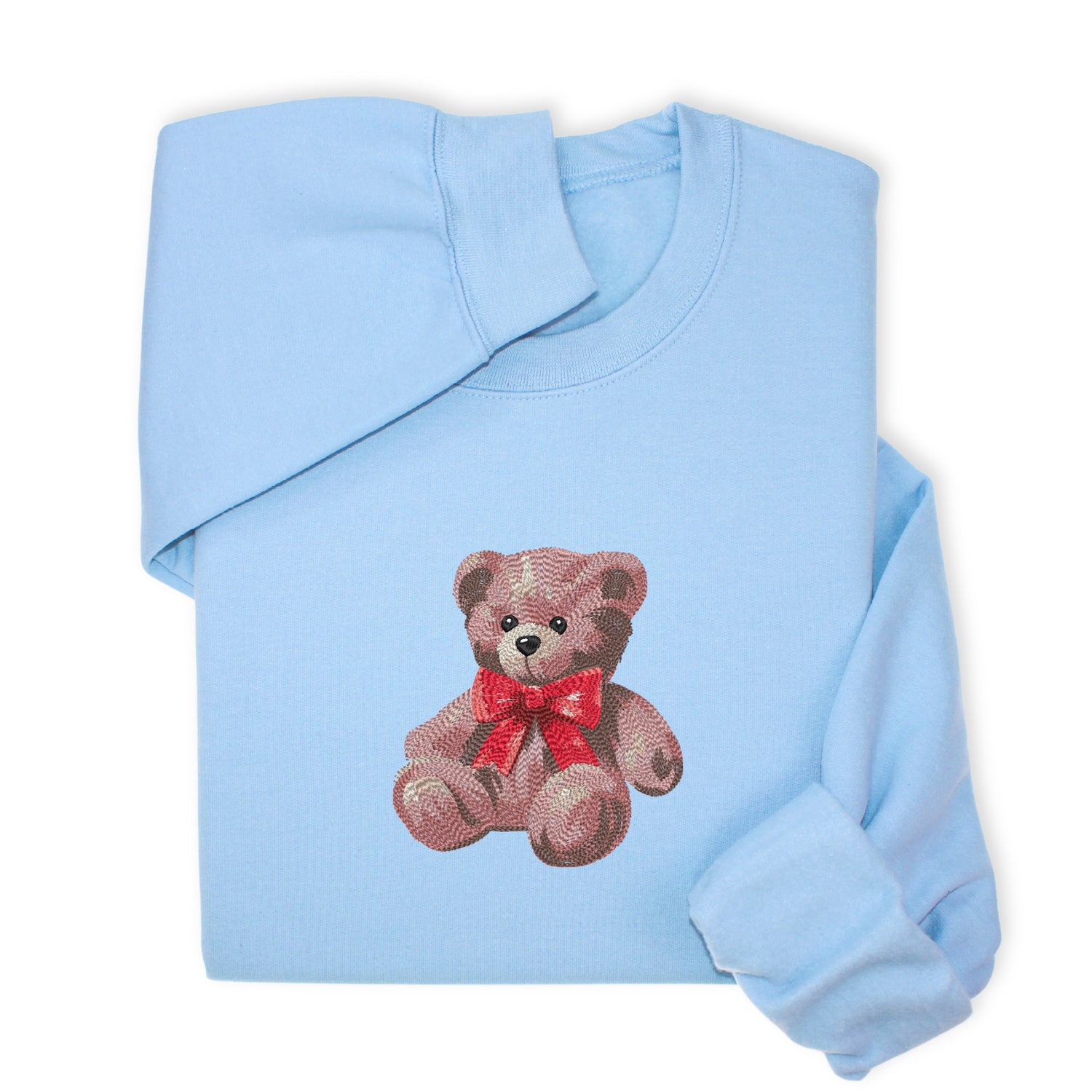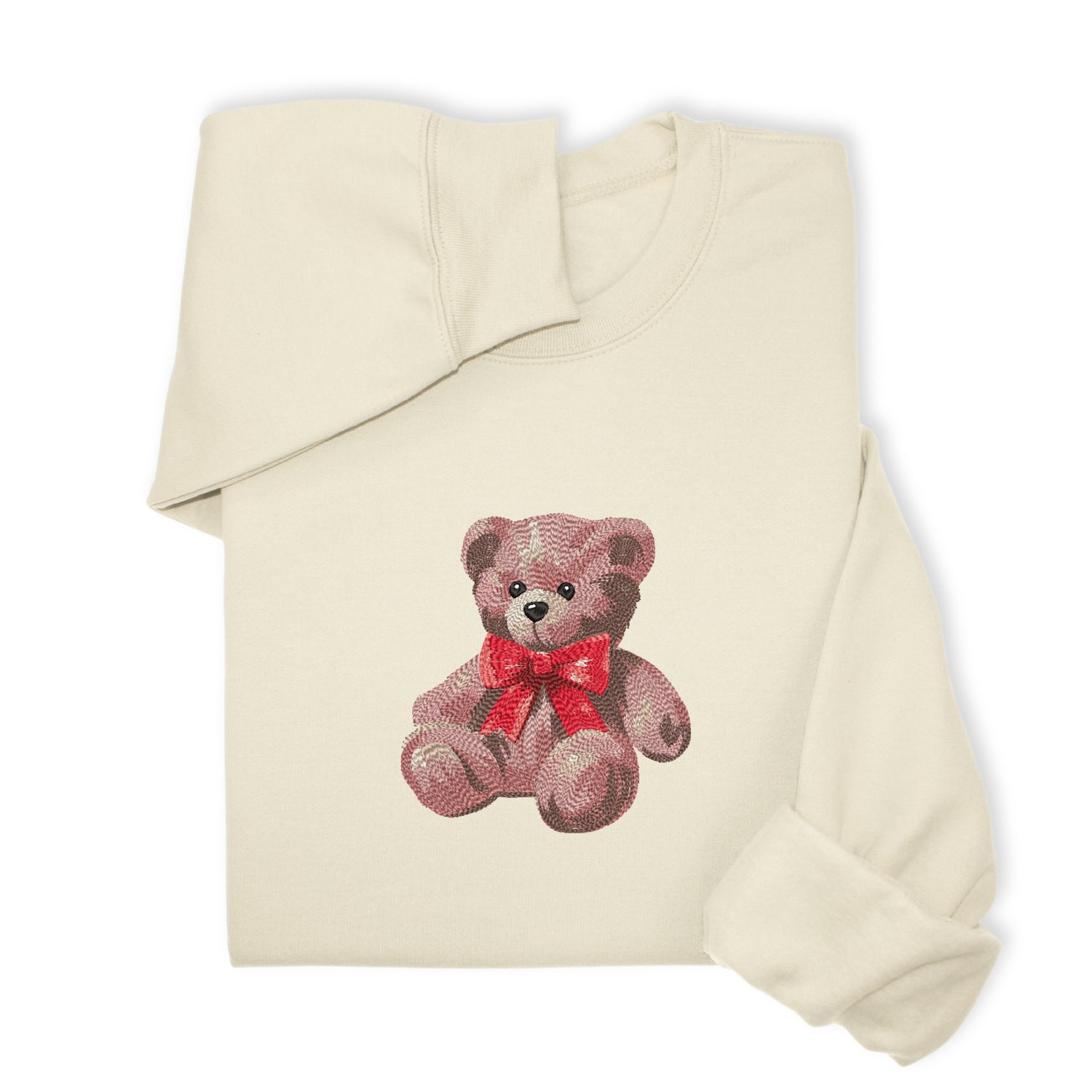 Teddy Bear Embroidered Sweatshirt & Hoodie, Cute Plush Toy Design, Cozy Red Bow Gift, Soft Aesthetic Loungewear, Whimsical Embroidery Outfit