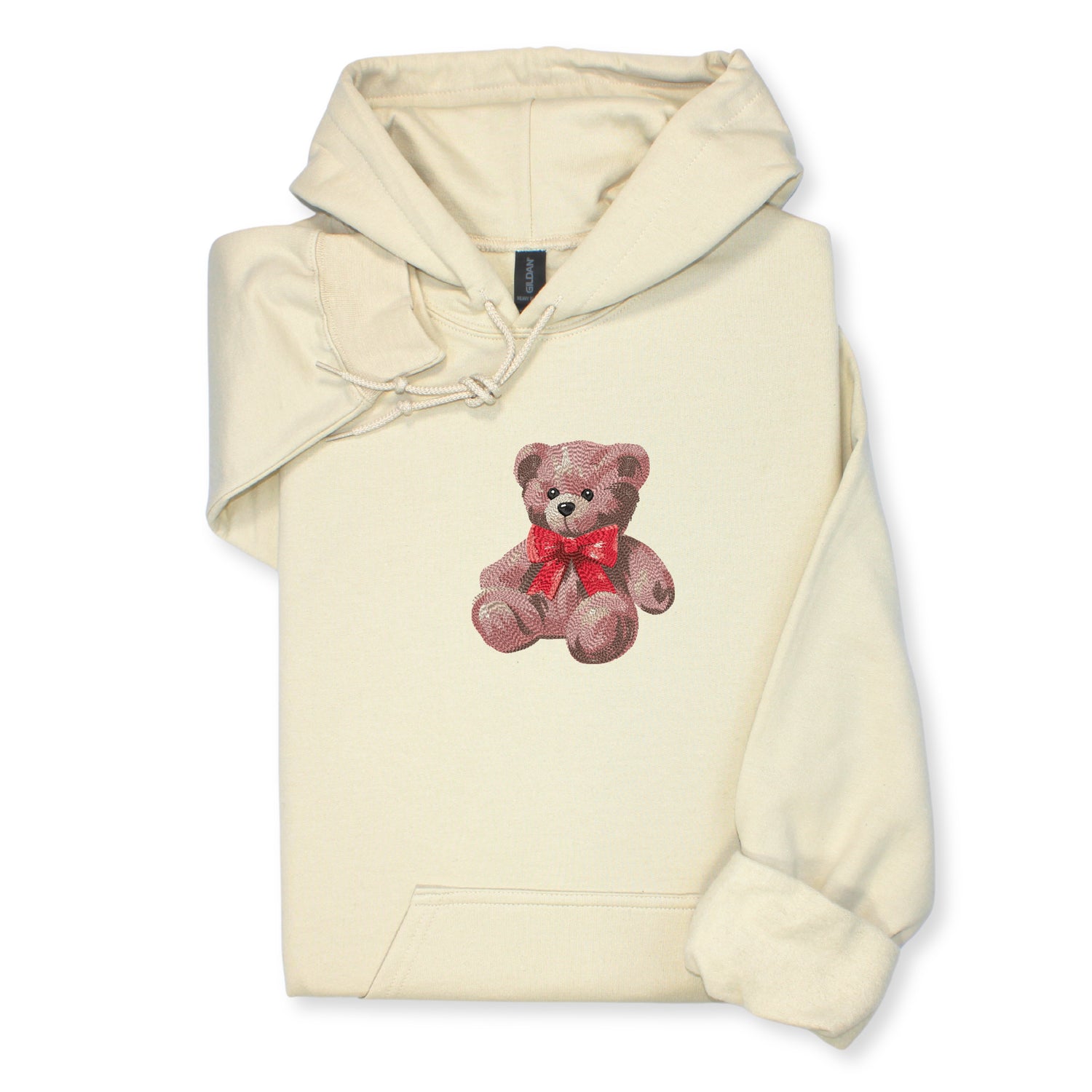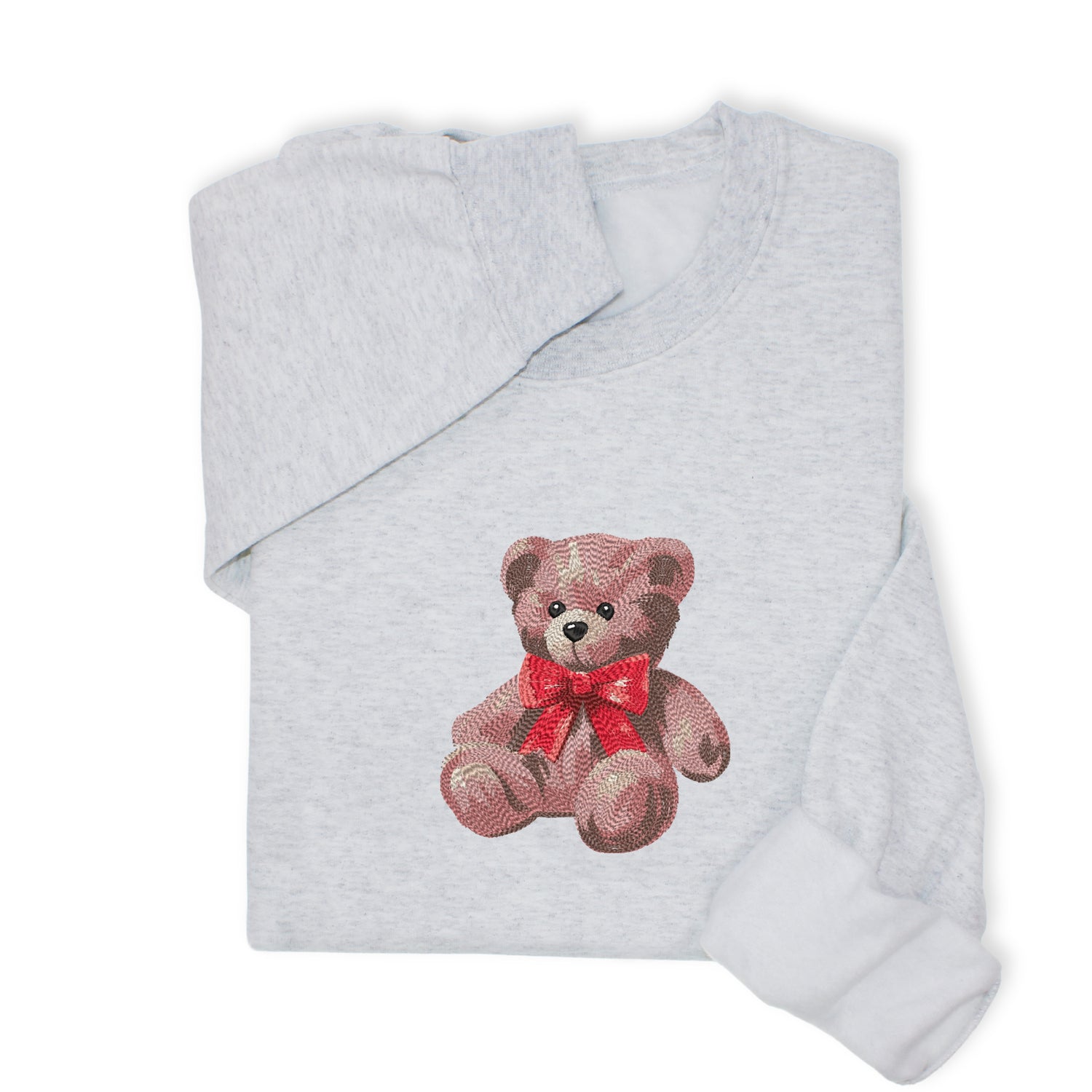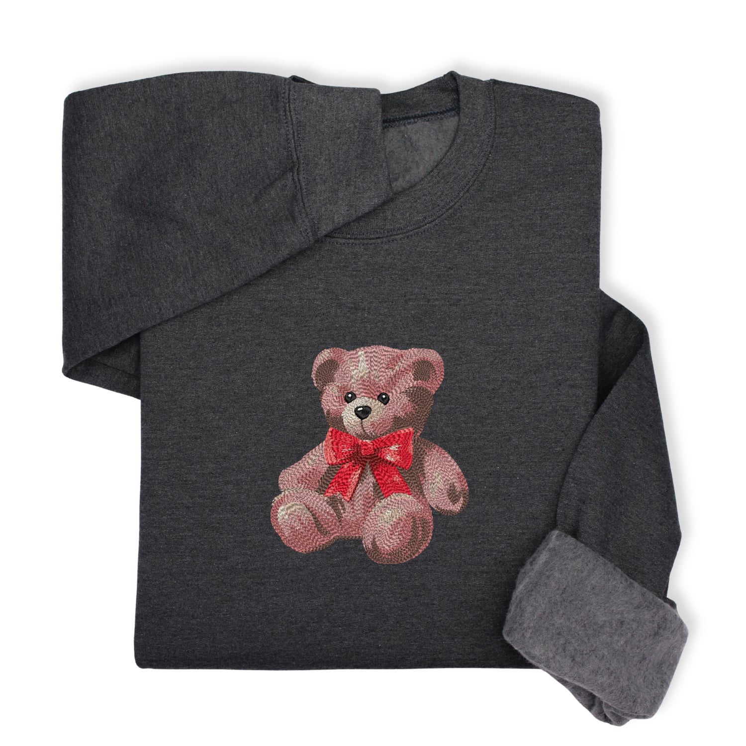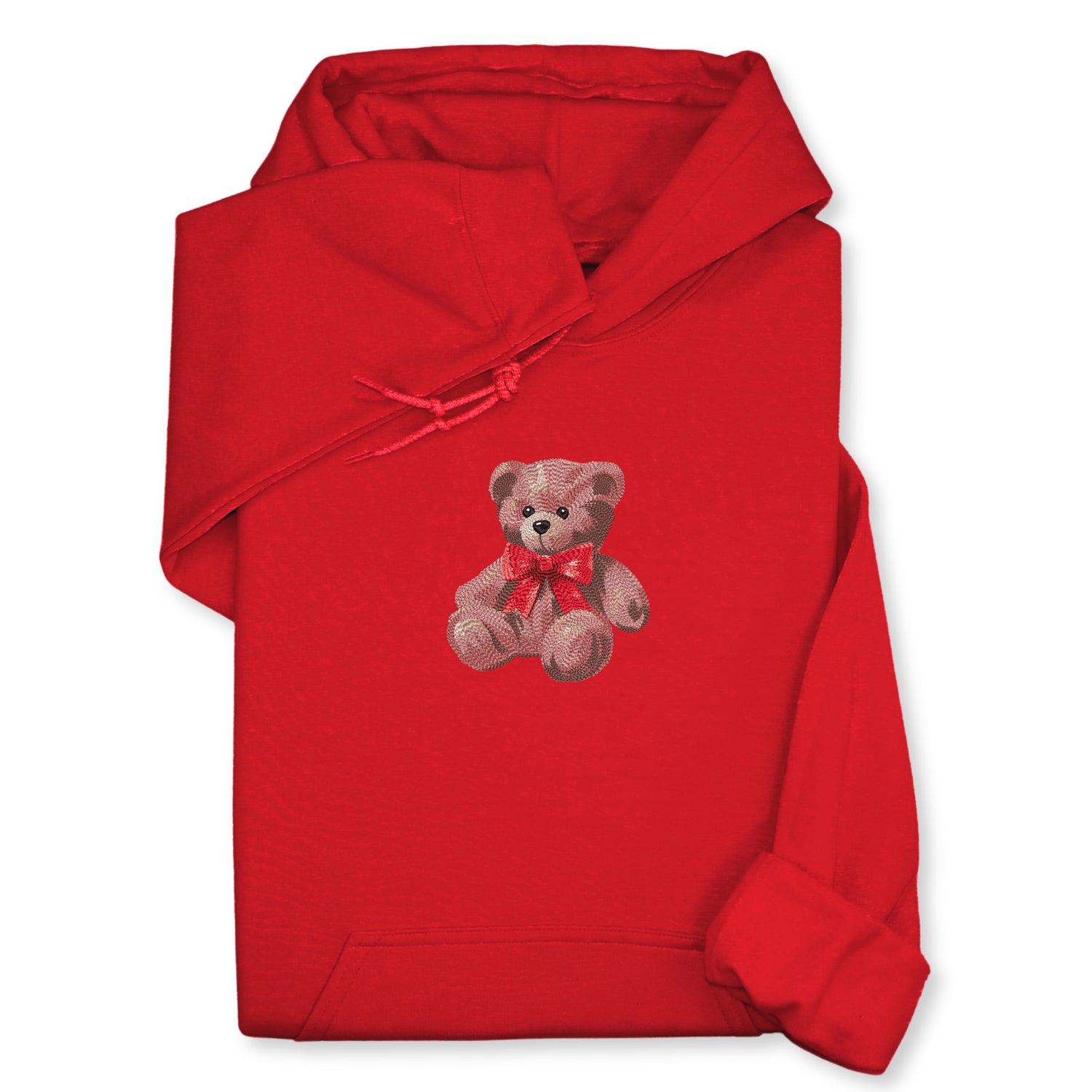 Teddy Bear Embroidered Sweatshirt & Hoodie, Cute Plush Toy Design, Cozy Red Bow Gift, Soft Aesthetic Loungewear, Whimsical Embroidery Outfit