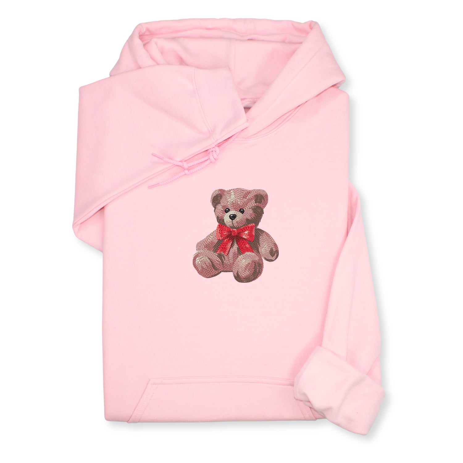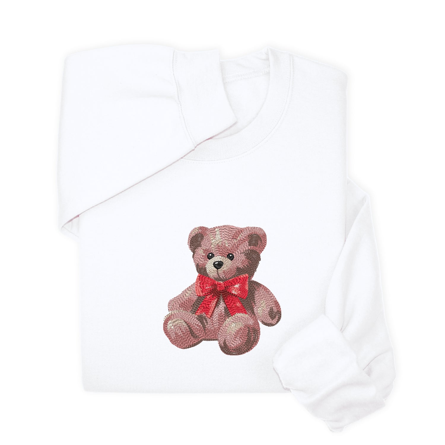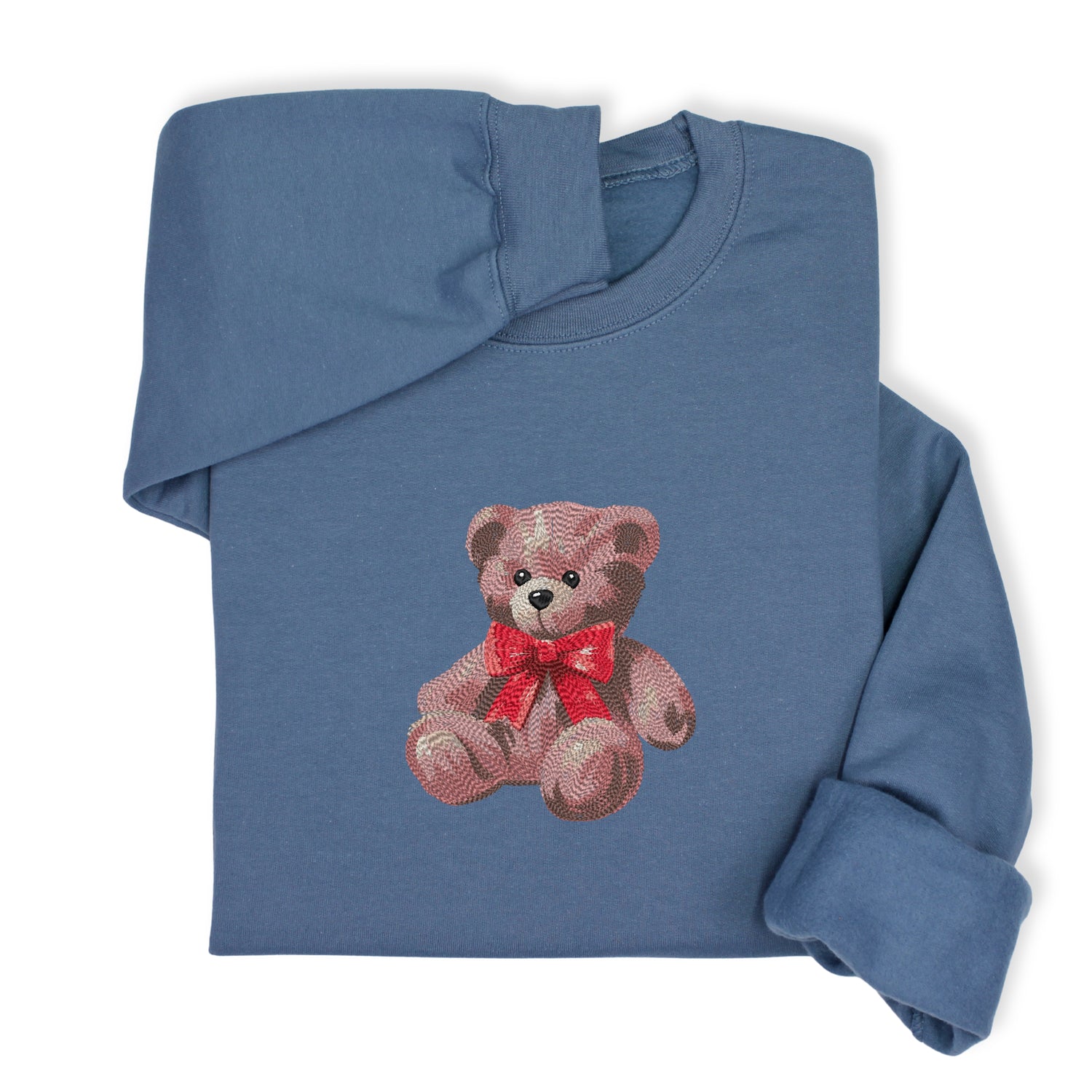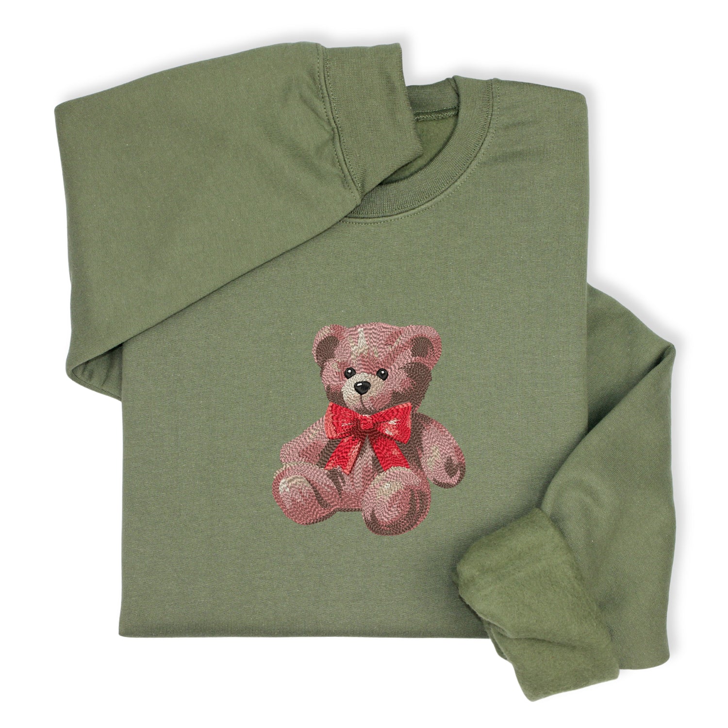 Teddy Bear Embroidered Sweatshirt & Hoodie, Cute Plush Toy Design, Cozy Red Bow Gift, Soft Aesthetic Loungewear, Whimsical Embroidery Outfit