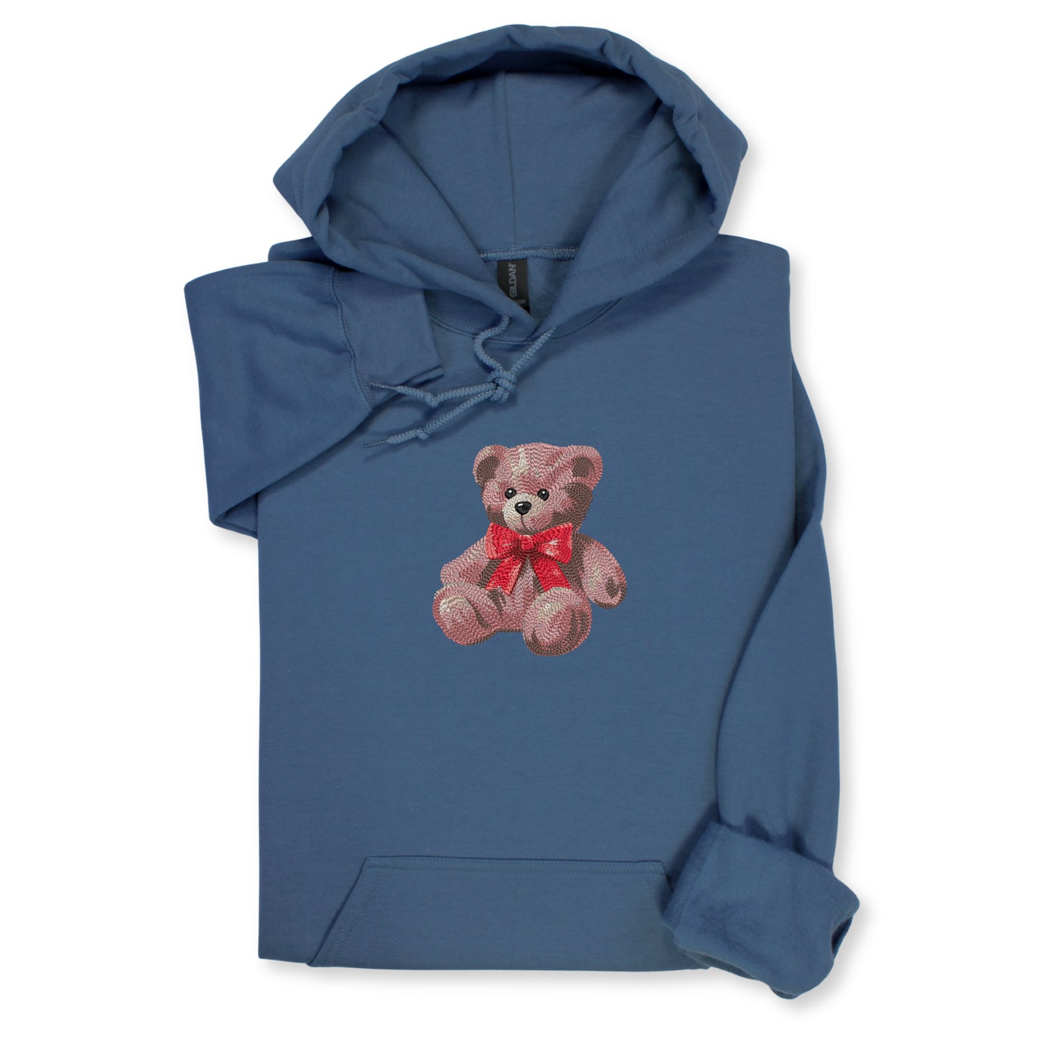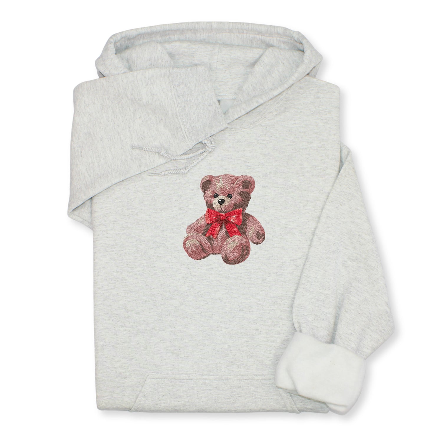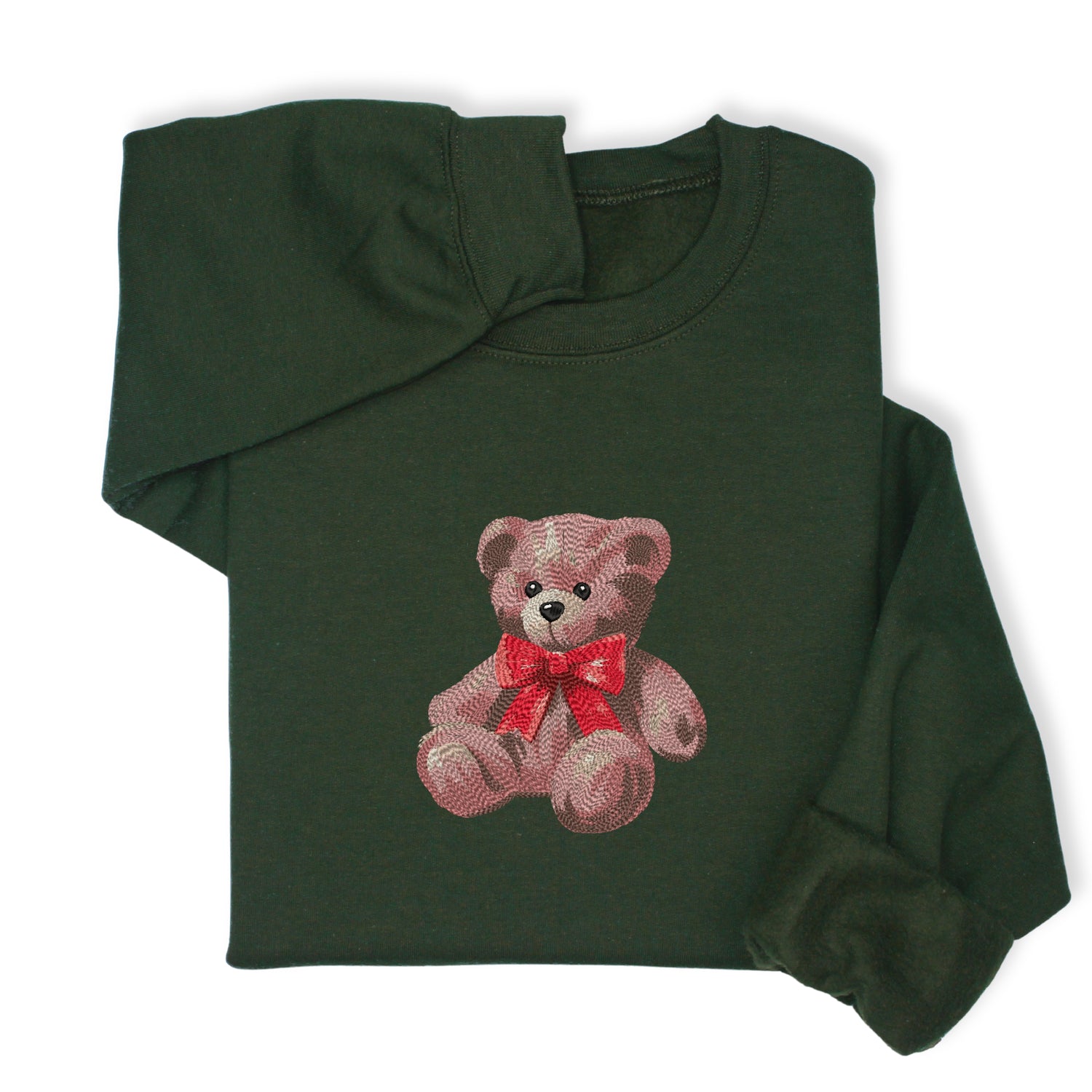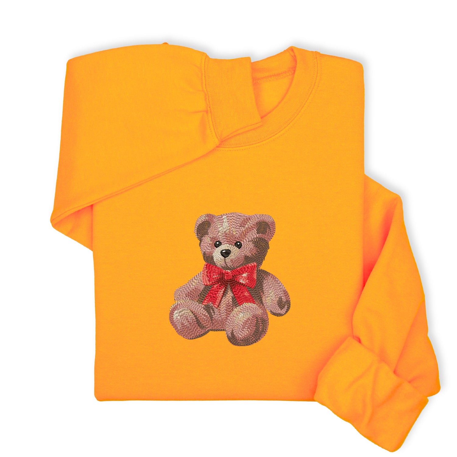 Teddy Bear Embroidered Sweatshirt & Hoodie, Cute Plush Toy Design, Cozy Red Bow Gift, Soft Aesthetic Loungewear, Whimsical Embroidery Outfit