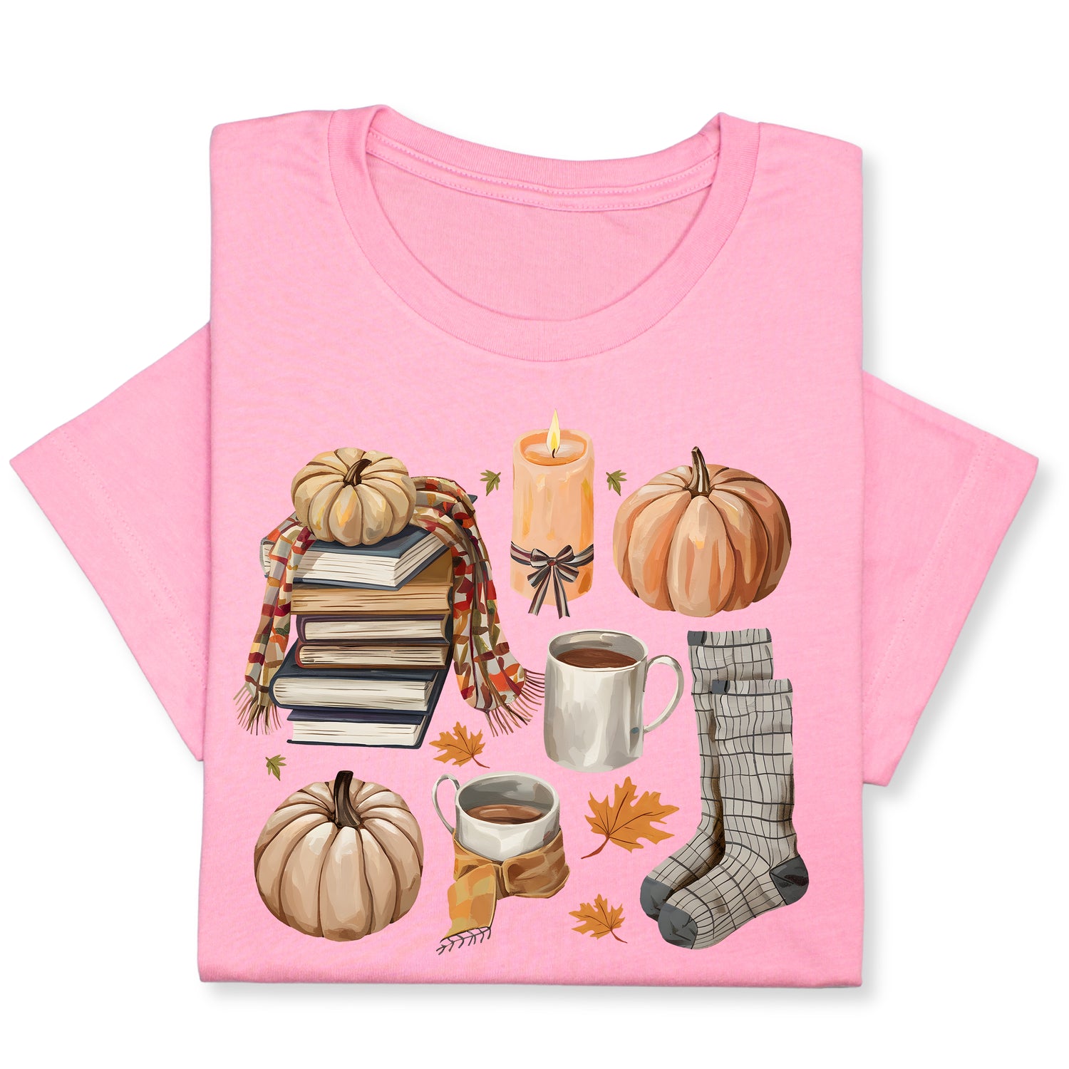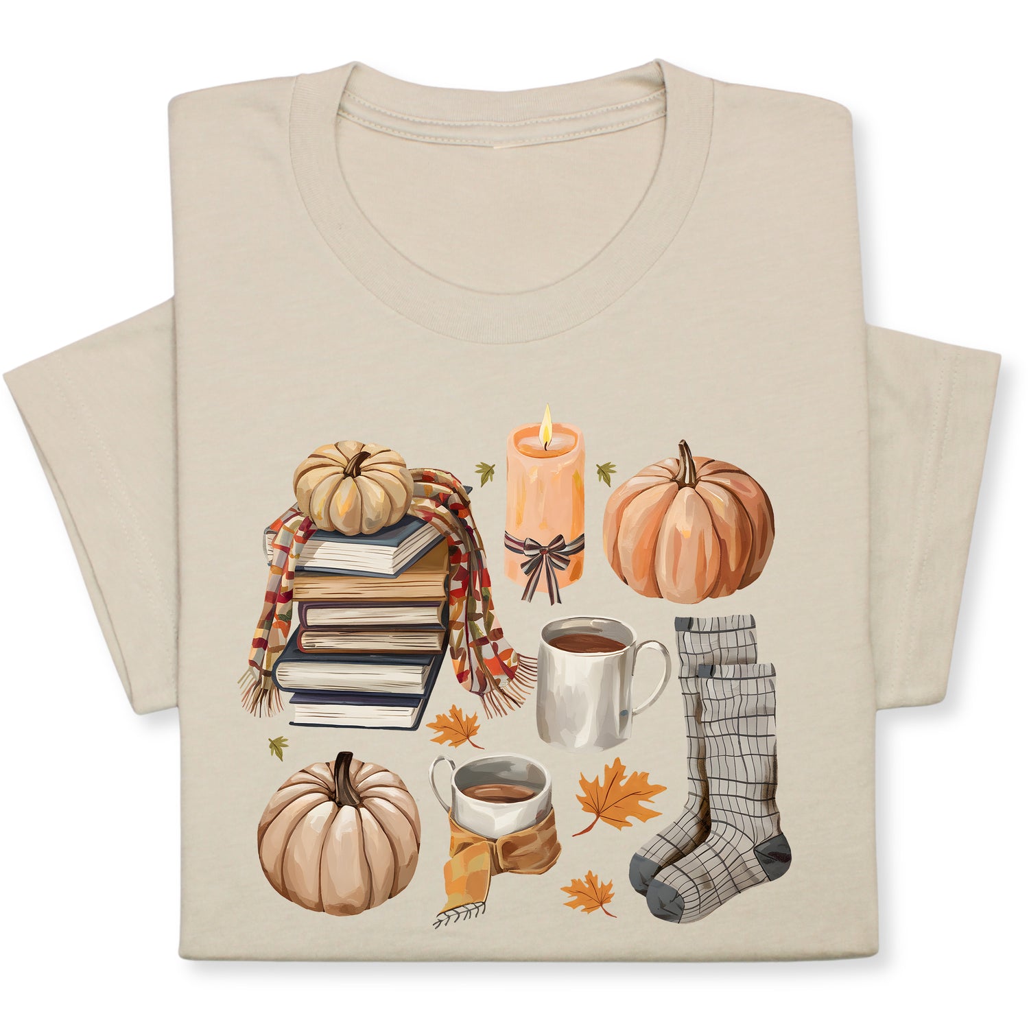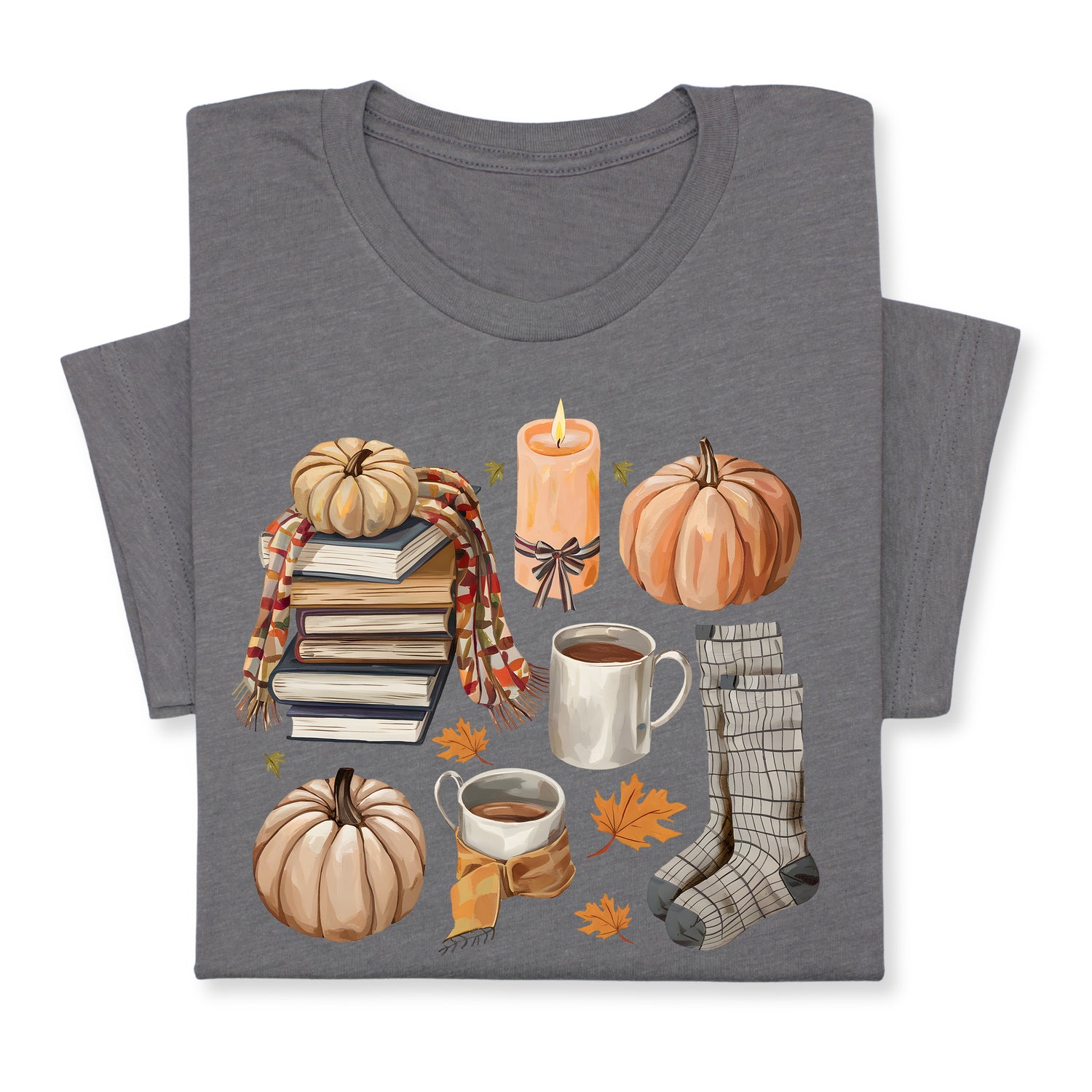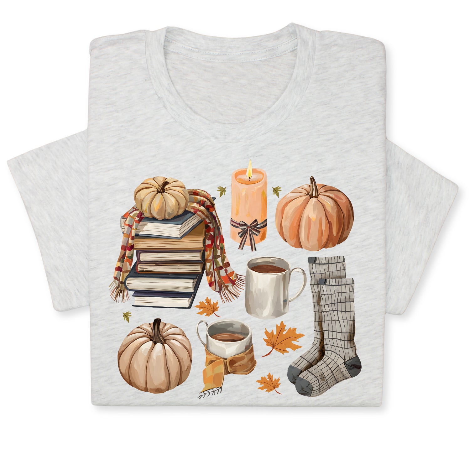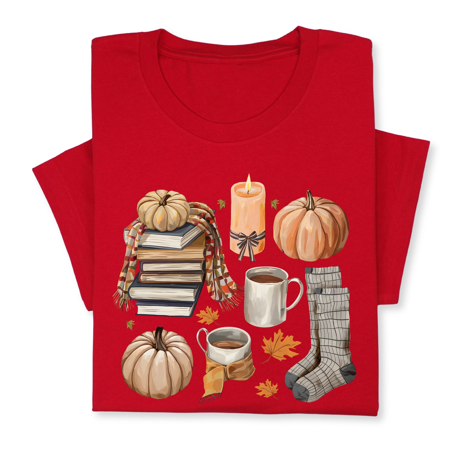 Cozy Fall Season T-Shirt – Autumn Books, Pumpkins/Coffee Print Tee, Candle & Socks Graphic Shirt, Cute Thanksgiving Gift for Her