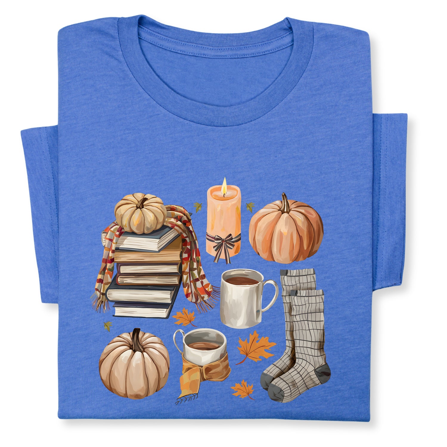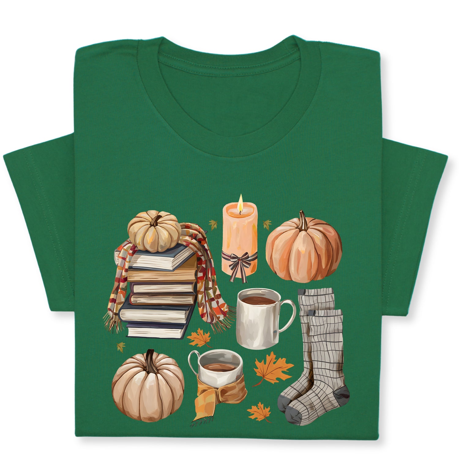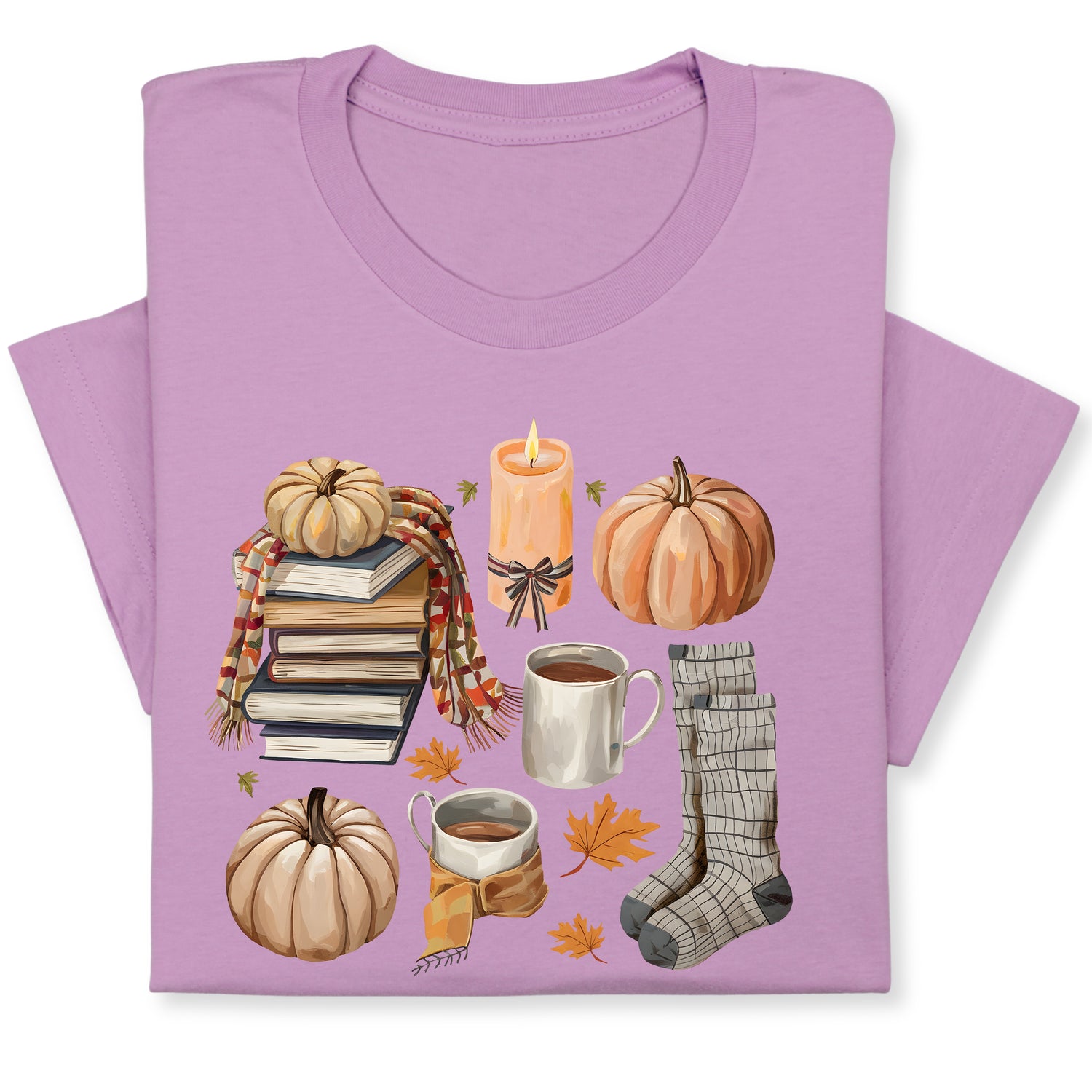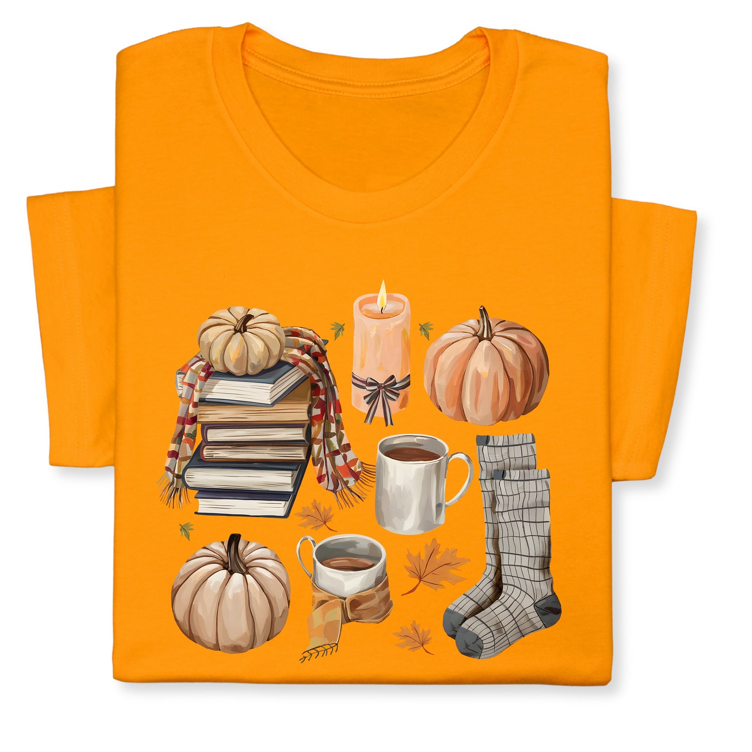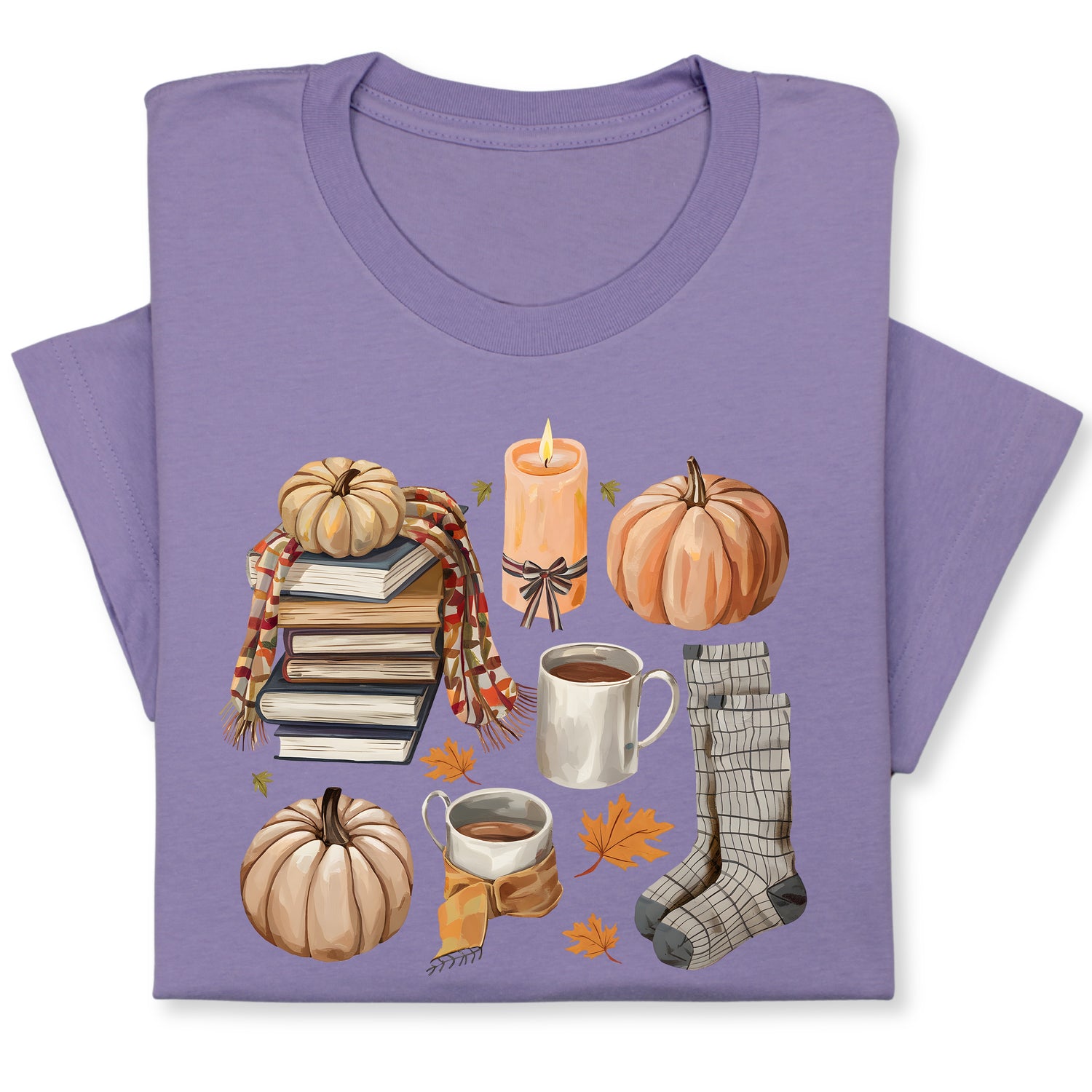 Cozy Fall Season T-Shirt – Autumn Books, Pumpkins/Coffee Print Tee, Candle & Socks Graphic Shirt, Cute Thanksgiving Gift for Her
