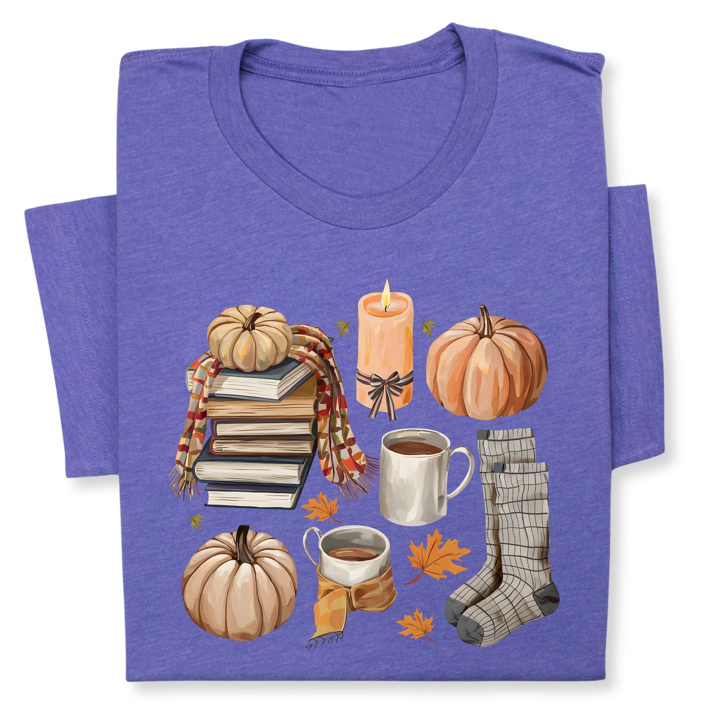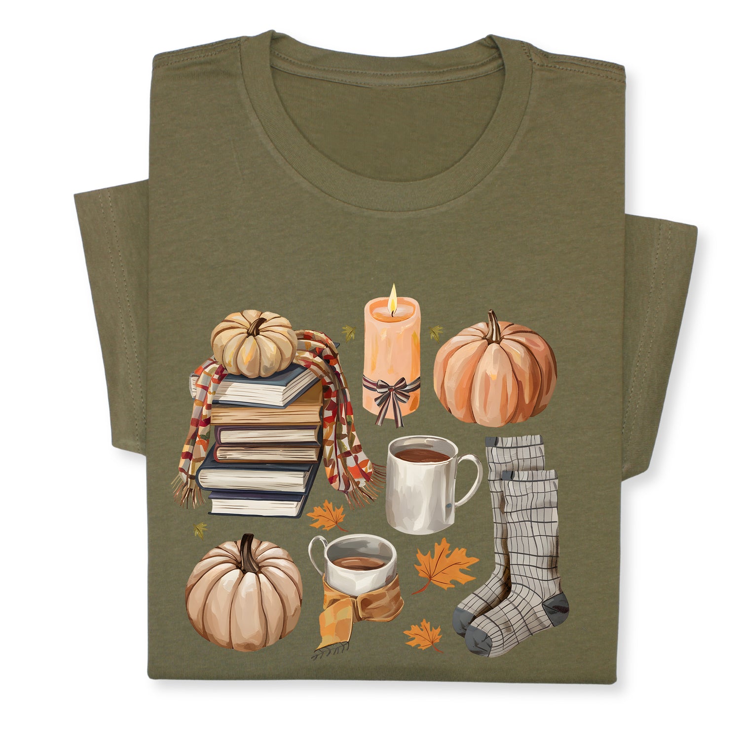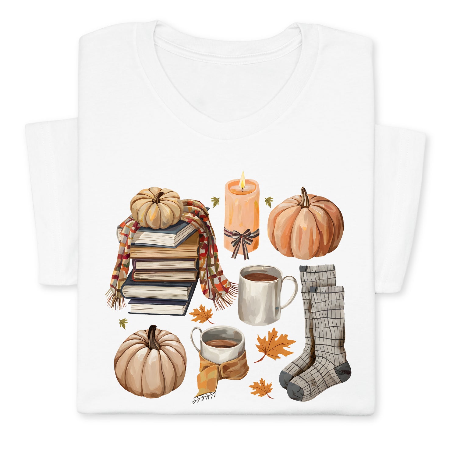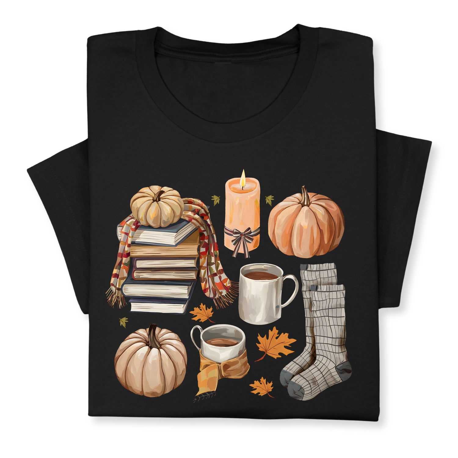 Wrap yourself in cozy autumn vibes with this fall-themed t-shirt featuring pumpkins, candles, books, warm drinks, and socks — the ultimate celebration of sweater weather and slow, peaceful moments.