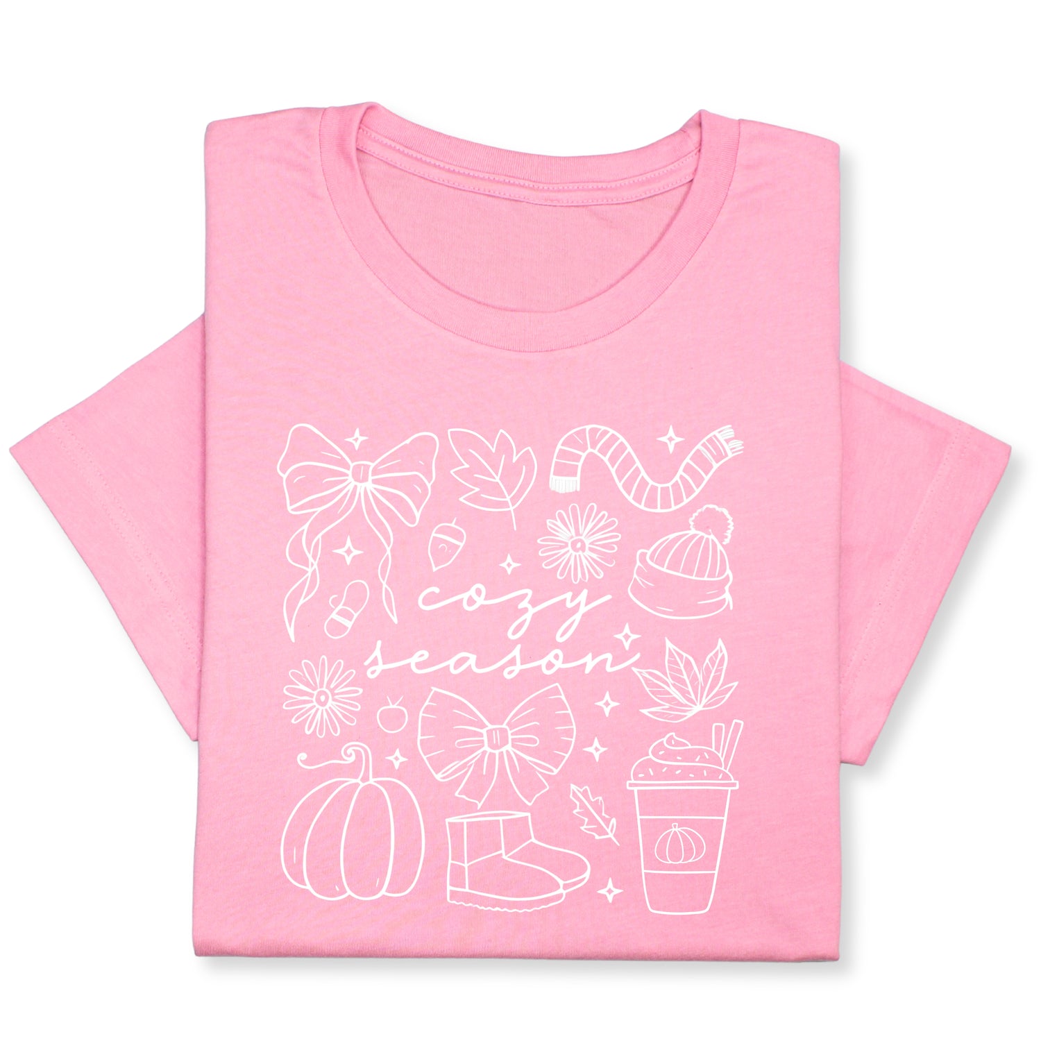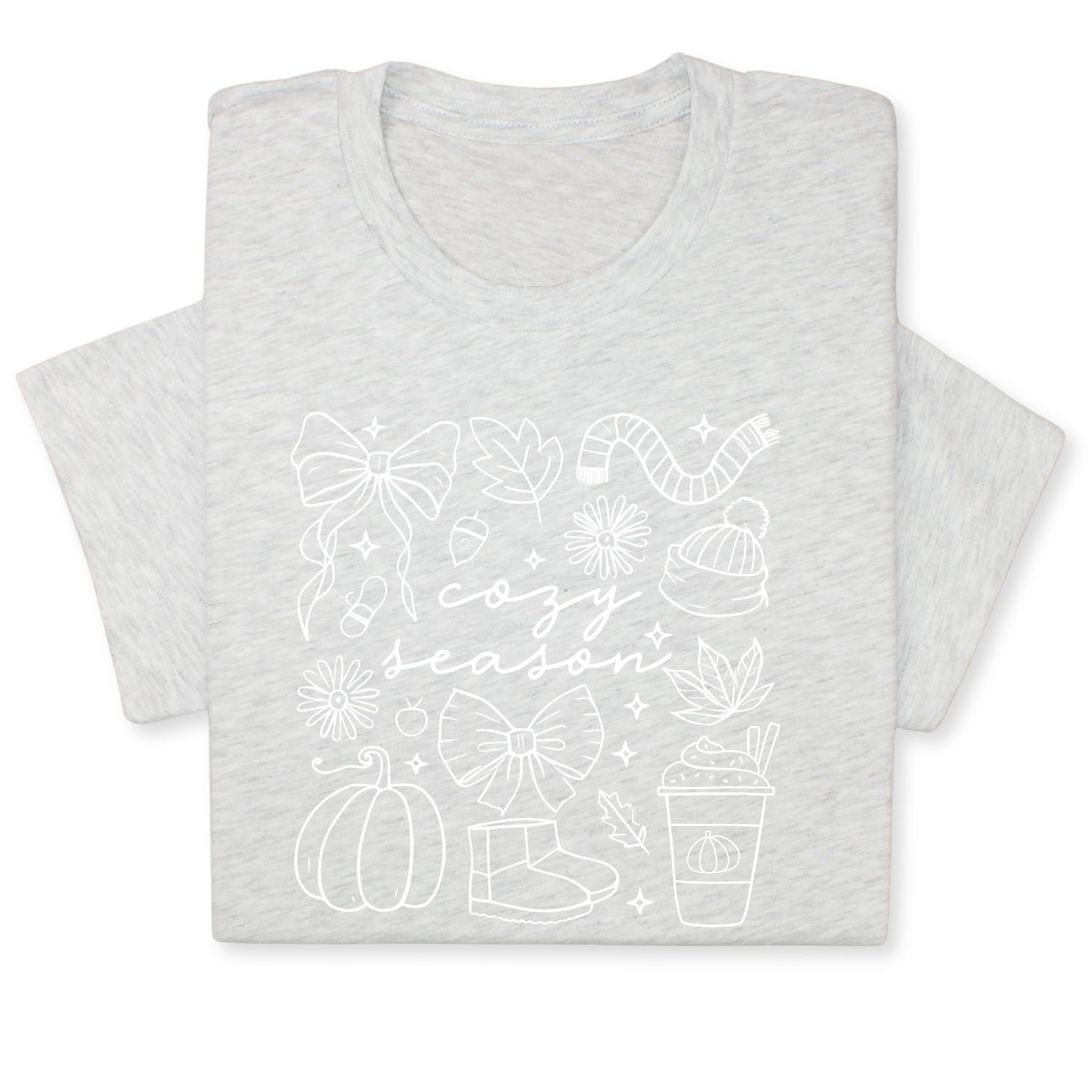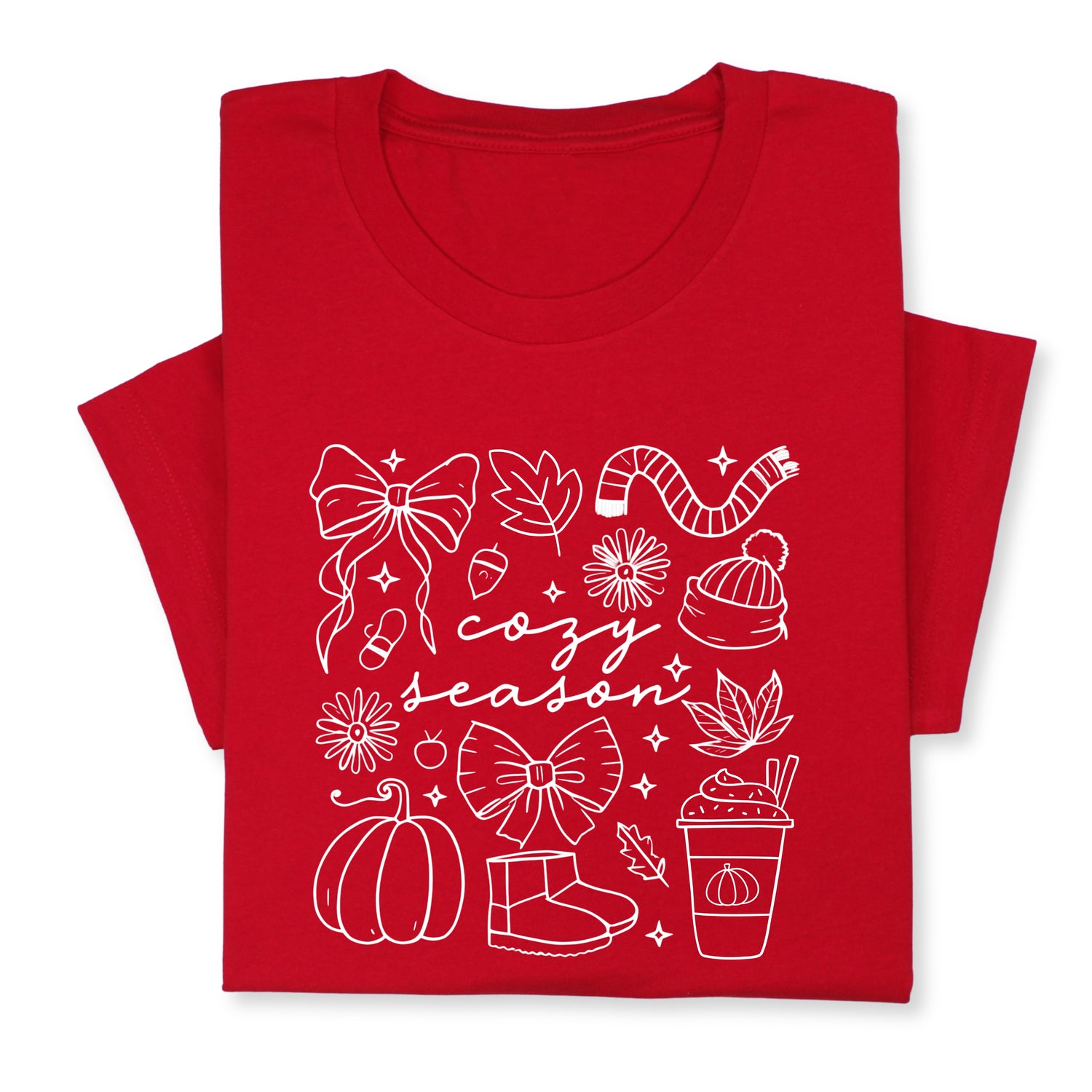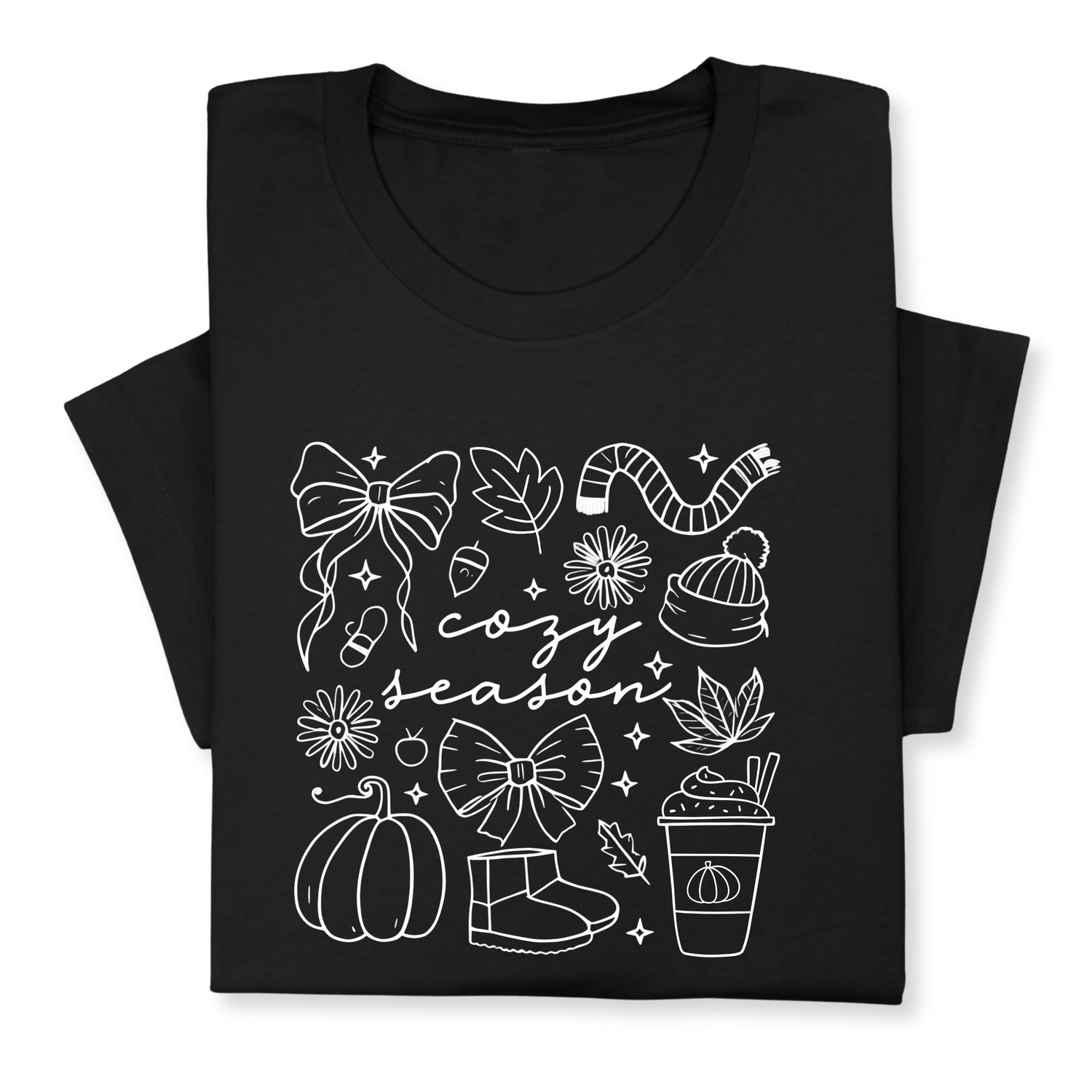 Celebrate the cozy charm of fall with this adorable "Cozy Season" t-shirt! Featuring hand-drawn white doodles of pumpkins, bows, warm drinks & fall accessories, it's perfect for chilly days and comfy vibes.