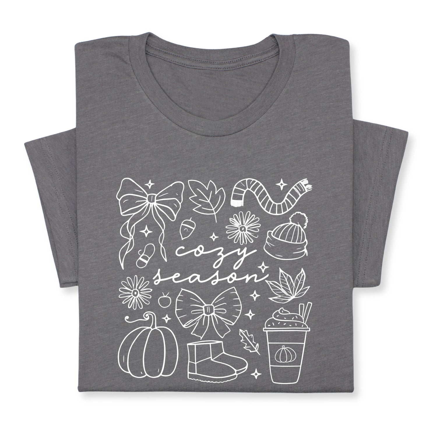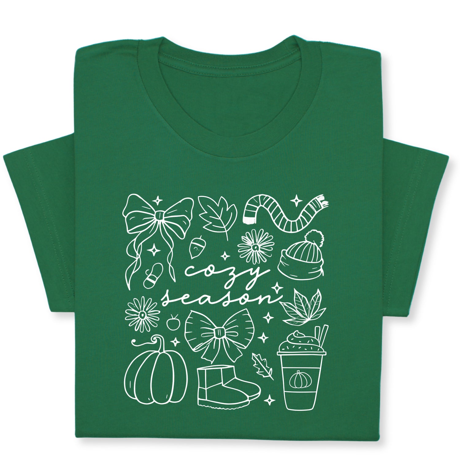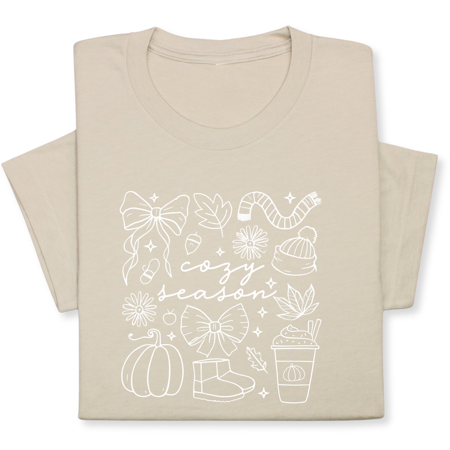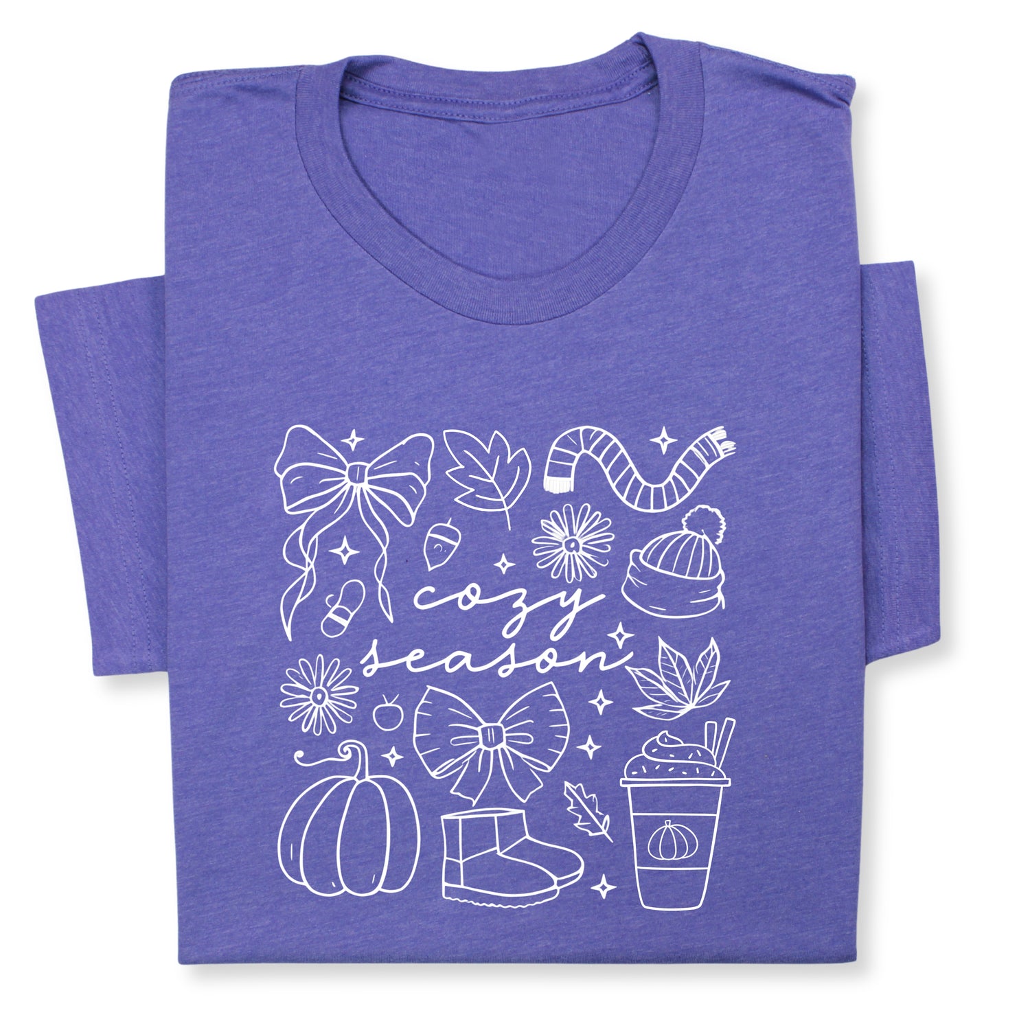 Celebrate the cozy charm of fall with this adorable "Cozy Season" t-shirt! Featuring hand-drawn white doodles of pumpkins, bows, warm drinks & fall accessories, it's perfect for chilly days and comfy vibes.