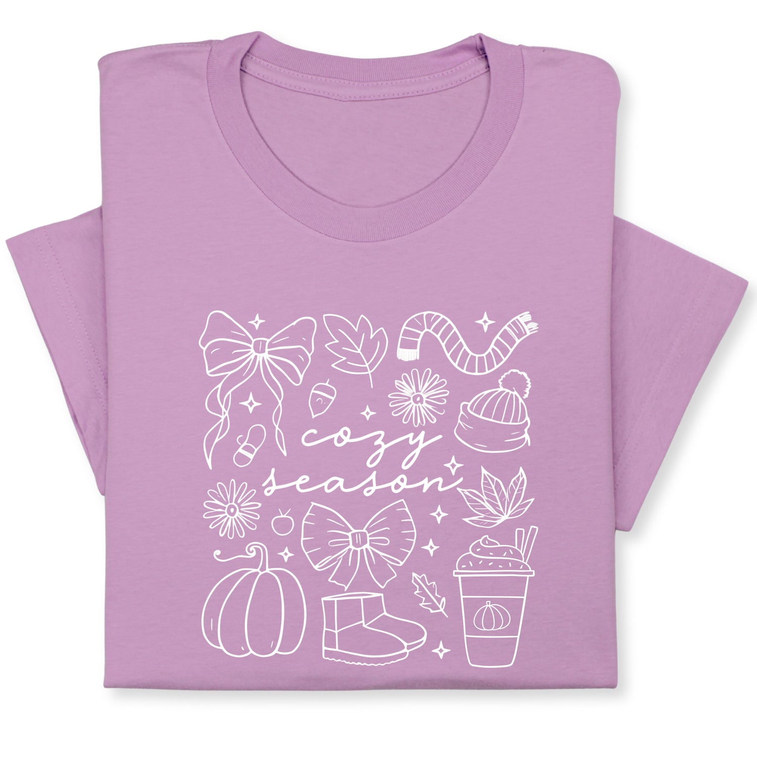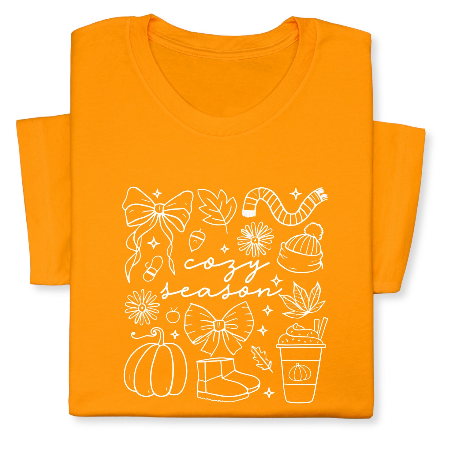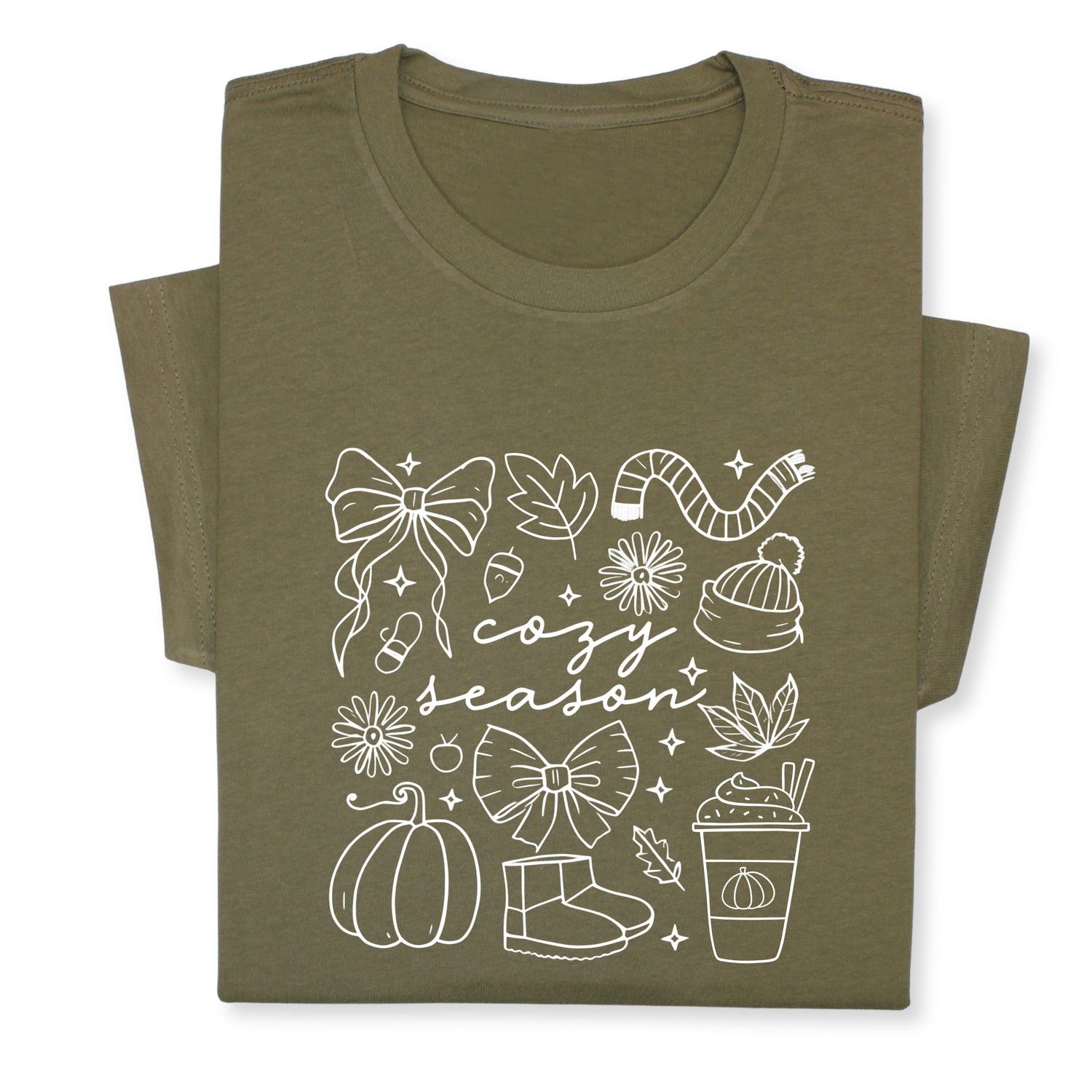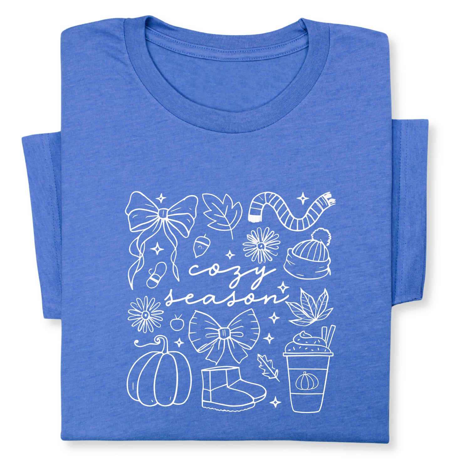 Celebrate the cozy charm of fall with this adorable "Cozy Season" t-shirt! Featuring hand-drawn white doodles of pumpkins, bows, warm drinks & fall accessories, it's perfect for chilly days and comfy vibes.