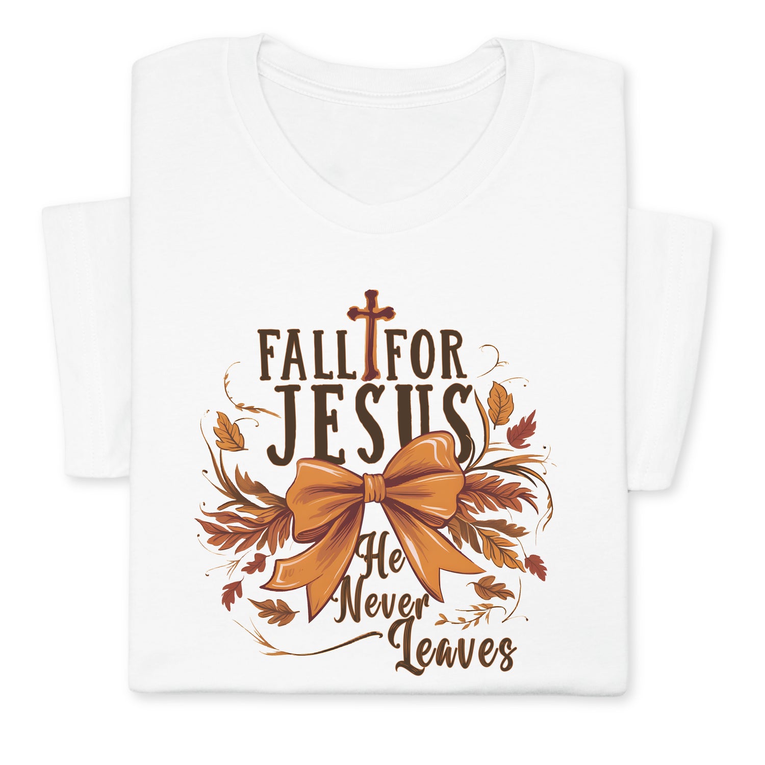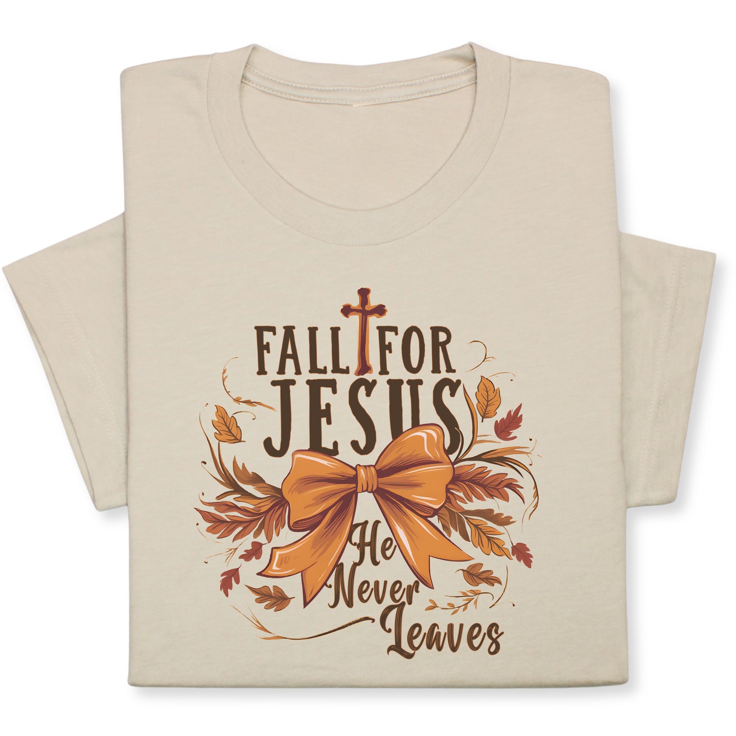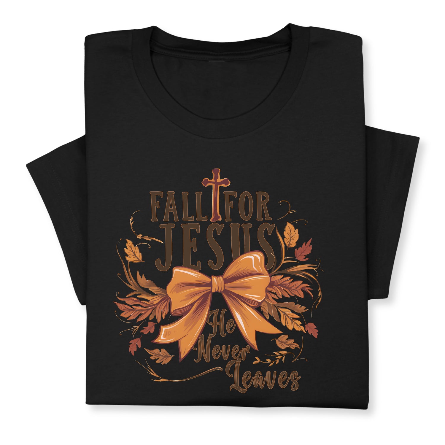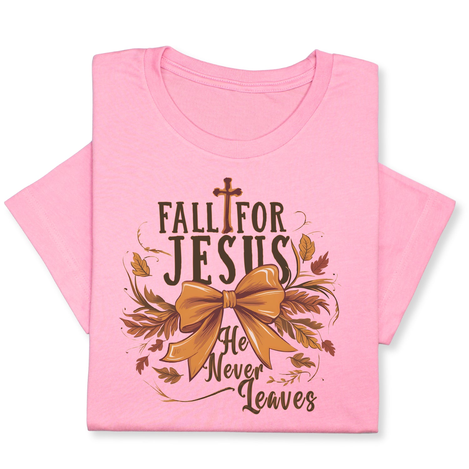 Fall for Jesus T-Shirt – Christian Autumn Tee with Bow & Leaves, Faith-Based Thanksgiving Shirt, Religious Gift for Her or Him