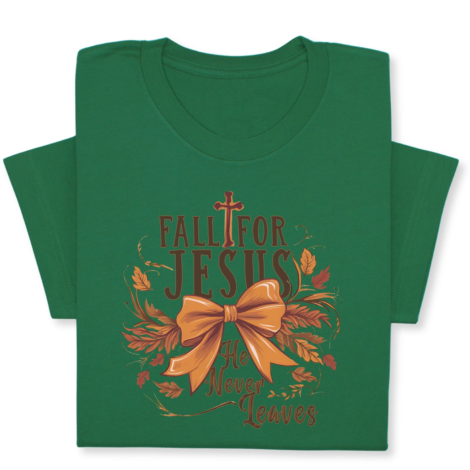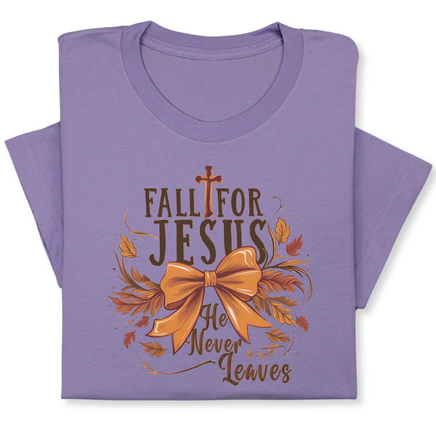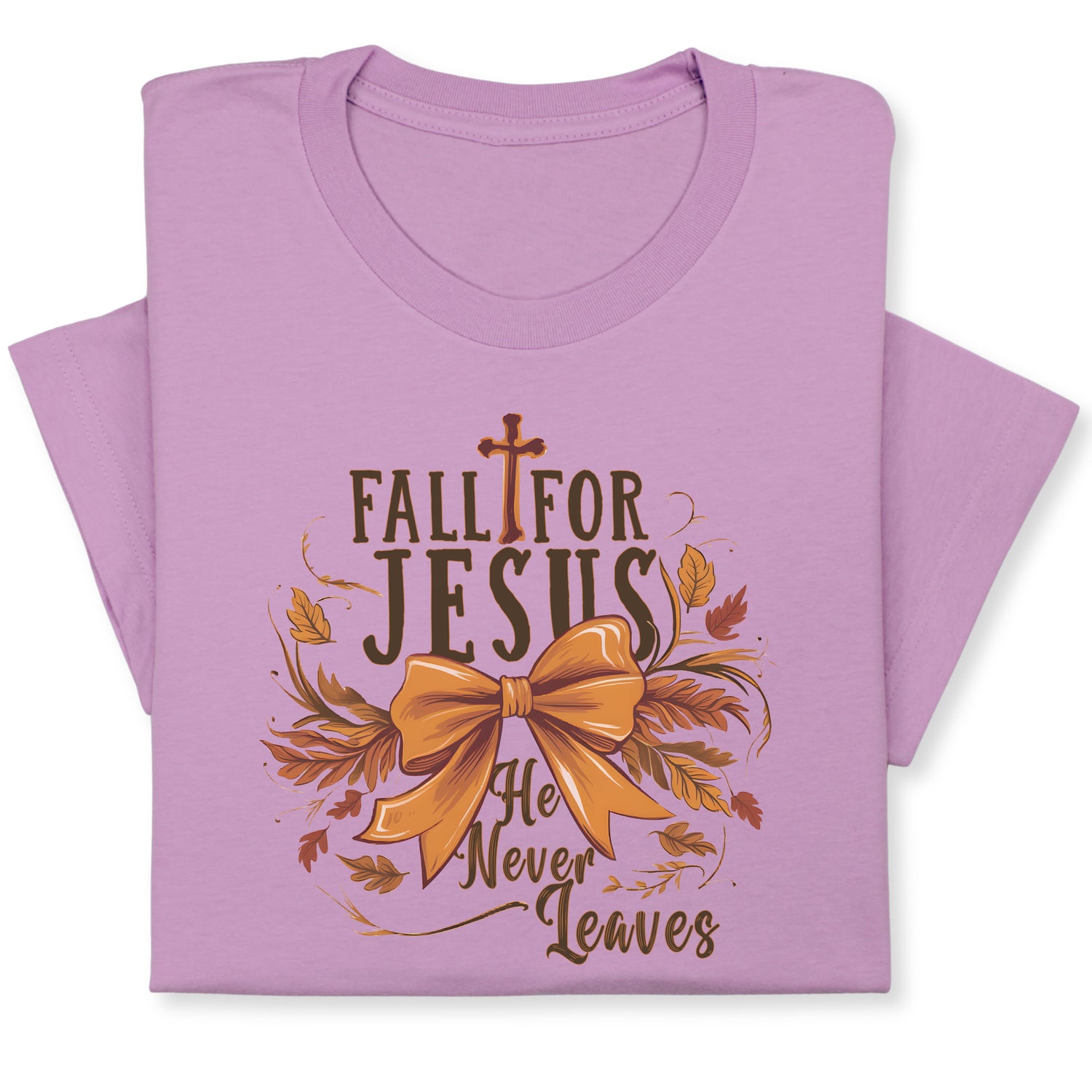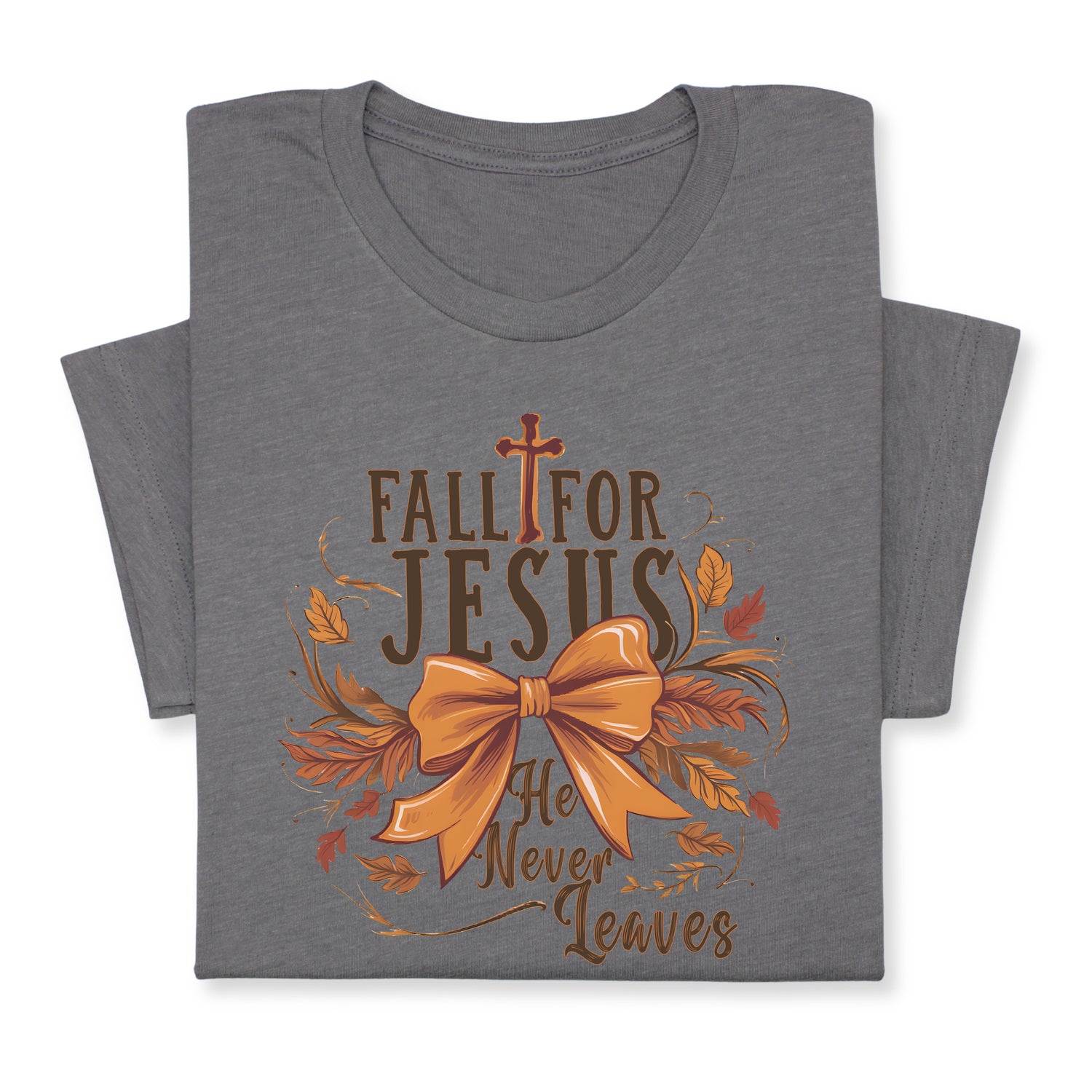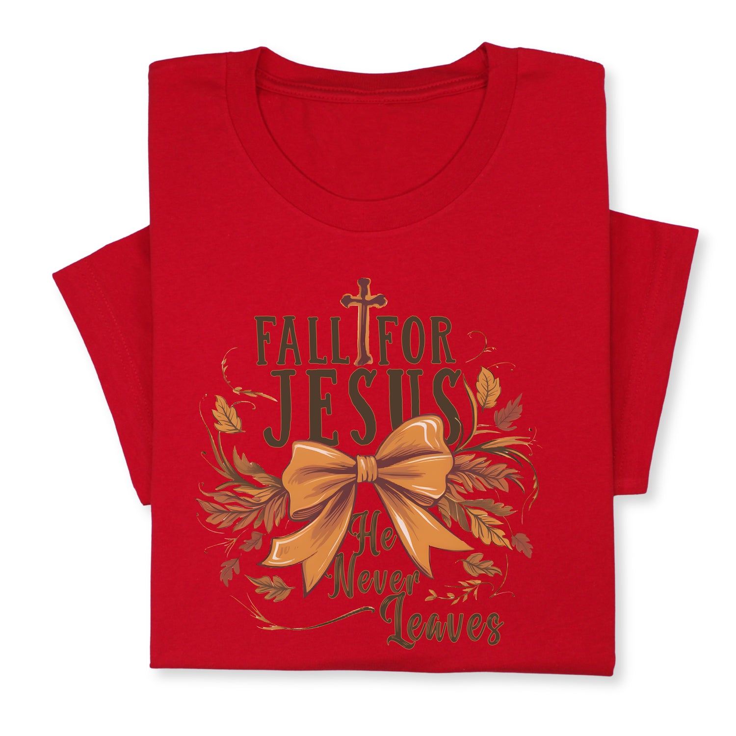 Fall for Jesus T-Shirt – Christian Autumn Tee with Bow & Leaves, Faith-Based Thanksgiving Shirt, Religious Gift for Her or Him