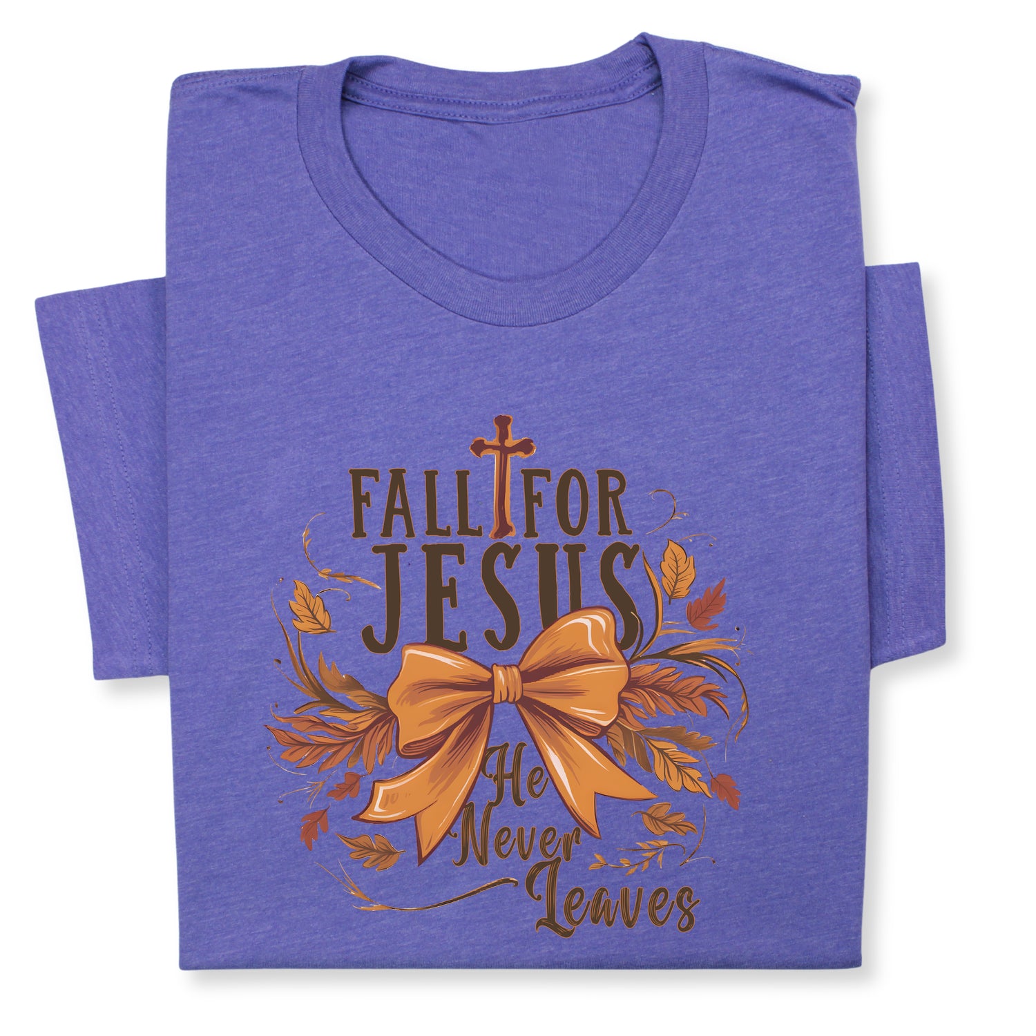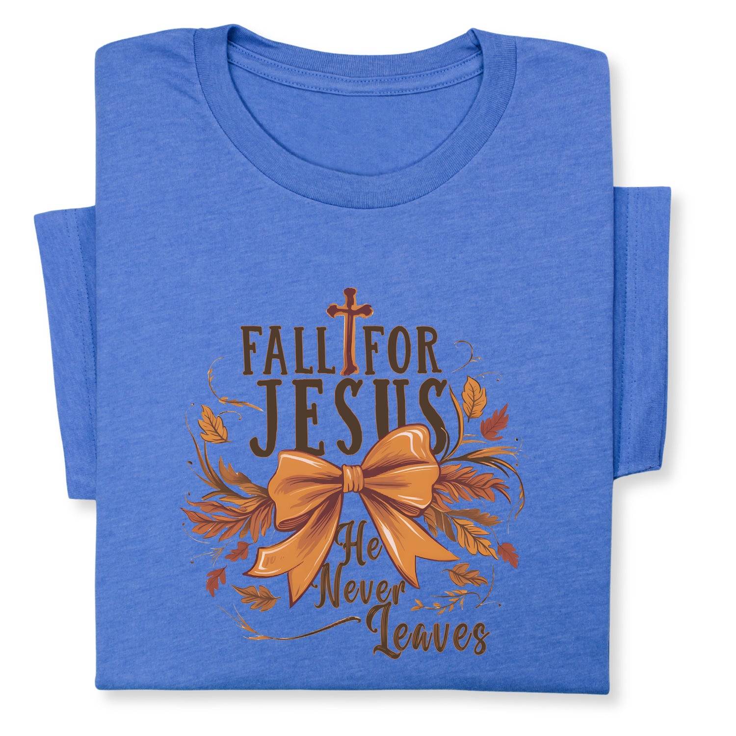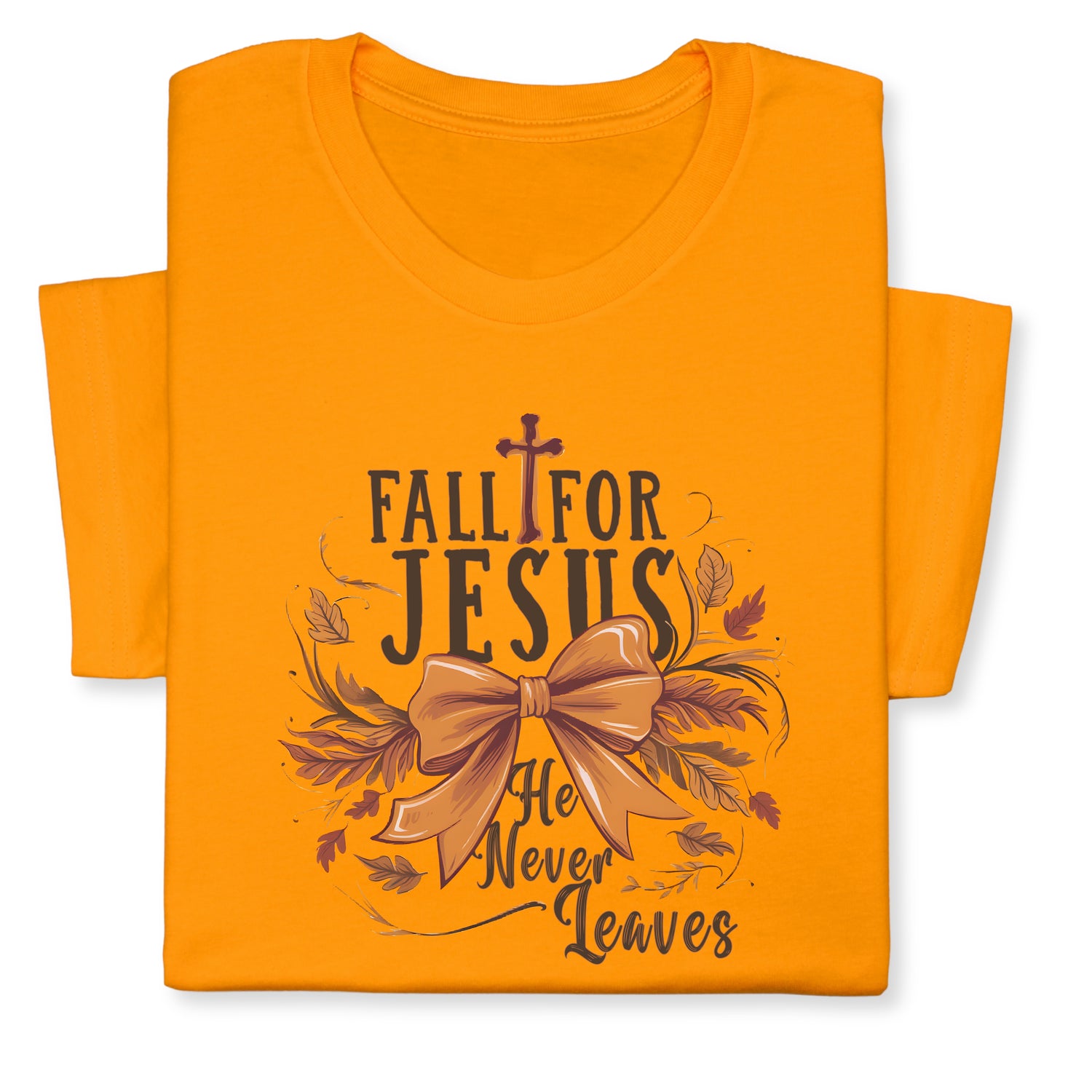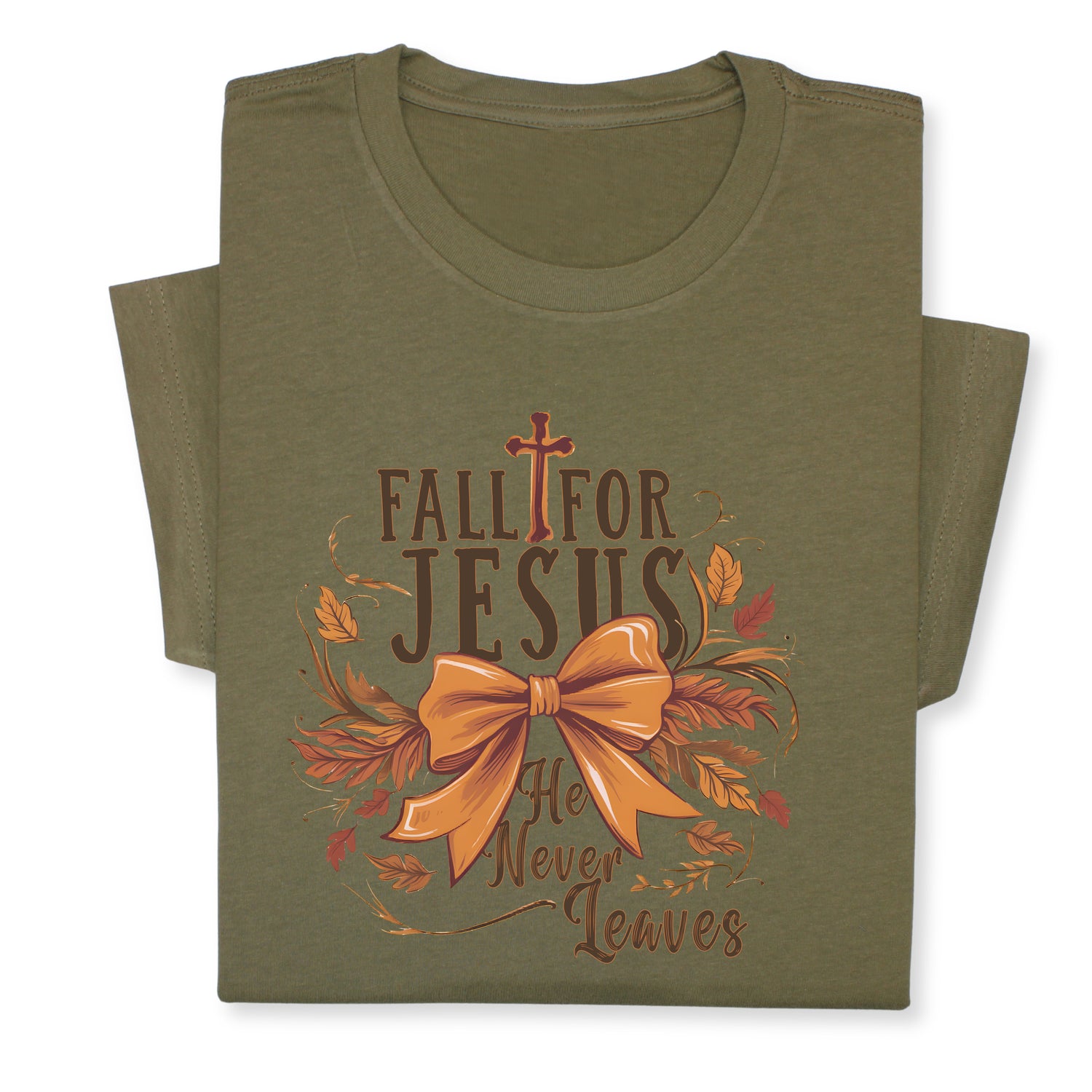 Fall for Jesus T-Shirt – Christian Autumn Tee with Bow & Leaves, Faith-Based Thanksgiving Shirt, Religious Gift for Her or Him