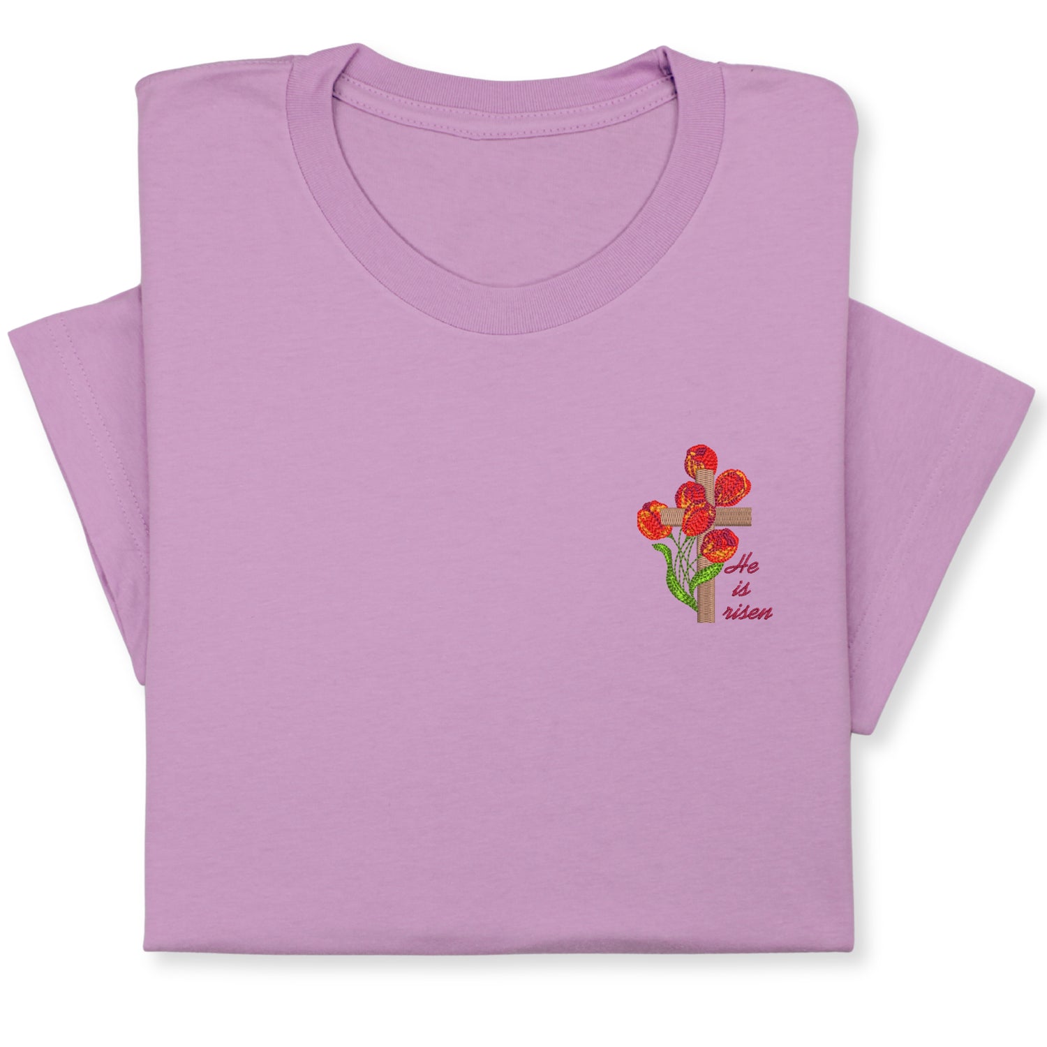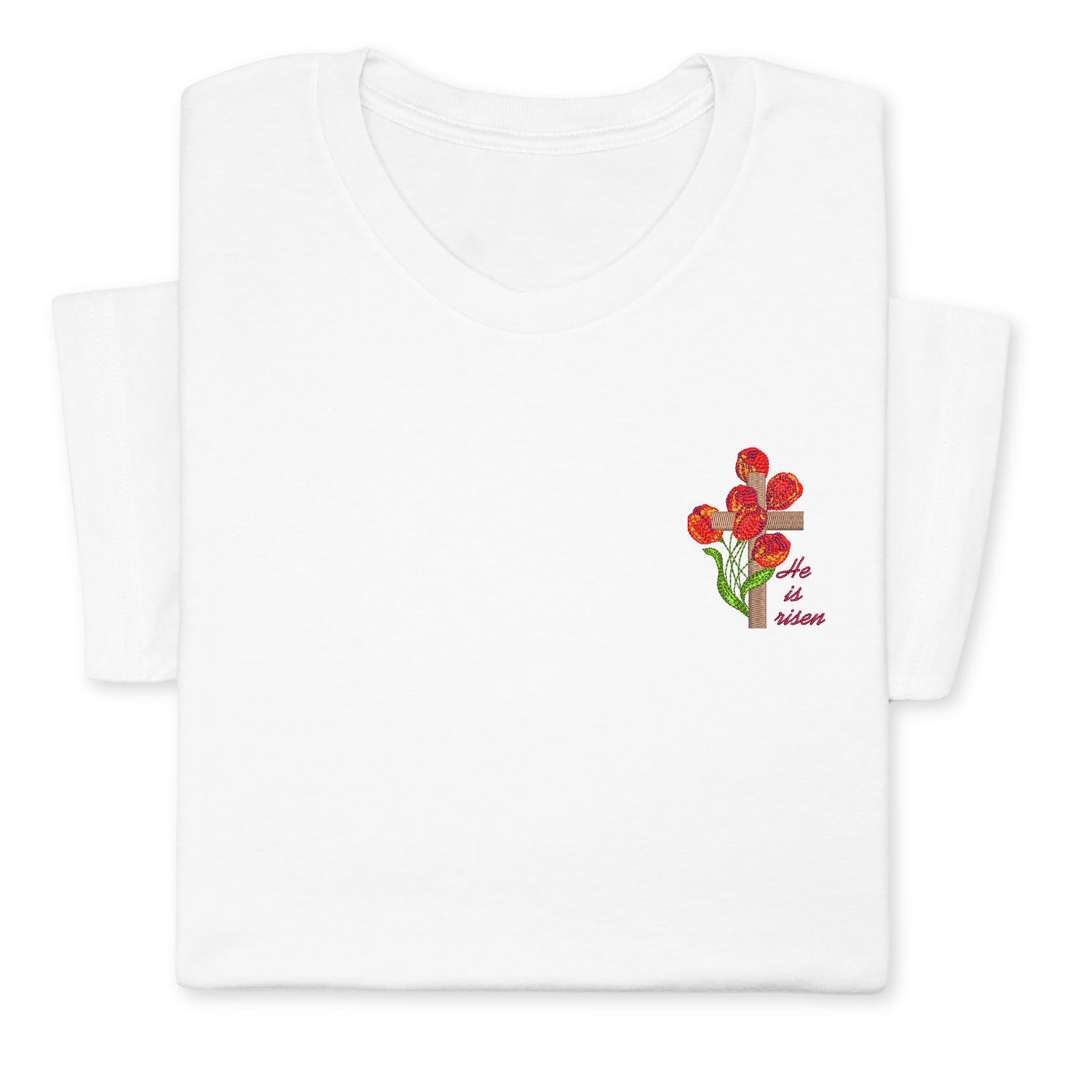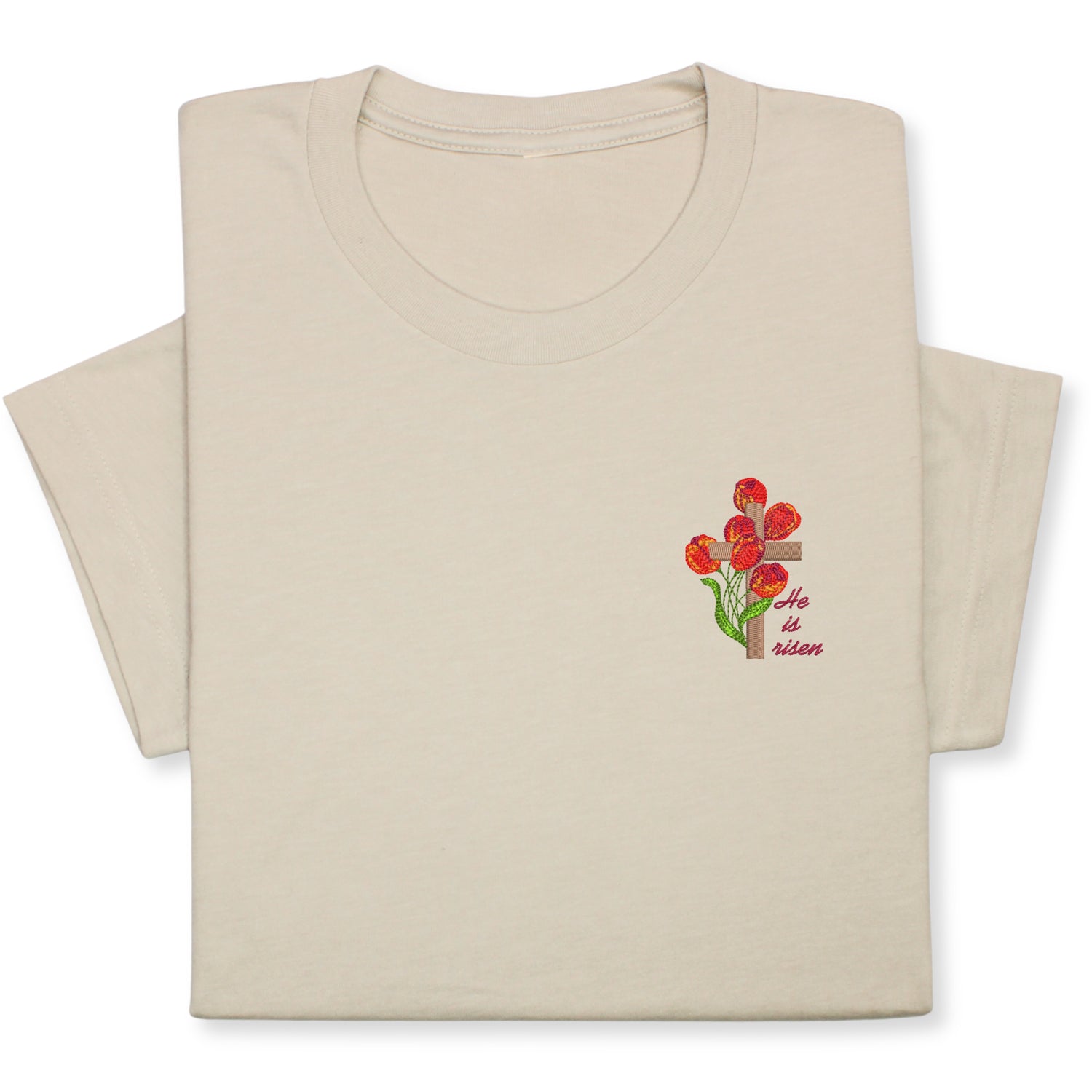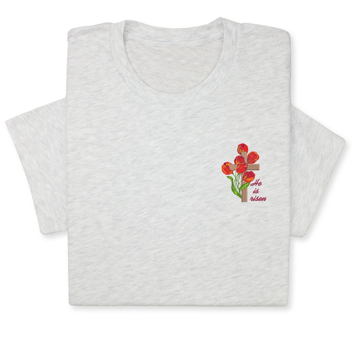 He Is Risen Embroidered T-Shirt, Christian Cross Floral Tee, Faith-Based Embroidery Shirt, Easter Gift for Her & Him, Religious Apparel
