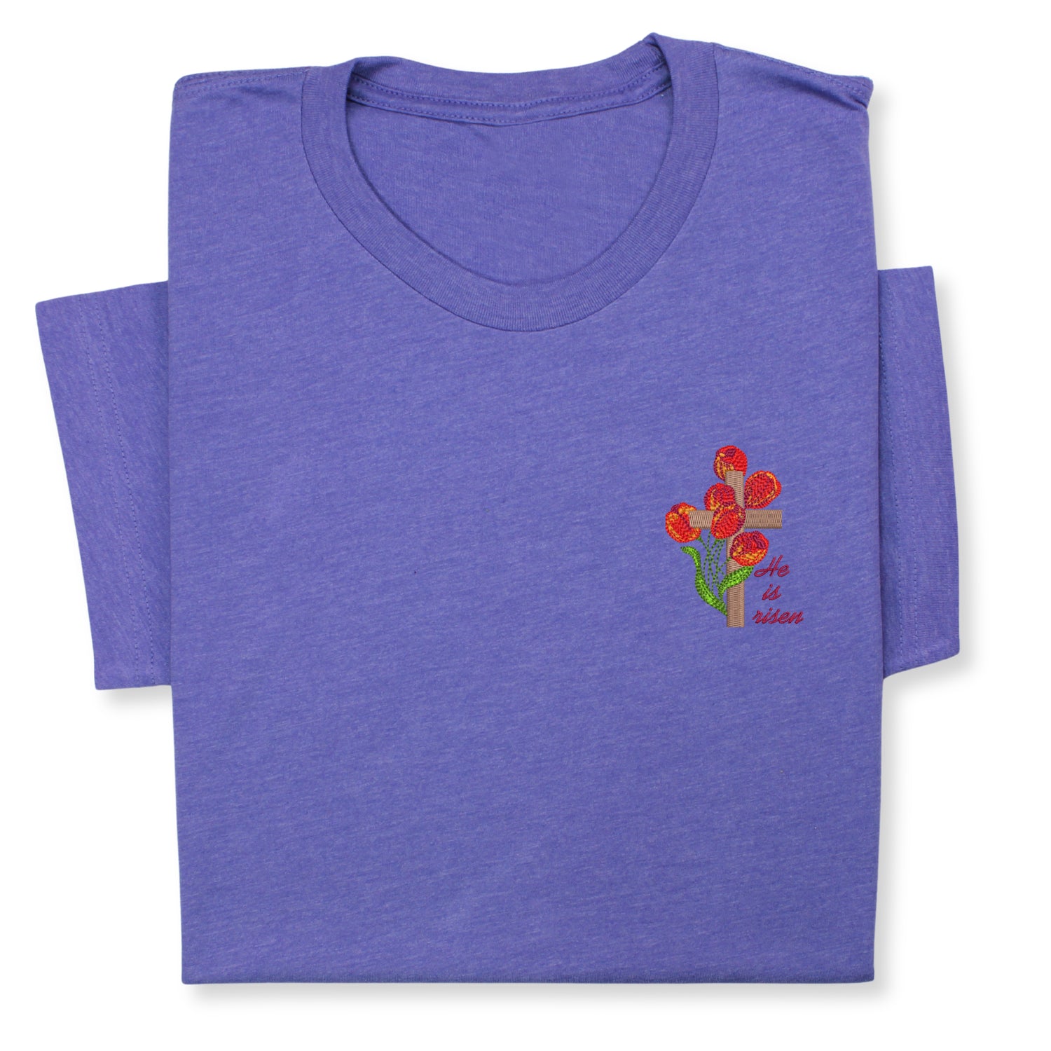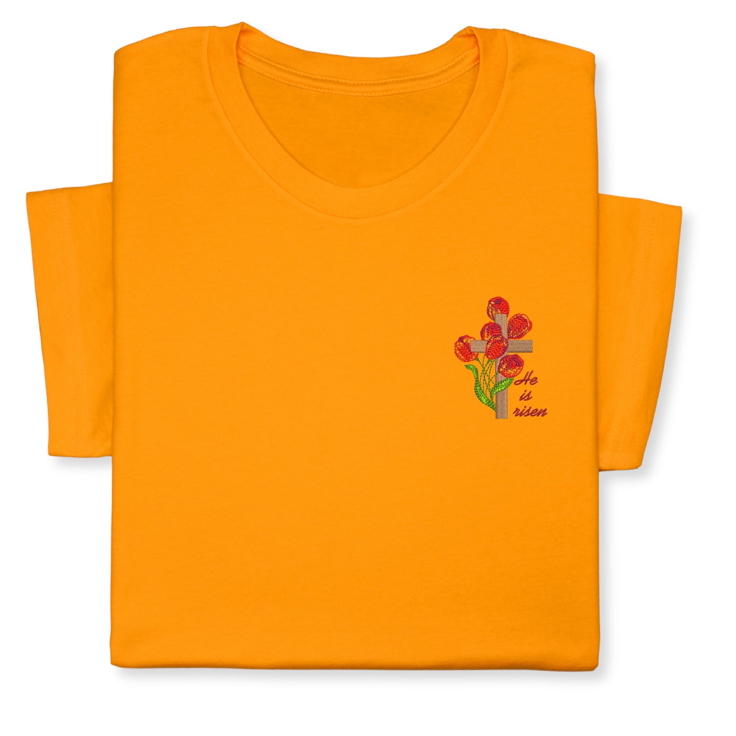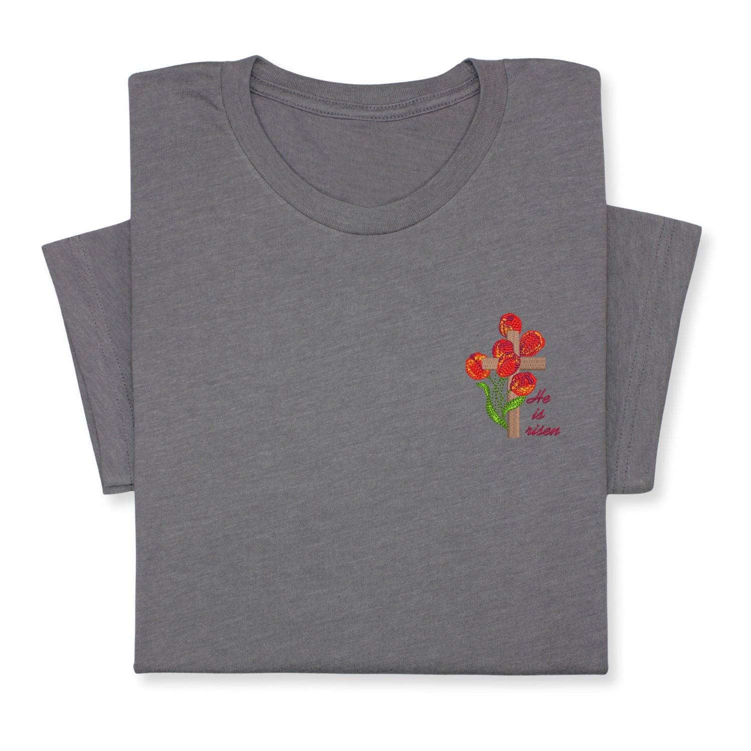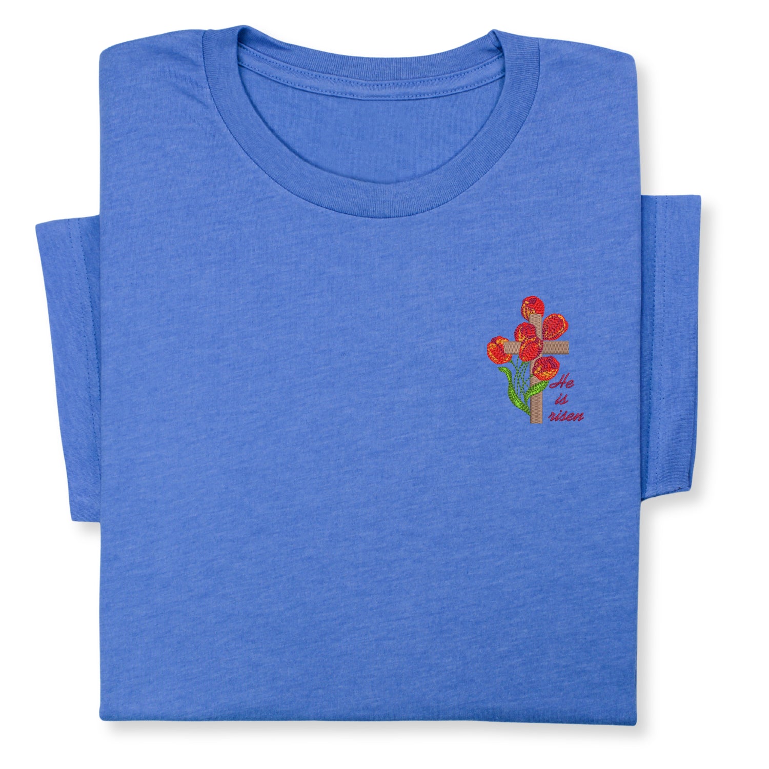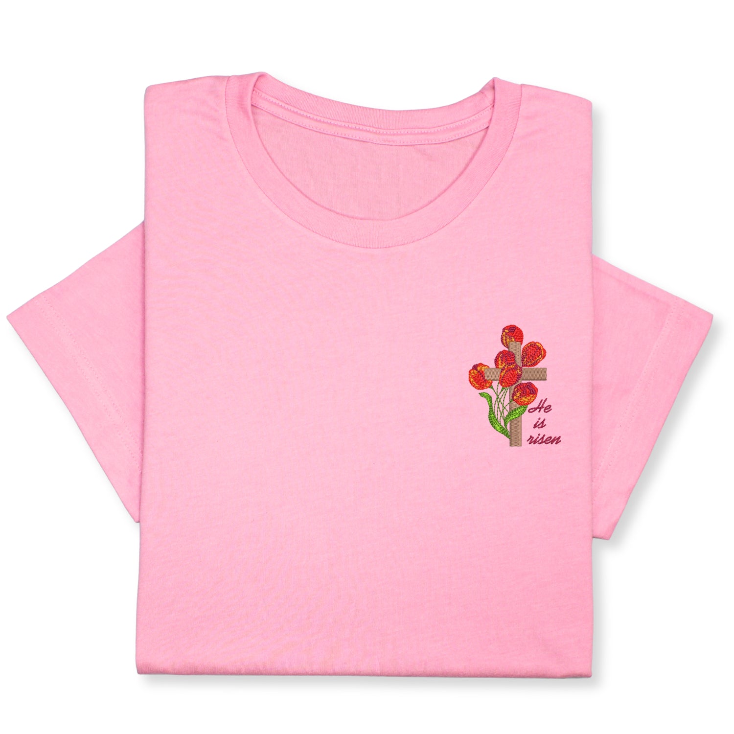 He Is Risen Embroidered T-Shirt, Christian Cross Floral Tee, Faith-Based Embroidery Shirt, Easter Gift for Her & Him, Religious Apparel